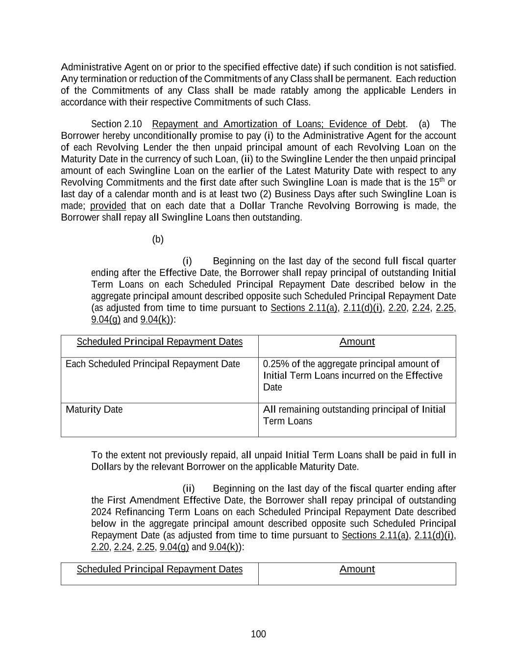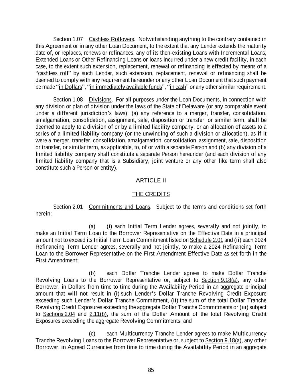 85 Section 1.07 Cashless Rollovers. Notwithstanding anything to the contrary contained in this Agreement or in any other Loan Document, to the extent that any Lender extends the maturity date of, or replaces, renews or refinances, any of its then-existing Loans with Incremental Loans, Extended Loans or Other Refinancing Loans or loans incurred under a new credit facility, in each case, to the extent such extension, replacement, renewal or refinancing is effected by means of a “cashless roll” by such Lender, such extension, replacement, renewal or refinancing shall be deemed to comply with any requirement hereunder or any other Loan Document that such payment be made “in Dollars”, “in immediately available funds”, “in cash” or any other similar requirement. Section 1.08 Divisions. For all purposes under the Loan Documents, in connection with any division or plan of division under the laws of the State of Delaware (or any comparable event under a different jurisdiction’s laws): (a) any reference to a merger, transfer, consolidation, amalgamation, consolidation, assignment, sale, disposition or transfer, or similar term, shall be deemed to apply to a division of or by a limited liability company, or an allocation of assets to a series of a limited liability company (or the unwinding of such a division or allocation), as if it were a merger, transfer, consolidation, amalgamation, consolidation, assignment, sale, disposition or transfer, or similar term, as applicable, to, of or with a separate Person and (b) any division of a limited liability company shall constitute a separate Person hereunder (and each division of any limited liability company that is a Subsidiary, joint venture or any other like term shall also constitute such a Person or entity). ARTICLE II THE CREDITS Section 2.01 Commitments and Loans. Subject to the terms and conditions set forth herein: (a) (i) each Initial Term Lender agrees, severally and not jointly, to make an Initial Term Loan to the Borrower Representative on the Effective Date in a principal amount not to exceed its Initial Term Loan Commitment listed on Schedule 2.01 and (ii) each 2024 Refinancing Term Lender agrees, severally and not jointly, to make a 2024 Refinancing Term Loan to the Borrower Representative on the First Amendment Effective Date as set forth in the First Amendment; (b) each Dollar Tranche Lender agrees to make Dollar Tranche Revolving Loans to the Borrower Representative or, subject to Section 9.18(a), any other Borrower, in Dollars from time to time during the Availability Period in an aggregate principal amount that will not result in (i) such Lender’s Dollar Tranche Revolving Credit Exposure exceeding such Lender’s Dollar Tranche Commitment, (ii) the sum of the total Dollar Tranche Revolving Credit Exposures exceeding the aggregate Dollar Tranche Commitments or (iii) subject to Sections 2.04 and 2.11(b), the sum of the Dollar Amount of the total Revolving Credit Exposures exceeding the aggregate Revolving Commitments; and (c) each Multicurrency Tranche Lender agrees to make Multicurrency Tranche Revolving Loans to the Borrower Representative or, subject to Section 9.18(a), any other Borrower, in Agreed Currencies from time to time during the Availability Period in an aggregate