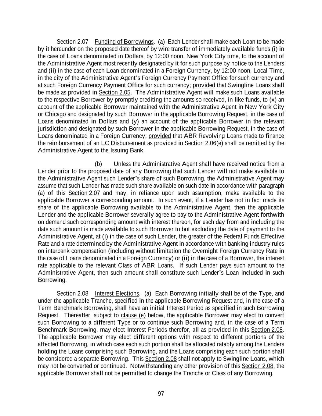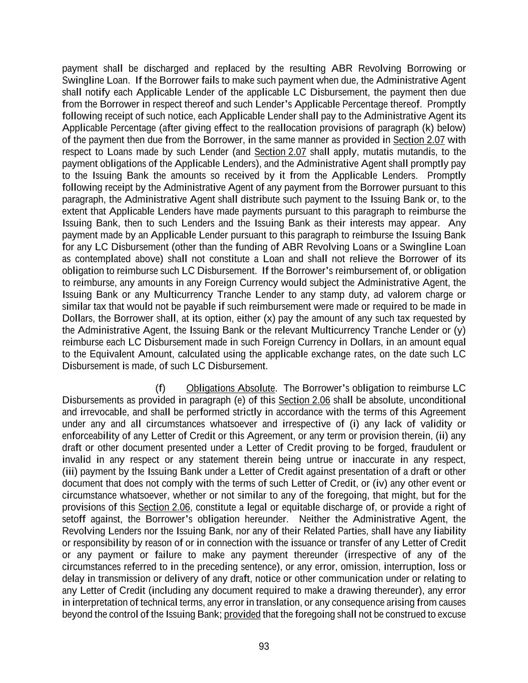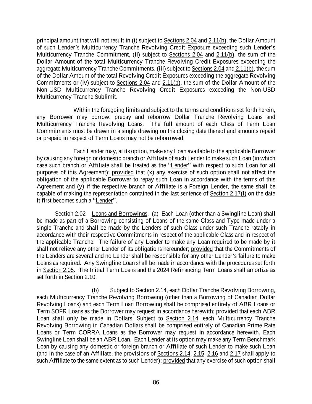 86 principal amount that will not result in (i) subject to Sections 2.04 and 2.11(b), the Dollar Amount of such Lender’s Multicurrency Tranche Revolving Credit Exposure exceeding such Lender’s Multicurrency Tranche Commitment, (ii) subject to Sections 2.04 and 2.11(b), the sum of the Dollar Amount of the total Multicurrency Tranche Revolving Credit Exposures exceeding the aggregate Multicurrency Tranche Commitments, (iii) subject to Sections 2.04 and 2.11(b), the sum of the Dollar Amount of the total Revolving Credit Exposures exceeding the aggregate Revolving Commitments or (iv) subject to Sections 2.04 and 2.11(b), the sum of the Dollar Amount of the Non-USD Multicurrency Tranche Revolving Credit Exposures exceeding the Non-USD Multicurrency Tranche Sublimit. Within the foregoing limits and subject to the terms and conditions set forth herein, any Borrower may borrow, prepay and reborrow Dollar Tranche Revolving Loans and Multicurrency Tranche Revolving Loans. The full amount of each Class of Term Loan Commitments must be drawn in a single drawing on the closing date thereof and amounts repaid or prepaid in respect of Term Loans may not be reborrowed. Each Lender may, at its option, make any Loan available to the applicable Borrower by causing any foreign or domestic branch or Affiliate of such Lender to make such Loan (in which case such branch or Affiliate shall be treated as the “Lender” with respect to such Loan for all purposes of this Agreement); provided that (x) any exercise of such option shall not affect the obligation of the applicable Borrower to repay such Loan in accordance with the terms of this Agreement and (y) if the respective branch or Affiliate is a Foreign Lender, the same shall be capable of making the representation contained in the last sentence of Section 2.17(l) on the date it first becomes such a “Lender”. Section 2.02 Loans and Borrowings. (a) Each Loan (other than a Swingline Loan) shall be made as part of a Borrowing consisting of Loans of the same Class and Type made under a single Tranche and shall be made by the Lenders of such Class under such Tranche ratably in accordance with their respective Commitments in respect of the applicable Class and in respect of the applicable Tranche. The failure of any Lender to make any Loan required to be made by it shall not relieve any other Lender of its obligations hereunder; provided that the Commitments of the Lenders are several and no Lender shall be responsible for any other Lender’s failure to make Loans as required. Any Swingline Loan shall be made in accordance with the procedures set forth in Section 2.05. The Initial Term Loans and the 2024 Refinancing Term Loans shall amortize as set forth in Section 2.10. (b) Subject to Section 2.14, each Dollar Tranche Revolving Borrowing, each Multicurrency Tranche Revolving Borrowing (other than a Borrowing of Canadian Dollar Revolving Loans) and each Term Loan Borrowing shall be comprised entirely of ABR Loans or Term SOFR Loans as the Borrower may request in accordance herewith; provided that each ABR Loan shall only be made in Dollars. Subject to Section 2.14, each Multicurrency Tranche Revolving Borrowing in Canadian Dollars shall be comprised entirely of Canadian Prime Rate Loans or Term CORRA Loans as the Borrower may request in accordance herewith. Each Swingline Loan shall be an ABR Loan. Each Lender at its option may make any Term Benchmark Loan by causing any domestic or foreign branch or Affiliate of such Lender to make such Loan (and in the case of an Affiliate, the provisions of Sections 2.14, 2.15, 2.16 and 2.17 shall apply to such Affiliate to the same extent as to such Lender); provided that any exercise of such option shall