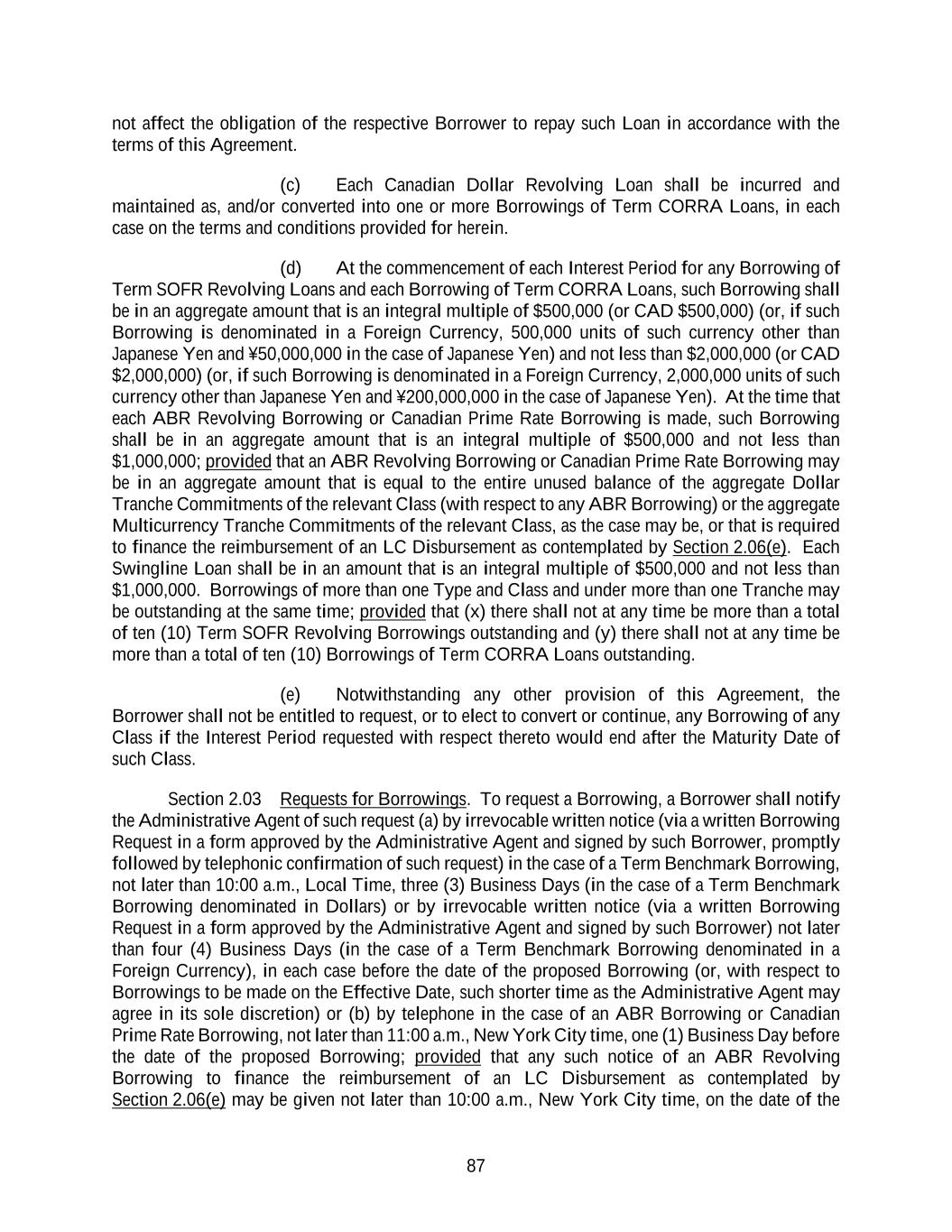 87 not affect the obligation of the respective Borrower to repay such Loan in accordance with the terms of this Agreement. (c) Each Canadian Dollar Revolving Loan shall be incurred and maintained as, and/or converted into one or more Borrowings of Term CORRA Loans, in each case on the terms and conditions provided for herein. (d) At the commencement of each Interest Period for any Borrowing of Term SOFR Revolving Loans and each Borrowing of Term CORRA Loans, such Borrowing shall be in an aggregate amount that is an integral multiple of $500,000 (or CAD $500,000) (or, if such Borrowing is denominated in a Foreign Currency, 500,000 units of such currency other than Japanese Yen and ¥50,000,000 in the case of Japanese Yen) and not less than $2,000,000 (or CAD $2,000,000) (or, if such Borrowing is denominated in a Foreign Currency, 2,000,000 units of such currency other than Japanese Yen and ¥200,000,000 in the case of Japanese Yen). At the time that each ABR Revolving Borrowing or Canadian Prime Rate Borrowing is made, such Borrowing shall be in an aggregate amount that is an integral multiple of $500,000 and not less than $1,000,000; provided that an ABR Revolving Borrowing or Canadian Prime Rate Borrowing may be in an aggregate amount that is equal to the entire unused balance of the aggregate Dollar Tranche Commitments of the relevant Class (with respect to any ABR Borrowing) or the aggregate Multicurrency Tranche Commitments of the relevant Class, as the case may be, or that is required to finance the reimbursement of an LC Disbursement as contemplated by Section 2.06(e). Each Swingline Loan shall be in an amount that is an integral multiple of $500,000 and not less than $1,000,000. Borrowings of more than one Type and Class and under more than one Tranche may be outstanding at the same time; provided that (x) there shall not at any time be more than a total of ten (10) Term SOFR Revolving Borrowings outstanding and (y) there shall not at any time be more than a total of ten (10) Borrowings of Term CORRA Loans outstanding. (e) Notwithstanding any other provision of this Agreement, the Borrower shall not be entitled to request, or to elect to convert or continue, any Borrowing of any Class if the Interest Period requested with respect thereto would end after the Maturity Date of such Class. Section 2.03 Requests for Borrowings. To request a Borrowing, a Borrower shall notify the Administrative Agent of such request (a) by irrevocable written notice (via a written Borrowing Request in a form approved by the Administrative Agent and signed by such Borrower, promptly followed by telephonic confirmation of such request) in the case of a Term Benchmark Borrowing, not later than 10:00 a.m., Local Time, three (3) Business Days (in the case of a Term Benchmark Borrowing denominated in Dollars) or by irrevocable written notice (via a written Borrowing Request in a form approved by the Administrative Agent and signed by such Borrower) not later than four (4) Business Days (in the case of a Term Benchmark Borrowing denominated in a Foreign Currency), in each case before the date of the proposed Borrowing (or, with respect to Borrowings to be made on the Effective Date, such shorter time as the Administrative Agent may agree in its sole discretion) or (b) by telephone in the case of an ABR Borrowing or Canadian Prime Rate Borrowing, not later than 11:00 a.m., New York City time, one (1) Business Day before the date of the proposed Borrowing; provided that any such notice of an ABR Revolving Borrowing to finance the reimbursement of an LC Disbursement as contemplated by Section 2.06(e) may be given not later than 10:00 a.m., New York City time, on the date of the