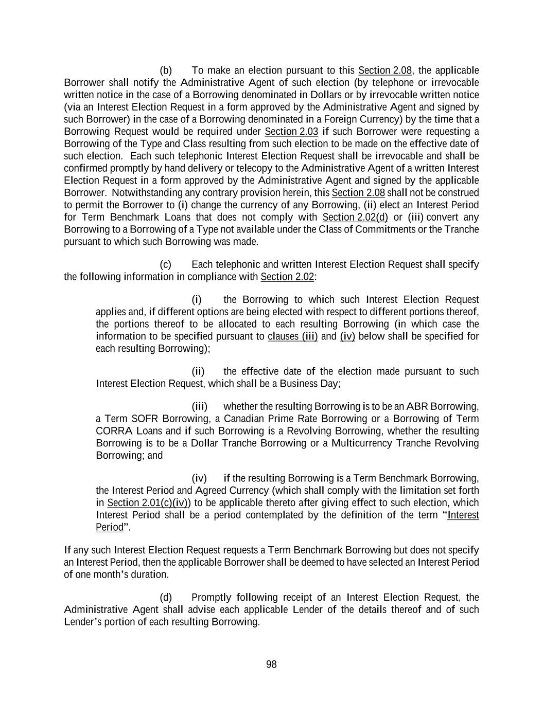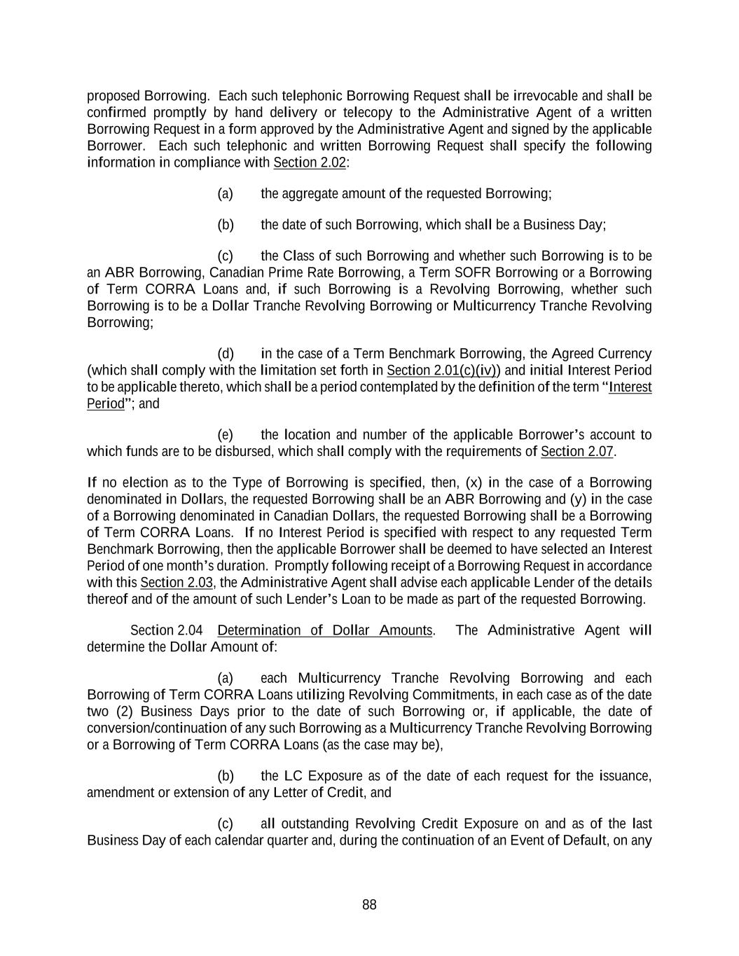 88 proposed Borrowing. Each such telephonic Borrowing Request shall be irrevocable and shall be confirmed promptly by hand delivery or telecopy to the Administrative Agent of a written Borrowing Request in a form approved by the Administrative Agent and signed by the applicable Borrower. Each such telephonic and written Borrowing Request shall specify the following information in compliance with Section 2.02: (a) the aggregate amount of the requested Borrowing; (b) the date of such Borrowing, which shall be a Business Day; (c) the Class of such Borrowing and whether such Borrowing is to be an ABR Borrowing, Canadian Prime Rate Borrowing, a Term SOFR Borrowing or a Borrowing of Term CORRA Loans and, if such Borrowing is a Revolving Borrowing, whether such Borrowing is to be a Dollar Tranche Revolving Borrowing or Multicurrency Tranche Revolving Borrowing; (d) in the case of a Term Benchmark Borrowing, the Agreed Currency (which shall comply with the limitation set forth in Section 2.01(c)(iv)) and initial Interest Period to be applicable thereto, which shall be a period contemplated by the definition of the term “Interest Period”; and (e) the location and number of the applicable Borrower’s account to which funds are to be disbursed, which shall comply with the requirements of Section 2.07. If no election as to the Type of Borrowing is specified, then, (x) in the case of a Borrowing denominated in Dollars, the requested Borrowing shall be an ABR Borrowing and (y) in the case of a Borrowing denominated in Canadian Dollars, the requested Borrowing shall be a Borrowing of Term CORRA Loans. If no Interest Period is specified with respect to any requested Term Benchmark Borrowing, then the applicable Borrower shall be deemed to have selected an Interest Period of one month’s duration. Promptly following receipt of a Borrowing Request in accordance with this Section 2.03, the Administrative Agent shall advise each applicable Lender of the details thereof and of the amount of such Lender’s Loan to be made as part of the requested Borrowing. Section 2.04 Determination of Dollar Amounts. The Administrative Agent will determine the Dollar Amount of: (a) each Multicurrency Tranche Revolving Borrowing and each Borrowing of Term CORRA Loans utilizing Revolving Commitments, in each case as of the date two (2) Business Days prior to the date of such Borrowing or, if applicable, the date of conversion/continuation of any such Borrowing as a Multicurrency Tranche Revolving Borrowing or a Borrowing of Term CORRA Loans (as the case may be), (b) the LC Exposure as of the date of each request for the issuance, amendment or extension of any Letter of Credit, and (c) all outstanding Revolving Credit Exposure on and as of the last Business Day of each calendar quarter and, during the continuation of an Event of Default, on any