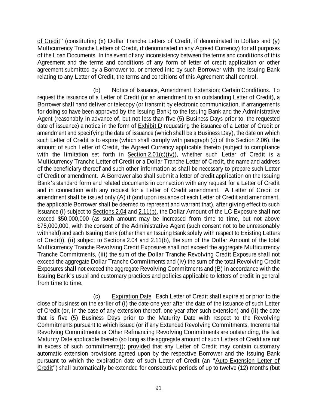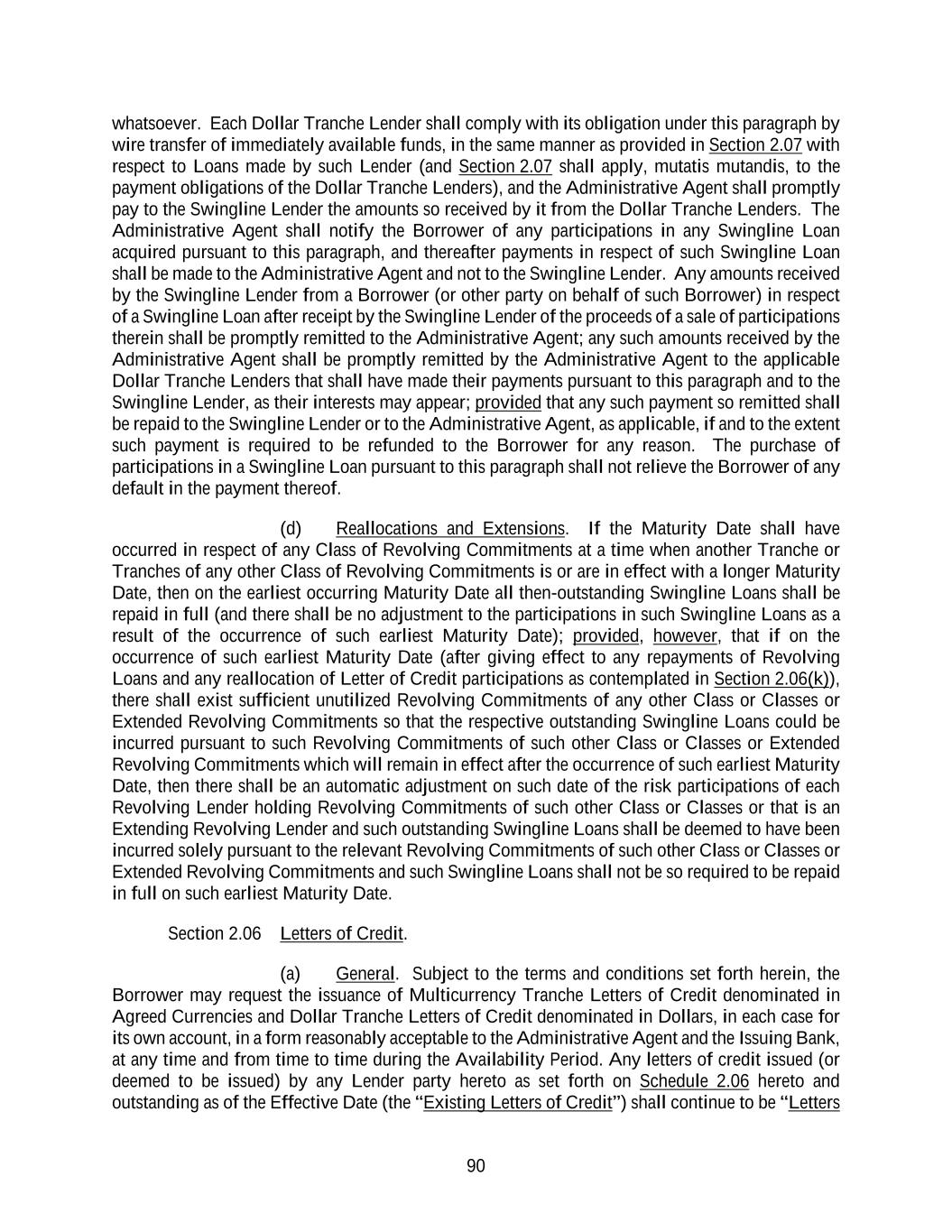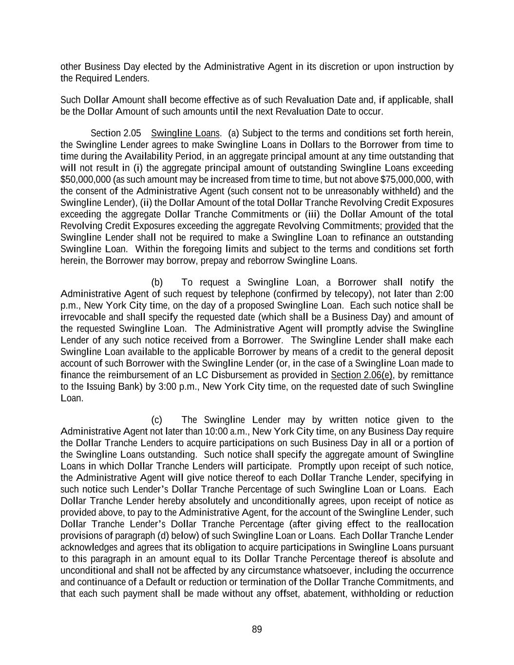 89 other Business Day elected by the Administrative Agent in its discretion or upon instruction by the Required Lenders. Such Dollar Amount shall become effective as of such Revaluation Date and, if applicable, shall be the Dollar Amount of such amounts until the next Revaluation Date to occur. Section 2.05 Swingline Loans. (a) Subject to the terms and conditions set forth herein, the Swingline Lender agrees to make Swingline Loans in Dollars to the Borrower from time to time during the Availability Period, in an aggregate principal amount at any time outstanding that will not result in (i) the aggregate principal amount of outstanding Swingline Loans exceeding $50,000,000 (as such amount may be increased from time to time, but not above $75,000,000, with the consent of the Administrative Agent (such consent not to be unreasonably withheld) and the Swingline Lender), (ii) the Dollar Amount of the total Dollar Tranche Revolving Credit Exposures exceeding the aggregate Dollar Tranche Commitments or (iii) the Dollar Amount of the total Revolving Credit Exposures exceeding the aggregate Revolving Commitments; provided that the Swingline Lender shall not be required to make a Swingline Loan to refinance an outstanding Swingline Loan. Within the foregoing limits and subject to the terms and conditions set forth herein, the Borrower may borrow, prepay and reborrow Swingline Loans. (b) To request a Swingline Loan, a Borrower shall notify the Administrative Agent of such request by telephone (confirmed by telecopy), not later than 2:00 p.m., New York City time, on the day of a proposed Swingline Loan. Each such notice shall be irrevocable and shall specify the requested date (which shall be a Business Day) and amount of the requested Swingline Loan. The Administrative Agent will promptly advise the Swingline Lender of any such notice received from a Borrower. The Swingline Lender shall make each Swingline Loan available to the applicable Borrower by means of a credit to the general deposit account of such Borrower with the Swingline Lender (or, in the case of a Swingline Loan made to finance the reimbursement of an LC Disbursement as provided in Section 2.06(e), by remittance to the Issuing Bank) by 3:00 p.m., New York City time, on the requested date of such Swingline Loan. (c) The Swingline Lender may by written notice given to the Administrative Agent not later than 10:00 a.m., New York City time, on any Business Day require the Dollar Tranche Lenders to acquire participations on such Business Day in all or a portion of the Swingline Loans outstanding. Such notice shall specify the aggregate amount of Swingline Loans in which Dollar Tranche Lenders will participate. Promptly upon receipt of such notice, the Administrative Agent will give notice thereof to each Dollar Tranche Lender, specifying in such notice such Lender’s Dollar Tranche Percentage of such Swingline Loan or Loans. Each Dollar Tranche Lender hereby absolutely and unconditionally agrees, upon receipt of notice as provided above, to pay to the Administrative Agent, for the account of the Swingline Lender, such Dollar Tranche Lender’s Dollar Tranche Percentage (after giving effect to the reallocation provisions of paragraph (d) below) of such Swingline Loan or Loans. Each Dollar Tranche Lender acknowledges and agrees that its obligation to acquire participations in Swingline Loans pursuant to this paragraph in an amount equal to its Dollar Tranche Percentage thereof is absolute and unconditional and shall not be affected by any circumstance whatsoever, including the occurrence and continuance of a Default or reduction or termination of the Dollar Tranche Commitments, and that each such payment shall be made without any offset, abatement, withholding or reduction