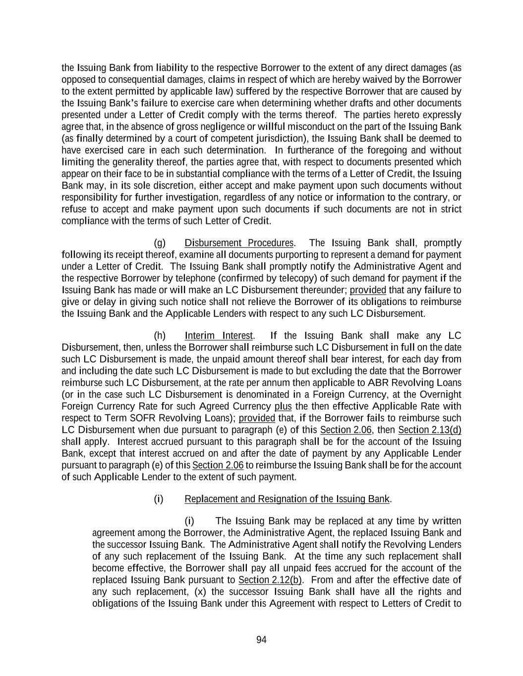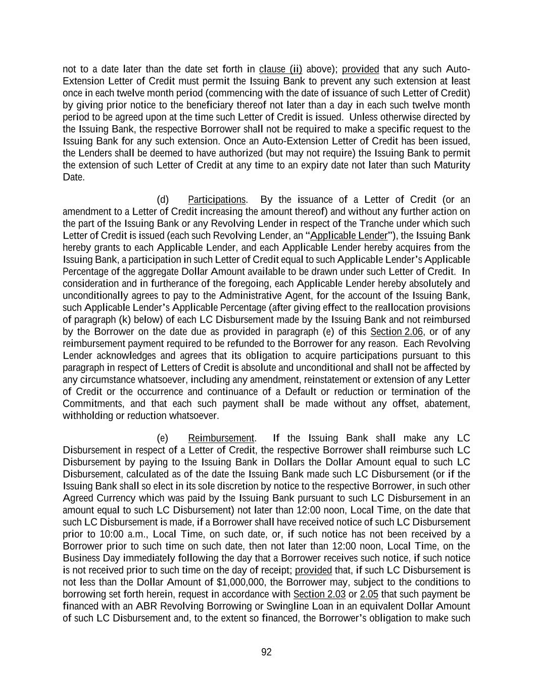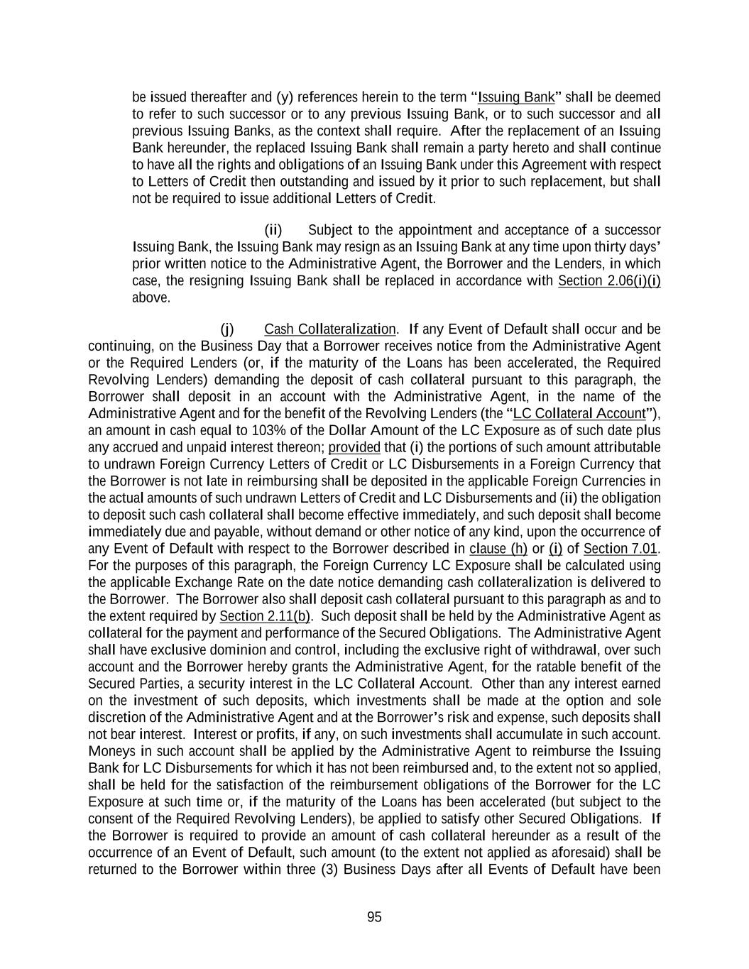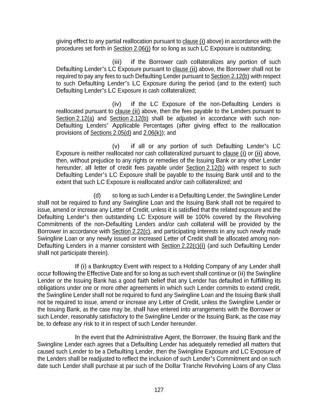 127 giving effect to any partial reallocation pursuant to clause (i) above) in accordance with the procedures set forth in Section 2.06(j) for so long as such LC Exposure is outstanding; (iii) if the Borrower cash collateralizes any portion of such Defaulting Lender’s LC Exposure pursuant to clause (ii) above, the Borrower shall not be required to pay any fees to such Defaulting Lender pursuant to Section 2.12(b) with respect to such Defaulting Lender’s LC Exposure during the period (and to the extent) such Defaulting Lender’s LC Exposure is cash collateralized; (iv) if the LC Exposure of the non-Defaulting Lenders is reallocated pursuant to clause (ii) above, then the fees payable to the Lenders pursuant to Section 2.12(a) and Section 2.12(b) shall be adjusted in accordance with such non- Defaulting Lenders’ Applicable Percentages (after giving effect to the reallocation provisions of Sections 2.05(d) and 2.06(k)); and (v) if all or any portion of such Defaulting Lender’s LC Exposure is neither reallocated nor cash collateralized pursuant to clause (i) or (ii) above, then, without prejudice to any rights or remedies of the Issuing Bank or any other Lender hereunder, all letter of credit fees payable under Section 2.12(b) with respect to such Defaulting Lender’s LC Exposure shall be payable to the Issuing Bank until and to the extent that such LC Exposure is reallocated and/or cash collateralized; and (d) so long as such Lender is a Defaulting Lender, the Swingline Lender shall not be required to fund any Swingline Loan and the Issuing Bank shall not be required to issue, amend or increase any Letter of Credit, unless it is satisfied that the related exposure and the Defaulting Lender’s then outstanding LC Exposure will be 100% covered by the Revolving Commitments of the non-Defaulting Lenders and/or cash collateral will be provided by the Borrower in accordance with Section 2.22(c), and participating interests in any such newly made Swingline Loan or any newly issued or increased Letter of Credit shall be allocated among non- Defaulting Lenders in a manner consistent with Section 2.22(c)(i) (and such Defaulting Lender shall not participate therein). If (i) a Bankruptcy Event with respect to a Holding Company of any Lender shall occur following the Effective Date and for so long as such event shall continue or (ii) the Swingline Lender or the Issuing Bank has a good faith belief that any Lender has defaulted in fulfilling its obligations under one or more other agreements in which such Lender commits to extend credit, the Swingline Lender shall not be required to fund any Swingline Loan and the Issuing Bank shall not be required to issue, amend or increase any Letter of Credit, unless the Swingline Lender or the Issuing Bank, as the case may be, shall have entered into arrangements with the Borrower or such Lender, reasonably satisfactory to the Swingline Lender or the Issuing Bank, as the case may be, to defease any risk to it in respect of such Lender hereunder. In the event that the Administrative Agent, the Borrower, the Issuing Bank and the Swingline Lender each agrees that a Defaulting Lender has adequately remedied all matters that caused such Lender to be a Defaulting Lender, then the Swingline Exposure and LC Exposure of the Lenders shall be readjusted to reflect the inclusion of such Lender’s Commitment and on such date such Lender shall purchase at par such of the Dollar Tranche Revolving Loans of any Class