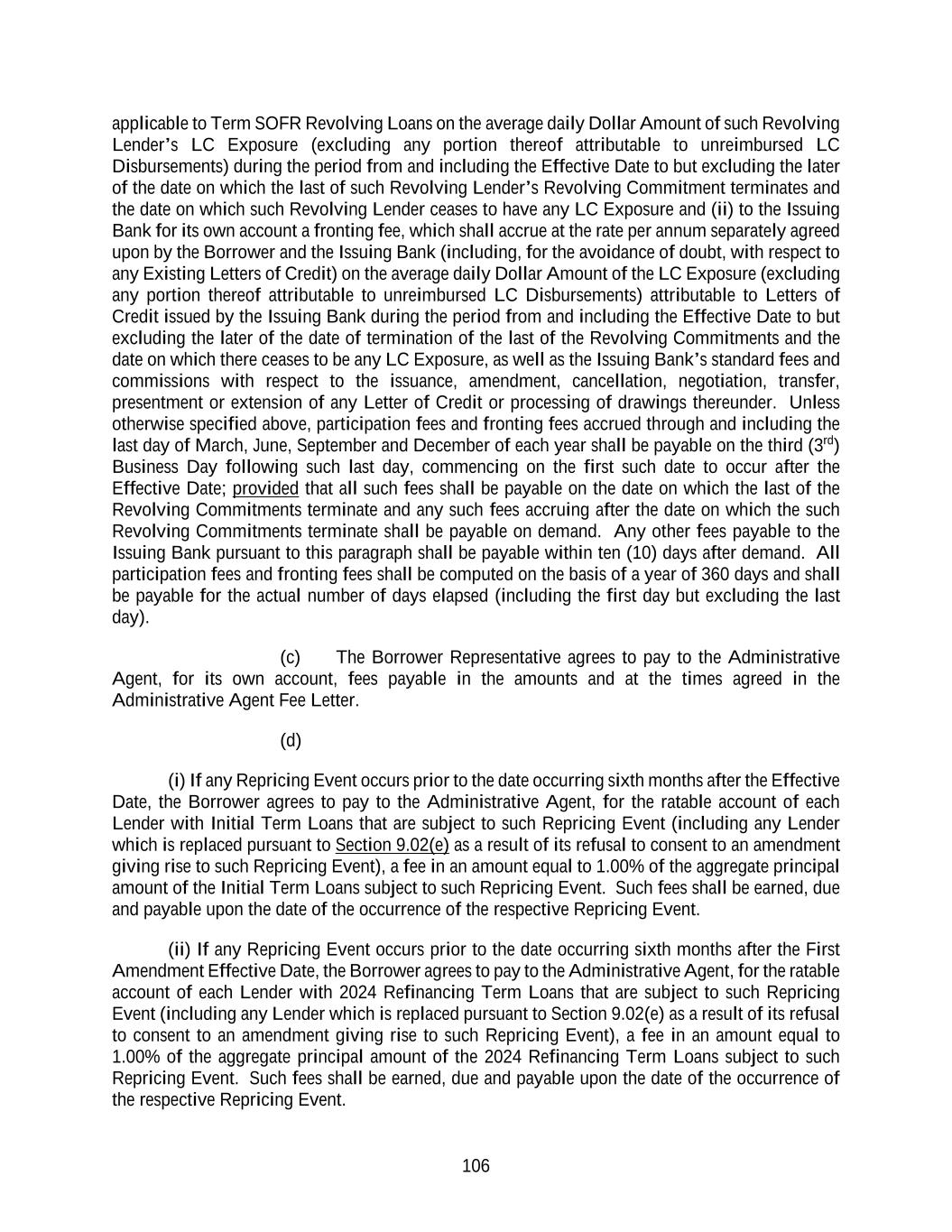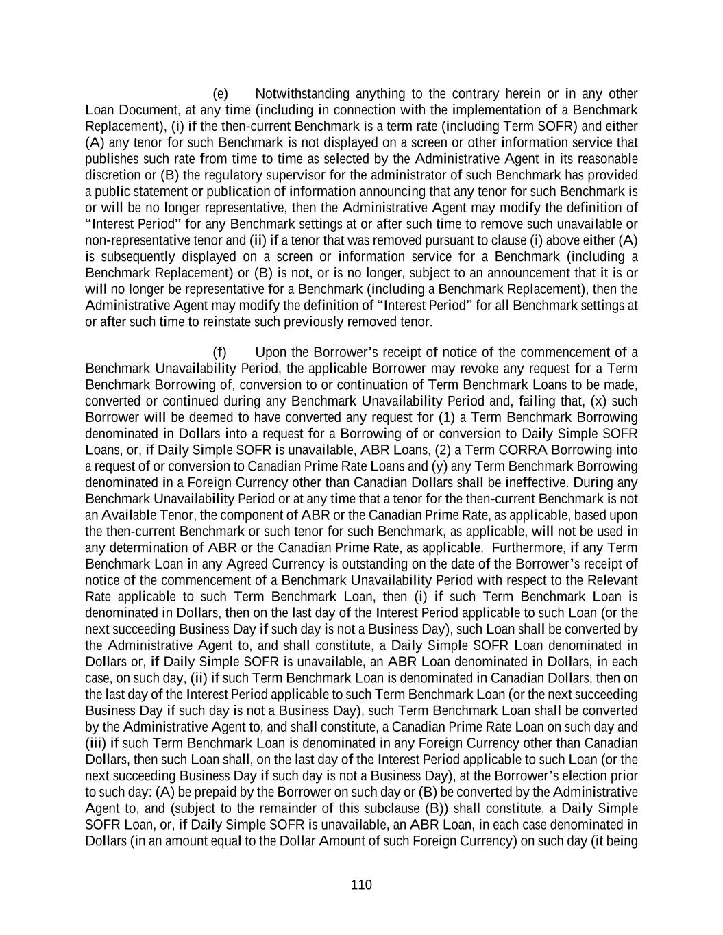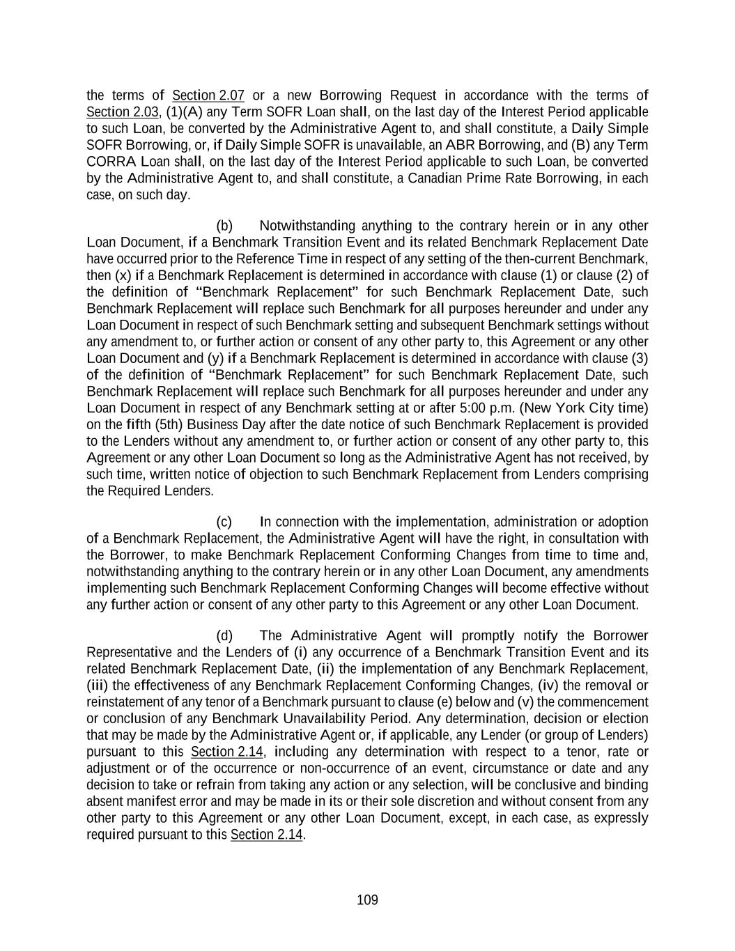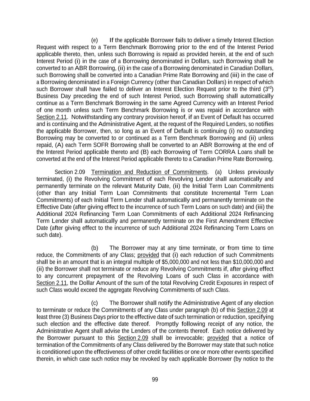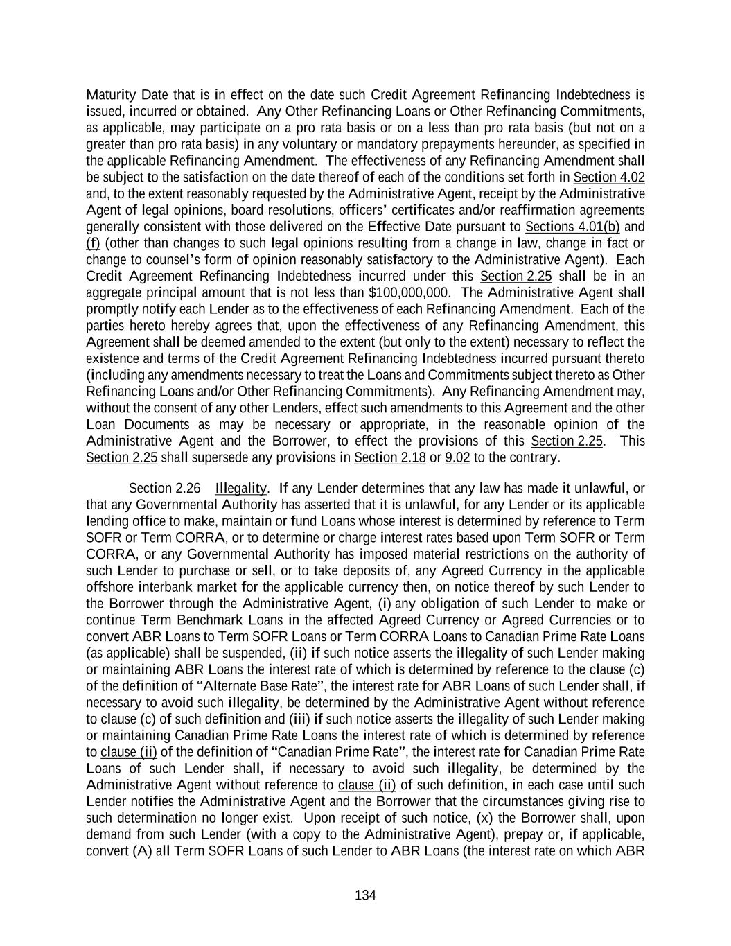 134 Maturity Date that is in effect on the date such Credit Agreement Refinancing Indebtedness is issued, incurred or obtained. Any Other Refinancing Loans or Other Refinancing Commitments, as applicable, may participate on a pro rata basis or on a less than pro rata basis (but not on a greater than pro rata basis) in any voluntary or mandatory prepayments hereunder, as specified in the applicable Refinancing Amendment. The effectiveness of any Refinancing Amendment shall be subject to the satisfaction on the date thereof of each of the conditions set forth in Section 4.02 and, to the extent reasonably requested by the Administrative Agent, receipt by the Administrative Agent of legal opinions, board resolutions, officers’ certificates and/or reaffirmation agreements generally consistent with those delivered on the Effective Date pursuant to Sections 4.01(b) and (f) (other than changes to such legal opinions resulting from a change in law, change in fact or change to counsel’s form of opinion reasonably satisfactory to the Administrative Agent). Each Credit Agreement Refinancing Indebtedness incurred under this Section 2.25 shall be in an aggregate principal amount that is not less than $100,000,000. The Administrative Agent shall promptly notify each Lender as to the effectiveness of each Refinancing Amendment. Each of the parties hereto hereby agrees that, upon the effectiveness of any Refinancing Amendment, this Agreement shall be deemed amended to the extent (but only to the extent) necessary to reflect the existence and terms of the Credit Agreement Refinancing Indebtedness incurred pursuant thereto (including any amendments necessary to treat the Loans and Commitments subject thereto as Other Refinancing Loans and/or Other Refinancing Commitments). Any Refinancing Amendment may, without the consent of any other Lenders, effect such amendments to this Agreement and the other Loan Documents as may be necessary or appropriate, in the reasonable opinion of the Administrative Agent and the Borrower, to effect the provisions of this Section 2.25. This Section 2.25 shall supersede any provisions in Section 2.18 or 9.02 to the contrary. Section 2.26 Illegality. If any Lender determines that any law has made it unlawful, or that any Governmental Authority has asserted that it is unlawful, for any Lender or its applicable lending office to make, maintain or fund Loans whose interest is determined by reference to Term SOFR or Term CORRA, or to determine or charge interest rates based upon Term SOFR or Term CORRA, or any Governmental Authority has imposed material restrictions on the authority of such Lender to purchase or sell, or to take deposits of, any Agreed Currency in the applicable offshore interbank market for the applicable currency then, on notice thereof by such Lender to the Borrower through the Administrative Agent, (i) any obligation of such Lender to make or continue Term Benchmark Loans in the affected Agreed Currency or Agreed Currencies or to convert ABR Loans to Term SOFR Loans or Term CORRA Loans to Canadian Prime Rate Loans (as applicable) shall be suspended, (ii) if such notice asserts the illegality of such Lender making or maintaining ABR Loans the interest rate of which is determined by reference to the clause (c) of the definition of “Alternate Base Rate”, the interest rate for ABR Loans of such Lender shall, if necessary to avoid such illegality, be determined by the Administrative Agent without reference to clause (c) of such definition and (iii) if such notice asserts the illegality of such Lender making or maintaining Canadian Prime Rate Loans the interest rate of which is determined by reference to clause (ii) of the definition of “Canadian Prime Rate”, the interest rate for Canadian Prime Rate Loans of such Lender shall, if necessary to avoid such illegality, be determined by the Administrative Agent without reference to clause (ii) of such definition, in each case until such Lender notifies the Administrative Agent and the Borrower that the circumstances giving rise to such determination no longer exist. Upon receipt of such notice, (x) the Borrower shall, upon demand from such Lender (with a copy to the Administrative Agent), prepay or, if applicable, convert (A) all Term SOFR Loans of such Lender to ABR Loans (the interest rate on which ABR