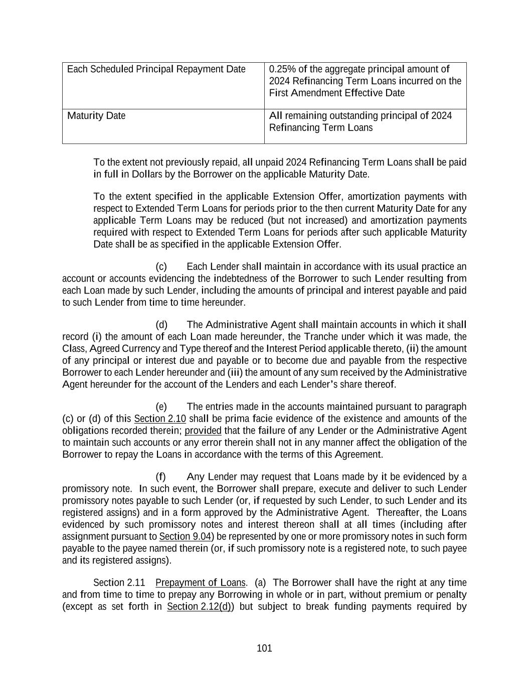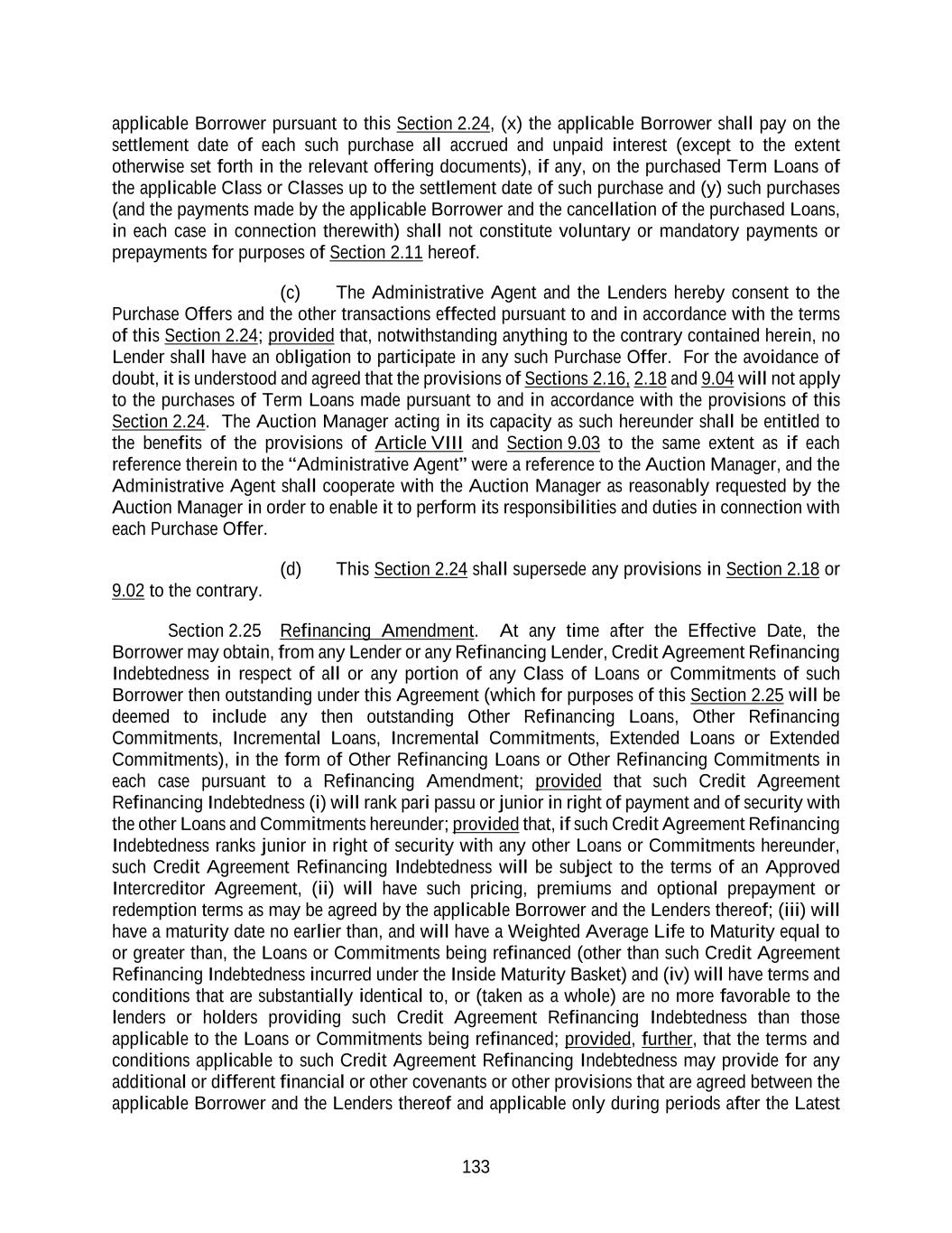 133 applicable Borrower pursuant to this Section 2.24, (x) the applicable Borrower shall pay on the settlement date of each such purchase all accrued and unpaid interest (except to the extent otherwise set forth in the relevant offering documents), if any, on the purchased Term Loans of the applicable Class or Classes up to the settlement date of such purchase and (y) such purchases (and the payments made by the applicable Borrower and the cancellation of the purchased Loans, in each case in connection therewith) shall not constitute voluntary or mandatory payments or prepayments for purposes of Section 2.11 hereof. (c) The Administrative Agent and the Lenders hereby consent to the Purchase Offers and the other transactions effected pursuant to and in accordance with the terms of this Section 2.24; provided that, notwithstanding anything to the contrary contained herein, no Lender shall have an obligation to participate in any such Purchase Offer. For the avoidance of doubt, it is understood and agreed that the provisions of Sections 2.16, 2.18 and 9.04 will not apply to the purchases of Term Loans made pursuant to and in accordance with the provisions of this Section 2.24. The Auction Manager acting in its capacity as such hereunder shall be entitled to the benefits of the provisions of Article VIII and Section 9.03 to the same extent as if each reference therein to the “Administrative Agent” were a reference to the Auction Manager, and the Administrative Agent shall cooperate with the Auction Manager as reasonably requested by the Auction Manager in order to enable it to perform its responsibilities and duties in connection with each Purchase Offer. (d) This Section 2.24 shall supersede any provisions in Section 2.18 or 9.02 to the contrary. Section 2.25 Refinancing Amendment. At any time after the Effective Date, the Borrower may obtain, from any Lender or any Refinancing Lender, Credit Agreement Refinancing Indebtedness in respect of all or any portion of any Class of Loans or Commitments of such Borrower then outstanding under this Agreement (which for purposes of this Section 2.25 will be deemed to include any then outstanding Other Refinancing Loans, Other Refinancing Commitments, Incremental Loans, Incremental Commitments, Extended Loans or Extended Commitments), in the form of Other Refinancing Loans or Other Refinancing Commitments in each case pursuant to a Refinancing Amendment; provided that such Credit Agreement Refinancing Indebtedness (i) will rank pari passu or junior in right of payment and of security with the other Loans and Commitments hereunder; provided that, if such Credit Agreement Refinancing Indebtedness ranks junior in right of security with any other Loans or Commitments hereunder, such Credit Agreement Refinancing Indebtedness will be subject to the terms of an Approved Intercreditor Agreement, (ii) will have such pricing, premiums and optional prepayment or redemption terms as may be agreed by the applicable Borrower and the Lenders thereof; (iii) will have a maturity date no earlier than, and will have a Weighted Average Life to Maturity equal to or greater than, the Loans or Commitments being refinanced (other than such Credit Agreement Refinancing Indebtedness incurred under the Inside Maturity Basket) and (iv) will have terms and conditions that are substantially identical to, or (taken as a whole) are no more favorable to the lenders or holders providing such Credit Agreement Refinancing Indebtedness than those applicable to the Loans or Commitments being refinanced; provided, further, that the terms and conditions applicable to such Credit Agreement Refinancing Indebtedness may provide for any additional or different financial or other covenants or other provisions that are agreed between the applicable Borrower and the Lenders thereof and applicable only during periods after the Latest