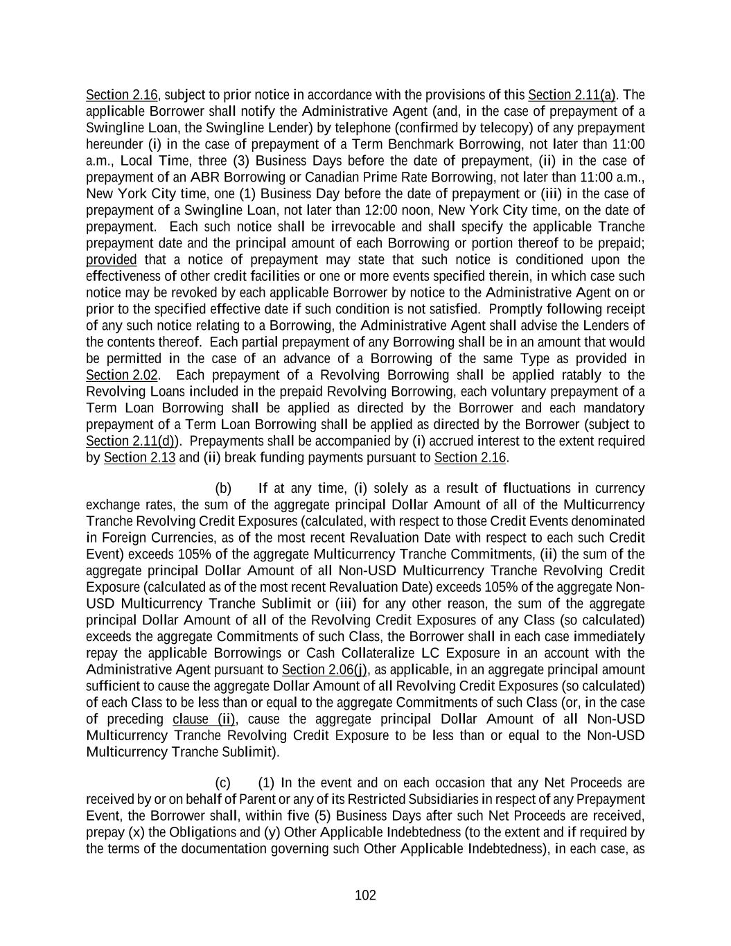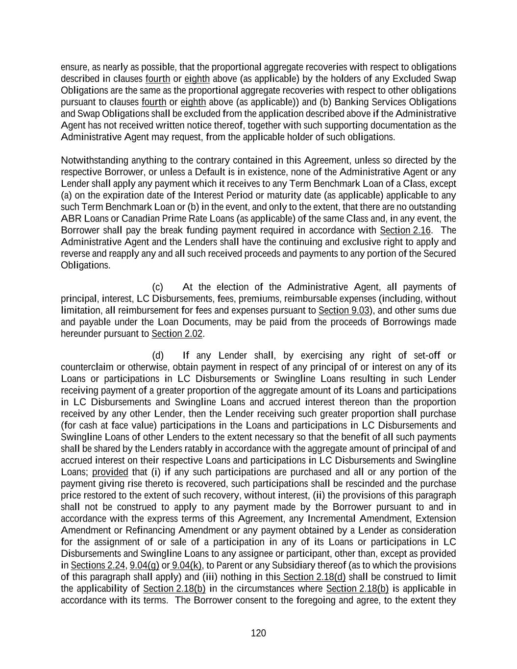 120 ensure, as nearly as possible, that the proportional aggregate recoveries with respect to obligations described in clauses fourth or eighth above (as applicable) by the holders of any Excluded Swap Obligations are the same as the proportional aggregate recoveries with respect to other obligations pursuant to clauses fourth or eighth above (as applicable)) and (b) Banking Services Obligations and Swap Obligations shall be excluded from the application described above if the Administrative Agent has not received written notice thereof, together with such supporting documentation as the Administrative Agent may request, from the applicable holder of such obligations. Notwithstanding anything to the contrary contained in this Agreement, unless so directed by the respective Borrower, or unless a Default is in existence, none of the Administrative Agent or any Lender shall apply any payment which it receives to any Term Benchmark Loan of a Class, except (a) on the expiration date of the Interest Period or maturity date (as applicable) applicable to any such Term Benchmark Loan or (b) in the event, and only to the extent, that there are no outstanding ABR Loans or Canadian Prime Rate Loans (as applicable) of the same Class and, in any event, the Borrower shall pay the break funding payment required in accordance with Section 2.16. The Administrative Agent and the Lenders shall have the continuing and exclusive right to apply and reverse and reapply any and all such received proceeds and payments to any portion of the Secured Obligations. (c) At the election of the Administrative Agent, all payments of principal, interest, LC Disbursements, fees, premiums, reimbursable expenses (including, without limitation, all reimbursement for fees and expenses pursuant to Section 9.03), and other sums due and payable under the Loan Documents, may be paid from the proceeds of Borrowings made hereunder pursuant to Section 2.02. (d) If any Lender shall, by exercising any right of set-off or counterclaim or otherwise, obtain payment in respect of any principal of or interest on any of its Loans or participations in LC Disbursements or Swingline Loans resulting in such Lender receiving payment of a greater proportion of the aggregate amount of its Loans and participations in LC Disbursements and Swingline Loans and accrued interest thereon than the proportion received by any other Lender, then the Lender receiving such greater proportion shall purchase (for cash at face value) participations in the Loans and participations in LC Disbursements and Swingline Loans of other Lenders to the extent necessary so that the benefit of all such payments shall be shared by the Lenders ratably in accordance with the aggregate amount of principal of and accrued interest on their respective Loans and participations in LC Disbursements and Swingline Loans; provided that (i) if any such participations are purchased and all or any portion of the payment giving rise thereto is recovered, such participations shall be rescinded and the purchase price restored to the extent of such recovery, without interest, (ii) the provisions of this paragraph shall not be construed to apply to any payment made by the Borrower pursuant to and in accordance with the express terms of this Agreement, any Incremental Amendment, Extension Amendment or Refinancing Amendment or any payment obtained by a Lender as consideration for the assignment of or sale of a participation in any of its Loans or participations in LC Disbursements and Swingline Loans to any assignee or participant, other than, except as provided in Sections 2.24, 9.04(g) or 9.04(k), to Parent or any Subsidiary thereof (as to which the provisions of this paragraph shall apply) and (iii) nothing in this Section 2.18(d) shall be construed to limit the applicability of Section 2.18(b) in the circumstances where Section 2.18(b) is applicable in accordance with its terms. The Borrower consent to the foregoing and agree, to the extent they