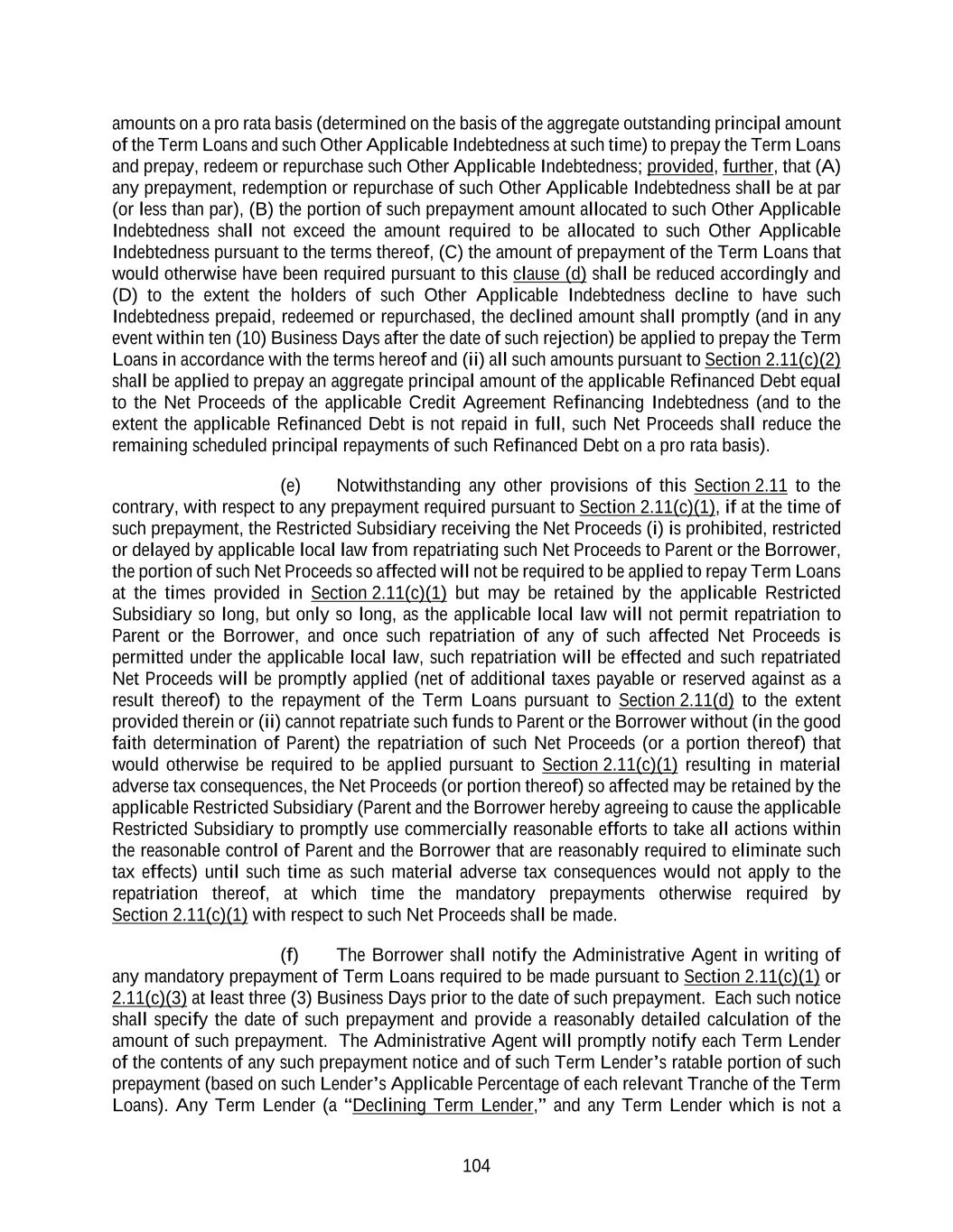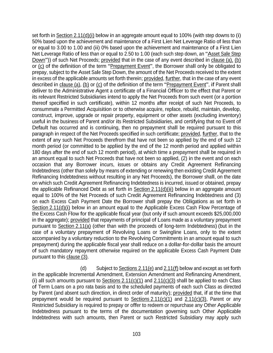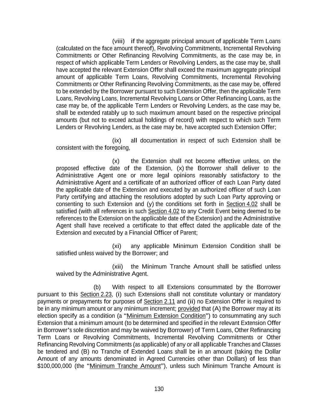 130 (viii) if the aggregate principal amount of applicable Term Loans (calculated on the face amount thereof), Revolving Commitments, Incremental Revolving Commitments or Other Refinancing Revolving Commitments, as the case may be, in respect of which applicable Term Lenders or Revolving Lenders, as the case may be, shall have accepted the relevant Extension Offer shall exceed the maximum aggregate principal amount of applicable Term Loans, Revolving Commitments, Incremental Revolving Commitments or Other Refinancing Revolving Commitments, as the case may be, offered to be extended by the Borrower pursuant to such Extension Offer, then the applicable Term Loans, Revolving Loans, Incremental Revolving Loans or Other Refinancing Loans, as the case may be, of the applicable Term Lenders or Revolving Lenders, as the case may be, shall be extended ratably up to such maximum amount based on the respective principal amounts (but not to exceed actual holdings of record) with respect to which such Term Lenders or Revolving Lenders, as the case may be, have accepted such Extension Offer; (ix) all documentation in respect of such Extension shall be consistent with the foregoing, (x) the Extension shall not become effective unless, on the proposed effective date of the Extension, (x) the Borrower shall deliver to the Administrative Agent one or more legal opinions reasonably satisfactory to the Administrative Agent and a certificate of an authorized officer of each Loan Party dated the applicable date of the Extension and executed by an authorized officer of such Loan Party certifying and attaching the resolutions adopted by such Loan Party approving or consenting to such Extension and (y) the conditions set forth in Section 4.02 shall be satisfied (with all references in such Section 4.02 to any Credit Event being deemed to be references to the Extension on the applicable date of the Extension) and the Administrative Agent shall have received a certificate to that effect dated the applicable date of the Extension and executed by a Financial Officer of Parent; (xi) any applicable Minimum Extension Condition shall be satisfied unless waived by the Borrower; and (xii) the Minimum Tranche Amount shall be satisfied unless waived by the Administrative Agent. (b) With respect to all Extensions consummated by the Borrower pursuant to this Section 2.23, (i) such Extensions shall not constitute voluntary or mandatory payments or prepayments for purposes of Section 2.11 and (ii) no Extension Offer is required to be in any minimum amount or any minimum increment; provided that (A) the Borrower may at its election specify as a condition (a “Minimum Extension Condition”) to consummating any such Extension that a minimum amount (to be determined and specified in the relevant Extension Offer in Borrower’s sole discretion and may be waived by Borrower) of Term Loans, Other Refinancing Term Loans or Revolving Commitments, Incremental Revolving Commitments or Other Refinancing Revolving Commitments (as applicable) of any or all applicable Tranches and Classes be tendered and (B) no Tranche of Extended Loans shall be in an amount (taking the Dollar Amount of any amounts denominated in Agreed Currencies other than Dollars) of less than $100,000,000 (the “Minimum Tranche Amount”), unless such Minimum Tranche Amount is