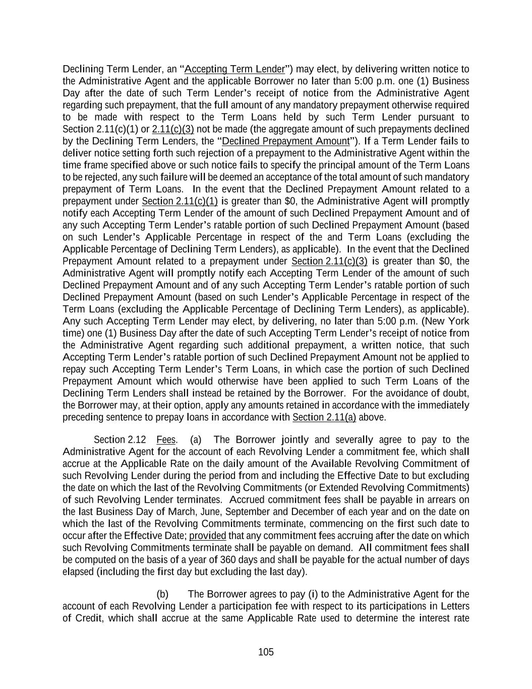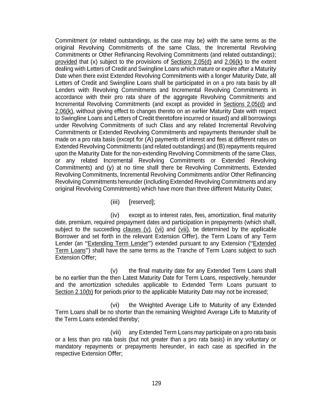 129 Commitment (or related outstandings, as the case may be) with the same terms as the original Revolving Commitments of the same Class, the Incremental Revolving Commitments or Other Refinancing Revolving Commitments (and related outstandings); provided that (x) subject to the provisions of Sections 2.05(d) and 2.06(k) to the extent dealing with Letters of Credit and Swingline Loans which mature or expire after a Maturity Date when there exist Extended Revolving Commitments with a longer Maturity Date, all Letters of Credit and Swingline Loans shall be participated in on a pro rata basis by all Lenders with Revolving Commitments and Incremental Revolving Commitments in accordance with their pro rata share of the aggregate Revolving Commitments and Incremental Revolving Commitments (and except as provided in Sections 2.05(d) and 2.06(k), without giving effect to changes thereto on an earlier Maturity Date with respect to Swingline Loans and Letters of Credit theretofore incurred or issued) and all borrowings under Revolving Commitments of such Class and any related Incremental Revolving Commitments or Extended Revolving Commitments and repayments thereunder shall be made on a pro rata basis (except for (A) payments of interest and fees at different rates on Extended Revolving Commitments (and related outstandings) and (B) repayments required upon the Maturity Date for the non-extending Revolving Commitments of the same Class, or any related Incremental Revolving Commitments or Extended Revolving Commitments) and (y) at no time shall there be Revolving Commitments, Extended Revolving Commitments, Incremental Revolving Commitments and/or Other Refinancing Revolving Commitments hereunder (including Extended Revolving Commitments and any original Revolving Commitments) which have more than three different Maturity Dates; (iii) [reserved]; (iv) except as to interest rates, fees, amortization, final maturity date, premium, required prepayment dates and participation in prepayments (which shall, subject to the succeeding clauses (v), (vi) and (vii), be determined by the applicable Borrower and set forth in the relevant Extension Offer), the Term Loans of any Term Lender (an “Extending Term Lender”) extended pursuant to any Extension (“Extended Term Loans”) shall have the same terms as the Tranche of Term Loans subject to such Extension Offer; (v) the final maturity date for any Extended Term Loans shall be no earlier than the then Latest Maturity Date for Term Loans, respectively, hereunder and the amortization schedules applicable to Extended Term Loans pursuant to Section 2.10(b) for periods prior to the applicable Maturity Date may not be increased; (vi) the Weighted Average Life to Maturity of any Extended Term Loans shall be no shorter than the remaining Weighted Average Life to Maturity of the Term Loans extended thereby; (vii) any Extended Term Loans may participate on a pro rata basis or a less than pro rata basis (but not greater than a pro rata basis) in any voluntary or mandatory repayments or prepayments hereunder, in each case as specified in the respective Extension Offer;