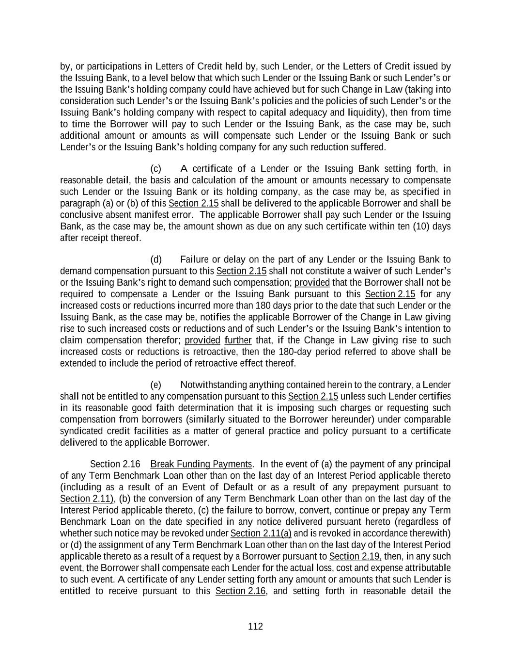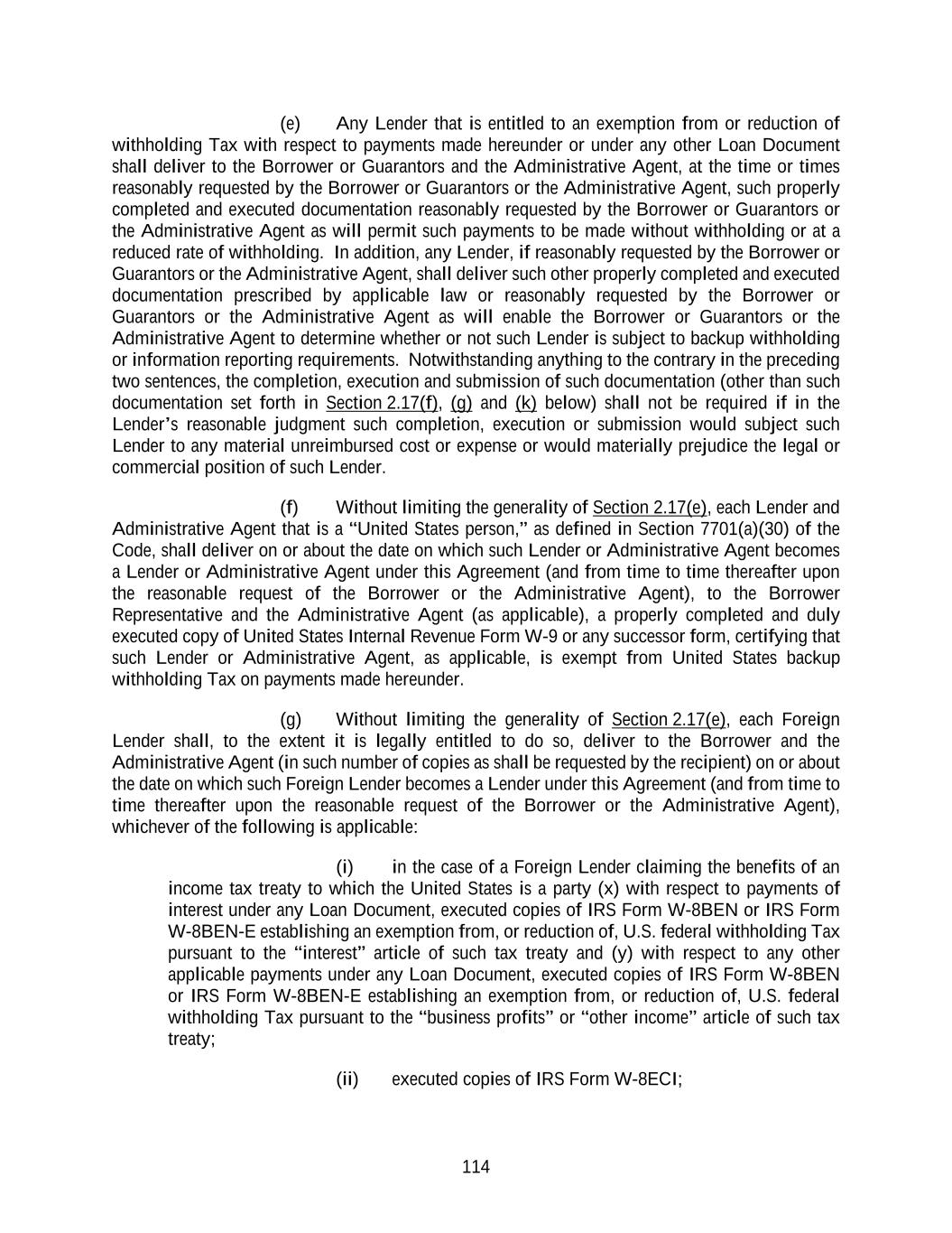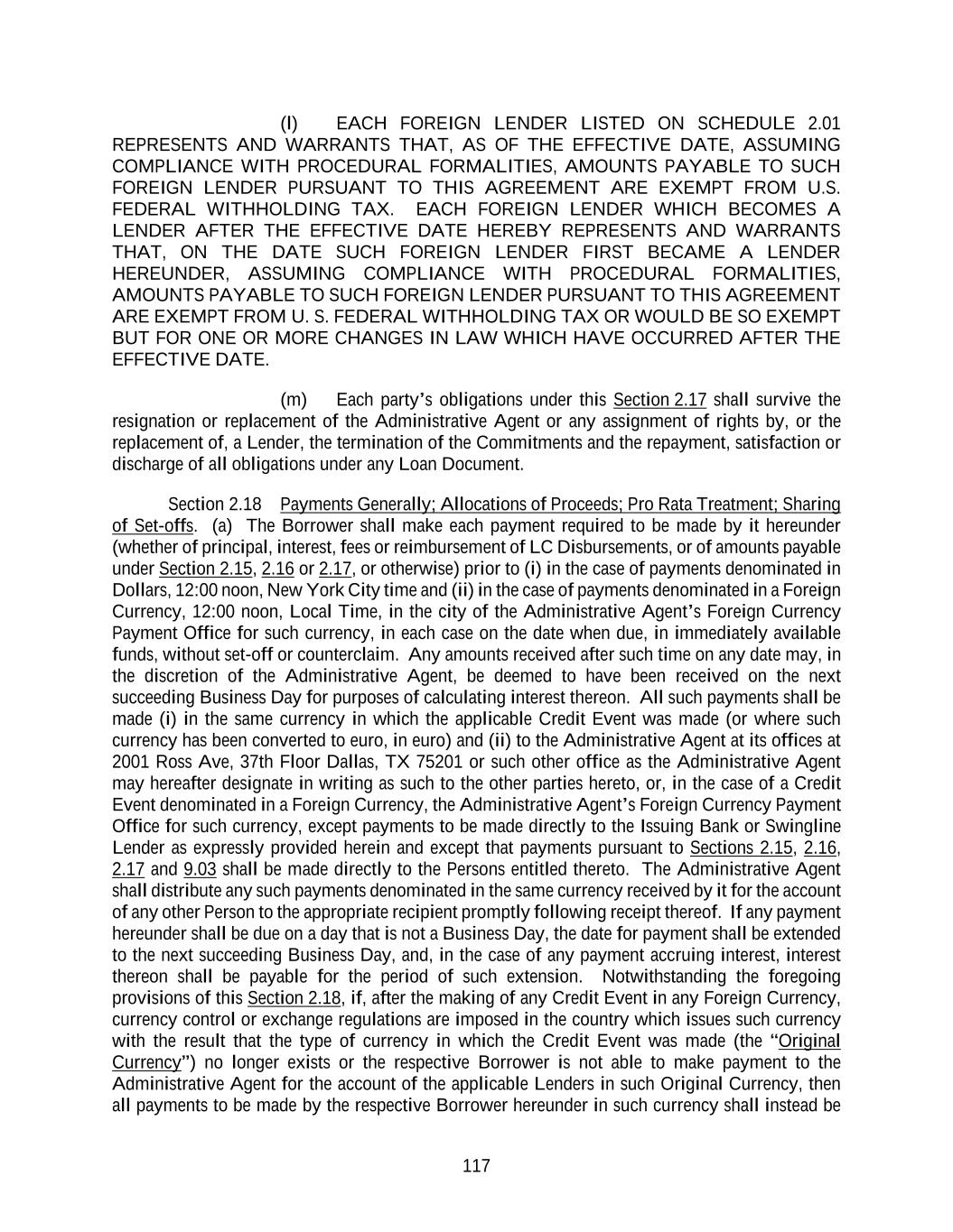 117 (l) EACH FOREIGN LENDER LISTED ON SCHEDULE 2.01 REPRESENTS AND WARRANTS THAT, AS OF THE EFFECTIVE DATE, ASSUMING COMPLIANCE WITH PROCEDURAL FORMALITIES, AMOUNTS PAYABLE TO SUCH FOREIGN LENDER PURSUANT TO THIS AGREEMENT ARE EXEMPT FROM U.S. FEDERAL WITHHOLDING TAX. EACH FOREIGN LENDER WHICH BECOMES A LENDER AFTER THE EFFECTIVE DATE HEREBY REPRESENTS AND WARRANTS THAT, ON THE DATE SUCH FOREIGN LENDER FIRST BECAME A LENDER HEREUNDER, ASSUMING COMPLIANCE WITH PROCEDURAL FORMALITIES, AMOUNTS PAYABLE TO SUCH FOREIGN LENDER PURSUANT TO THIS AGREEMENT ARE EXEMPT FROM U. S. FEDERAL WITHHOLDING TAX OR WOULD BE SO EXEMPT BUT FOR ONE OR MORE CHANGES IN LAW WHICH HAVE OCCURRED AFTER THE EFFECTIVE DATE. (m) Each party’s obligations under this Section 2.17 shall survive the resignation or replacement of the Administrative Agent or any assignment of rights by, or the replacement of, a Lender, the termination of the Commitments and the repayment, satisfaction or discharge of all obligations under any Loan Document. Section 2.18 Payments Generally; Allocations of Proceeds; Pro Rata Treatment; Sharing of Set-offs. (a) The Borrower shall make each payment required to be made by it hereunder (whether of principal, interest, fees or reimbursement of LC Disbursements, or of amounts payable under Section 2.15, 2.16 or 2.17, or otherwise) prior to (i) in the case of payments denominated in Dollars, 12:00 noon, New York City time and (ii) in the case of payments denominated in a Foreign Currency, 12:00 noon, Local Time, in the city of the Administrative Agent’s Foreign Currency Payment Office for such currency, in each case on the date when due, in immediately available funds, without set-off or counterclaim. Any amounts received after such time on any date may, in the discretion of the Administrative Agent, be deemed to have been received on the next succeeding Business Day for purposes of calculating interest thereon. All such payments shall be made (i) in the same currency in which the applicable Credit Event was made (or where such currency has been converted to euro, in euro) and (ii) to the Administrative Agent at its offices at 2001 Ross Ave, 37th Floor Dallas, TX 75201 or such other office as the Administrative Agent may hereafter designate in writing as such to the other parties hereto, or, in the case of a Credit Event denominated in a Foreign Currency, the Administrative Agent’s Foreign Currency Payment Office for such currency, except payments to be made directly to the Issuing Bank or Swingline Lender as expressly provided herein and except that payments pursuant to Sections 2.15, 2.16, 2.17 and 9.03 shall be made directly to the Persons entitled thereto. The Administrative Agent shall distribute any such payments denominated in the same currency received by it for the account of any other Person to the appropriate recipient promptly following receipt thereof. If any payment hereunder shall be due on a day that is not a Business Day, the date for payment shall be extended to the next succeeding Business Day, and, in the case of any payment accruing interest, interest thereon shall be payable for the period of such extension. Notwithstanding the foregoing provisions of this Section 2.18, if, after the making of any Credit Event in any Foreign Currency, currency control or exchange regulations are imposed in the country which issues such currency with the result that the type of currency in which the Credit Event was made (the “Original Currency”) no longer exists or the respective Borrower is not able to make payment to the Administrative Agent for the account of the applicable Lenders in such Original Currency, then all payments to be made by the respective Borrower hereunder in such currency shall instead be