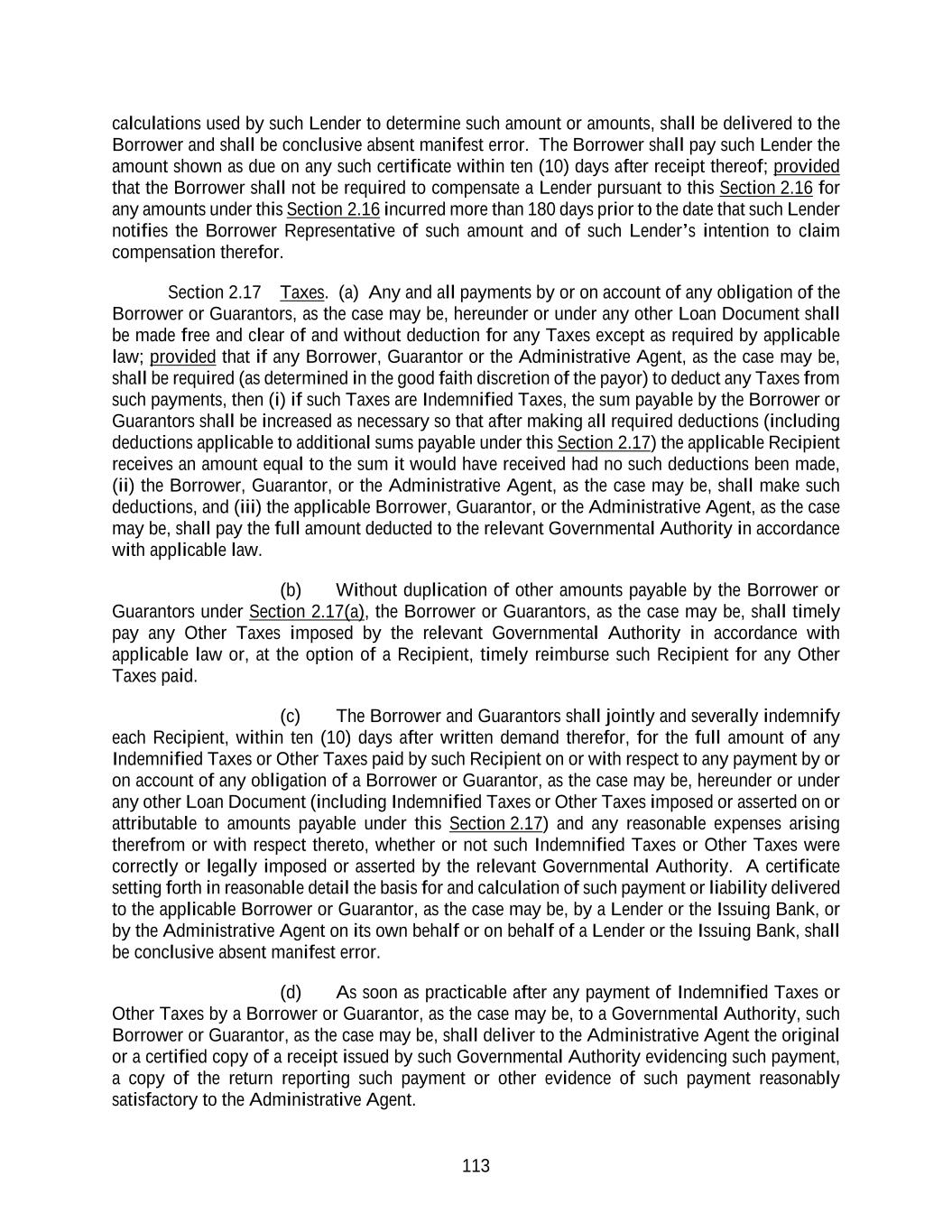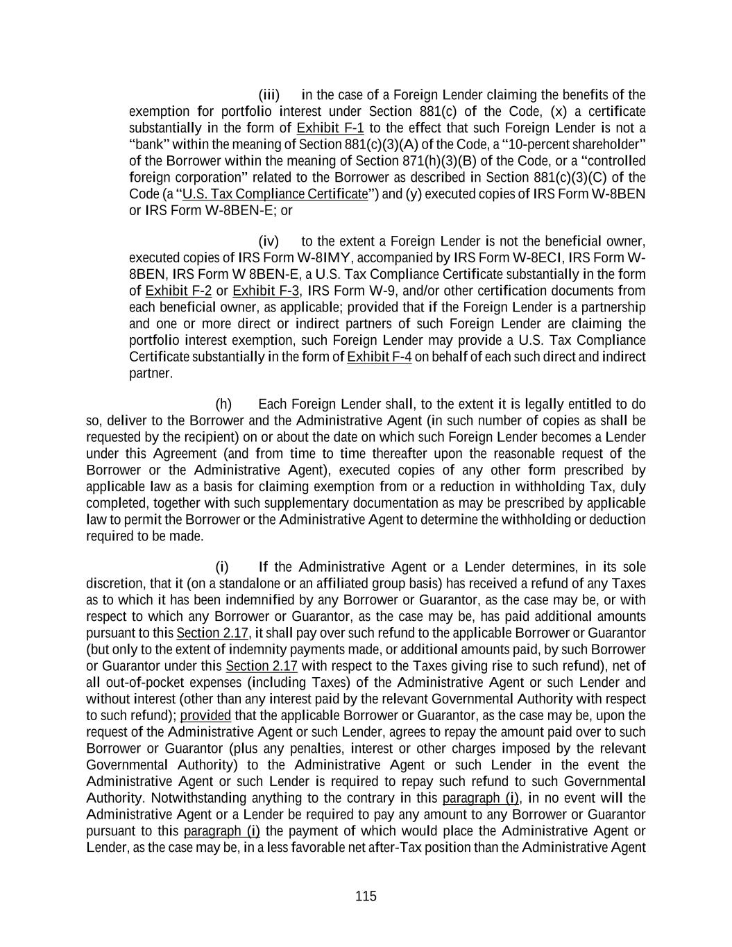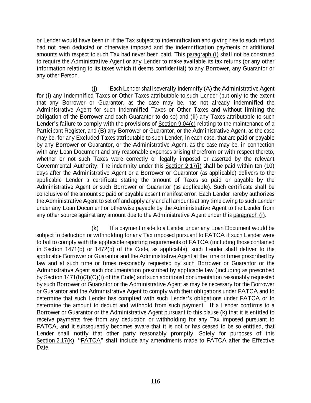 116 or Lender would have been in if the Tax subject to indemnification and giving rise to such refund had not been deducted or otherwise imposed and the indemnification payments or additional amounts with respect to such Tax had never been paid. This paragraph (i) shall not be construed to require the Administrative Agent or any Lender to make available its tax returns (or any other information relating to its taxes which it deems confidential) to any Borrower, any Guarantor or any other Person. (j) Each Lender shall severally indemnify (A) the Administrative Agent for (i) any Indemnified Taxes or Other Taxes attributable to such Lender (but only to the extent that any Borrower or Guarantor, as the case may be, has not already indemnified the Administrative Agent for such Indemnified Taxes or Other Taxes and without limiting the obligation of the Borrower and each Guarantor to do so) and (ii) any Taxes attributable to such Lender’s failure to comply with the provisions of Section 9.04(c) relating to the maintenance of a Participant Register, and (B) any Borrower or Guarantor, or the Administrative Agent, as the case may be, for any Excluded Taxes attributable to such Lender, in each case, that are paid or payable by any Borrower or Guarantor, or the Administrative Agent, as the case may be, in connection with any Loan Document and any reasonable expenses arising therefrom or with respect thereto, whether or not such Taxes were correctly or legally imposed or asserted by the relevant Governmental Authority. The indemnity under this Section 2.17(j) shall be paid within ten (10) days after the Administrative Agent or a Borrower or Guarantor (as applicable) delivers to the applicable Lender a certificate stating the amount of Taxes so paid or payable by the Administrative Agent or such Borrower or Guarantor (as applicable). Such certificate shall be conclusive of the amount so paid or payable absent manifest error. Each Lender hereby authorizes the Administrative Agent to set off and apply any and all amounts at any time owing to such Lender under any Loan Document or otherwise payable by the Administrative Agent to the Lender from any other source against any amount due to the Administrative Agent under this paragraph (j). (k) If a payment made to a Lender under any Loan Document would be subject to deduction or withholding for any Tax imposed pursuant to FATCA if such Lender were to fail to comply with the applicable reporting requirements of FATCA (including those contained in Section 1471(b) or 1472(b) of the Code, as applicable), such Lender shall deliver to the applicable Borrower or Guarantor and the Administrative Agent at the time or times prescribed by law and at such time or times reasonably requested by such Borrower or Guarantor or the Administrative Agent such documentation prescribed by applicable law (including as prescribed by Section 1471(b)(3)(C)(i) of the Code) and such additional documentation reasonably requested by such Borrower or Guarantor or the Administrative Agent as may be necessary for the Borrower or Guarantor and the Administrative Agent to comply with their obligations under FATCA and to determine that such Lender has complied with such Lender’s obligations under FATCA or to determine the amount to deduct and withhold from such payment. If a Lender confirms to a Borrower or Guarantor or the Administrative Agent pursuant to this clause (k) that it is entitled to receive payments free from any deduction or withholding for any Tax imposed pursuant to FATCA, and it subsequently becomes aware that it is not or has ceased to be so entitled, that Lender shall notify that other party reasonably promptly. Solely for purposes of this Section 2.17(k), “FATCA” shall include any amendments made to FATCA after the Effective Date.
