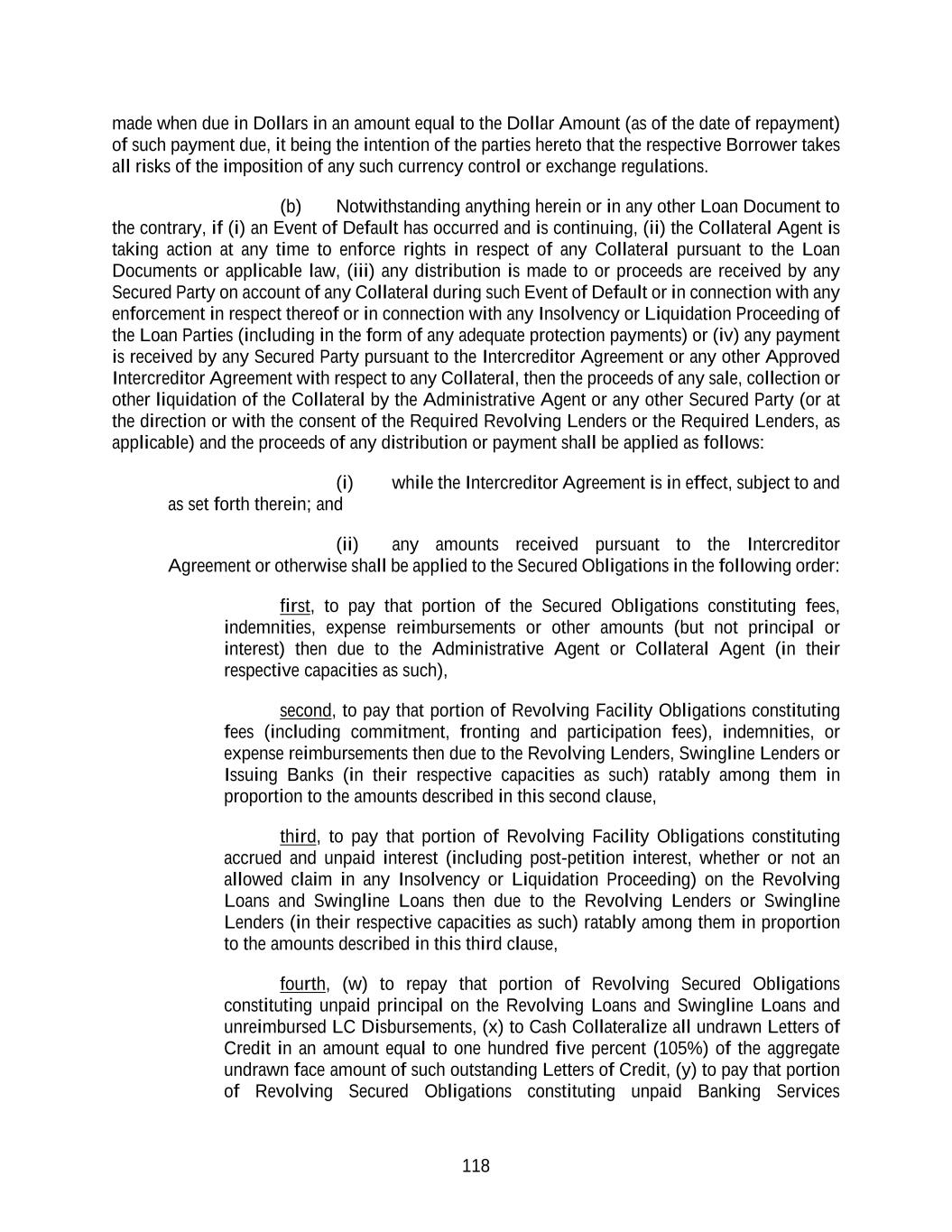 118 made when due in Dollars in an amount equal to the Dollar Amount (as of the date of repayment) of such payment due, it being the intention of the parties hereto that the respective Borrower takes all risks of the imposition of any such currency control or exchange regulations. (b) Notwithstanding anything herein or in any other Loan Document to the contrary, if (i) an Event of Default has occurred and is continuing, (ii) the Collateral Agent is taking action at any time to enforce rights in respect of any Collateral pursuant to the Loan Documents or applicable law, (iii) any distribution is made to or proceeds are received by any Secured Party on account of any Collateral during such Event of Default or in connection with any enforcement in respect thereof or in connection with any Insolvency or Liquidation Proceeding of the Loan Parties (including in the form of any adequate protection payments) or (iv) any payment is received by any Secured Party pursuant to the Intercreditor Agreement or any other Approved Intercreditor Agreement with respect to any Collateral, then the proceeds of any sale, collection or other liquidation of the Collateral by the Administrative Agent or any other Secured Party (or at the direction or with the consent of the Required Revolving Lenders or the Required Lenders, as applicable) and the proceeds of any distribution or payment shall be applied as follows: (i) while the Intercreditor Agreement is in effect, subject to and as set forth therein; and (ii) any amounts received pursuant to the Intercreditor Agreement or otherwise shall be applied to the Secured Obligations in the following order: first, to pay that portion of the Secured Obligations constituting fees, indemnities, expense reimbursements or other amounts (but not principal or interest) then due to the Administrative Agent or Collateral Agent (in their respective capacities as such), second, to pay that portion of Revolving Facility Obligations constituting fees (including commitment, fronting and participation fees), indemnities, or expense reimbursements then due to the Revolving Lenders, Swingline Lenders or Issuing Banks (in their respective capacities as such) ratably among them in proportion to the amounts described in this second clause, third, to pay that portion of Revolving Facility Obligations constituting accrued and unpaid interest (including post-petition interest, whether or not an allowed claim in any Insolvency or Liquidation Proceeding) on the Revolving Loans and Swingline Loans then due to the Revolving Lenders or Swingline Lenders (in their respective capacities as such) ratably among them in proportion to the amounts described in this third clause, fourth, (w) to repay that portion of Revolving Secured Obligations constituting unpaid principal on the Revolving Loans and Swingline Loans and unreimbursed LC Disbursements, (x) to Cash Collateralize all undrawn Letters of Credit in an amount equal to one hundred five percent (105%) of the aggregate undrawn face amount of such outstanding Letters of Credit, (y) to pay that portion of Revolving Secured Obligations constituting unpaid Banking Services