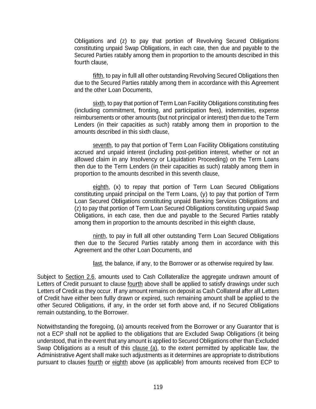 119 Obligations and (z) to pay that portion of Revolving Secured Obligations constituting unpaid Swap Obligations, in each case, then due and payable to the Secured Parties ratably among them in proportion to the amounts described in this fourth clause, fifth, to pay in full all other outstanding Revolving Secured Obligations then due to the Secured Parties ratably among them in accordance with this Agreement and the other Loan Documents, sixth, to pay that portion of Term Loan Facility Obligations constituting fees (including commitment, fronting, and participation fees), indemnities, expense reimbursements or other amounts (but not principal or interest) then due to the Term Lenders (in their capacities as such) ratably among them in proportion to the amounts described in this sixth clause, seventh, to pay that portion of Term Loan Facility Obligations constituting accrued and unpaid interest (including post-petition interest, whether or not an allowed claim in any Insolvency or Liquidation Proceeding) on the Term Loans then due to the Term Lenders (in their capacities as such) ratably among them in proportion to the amounts described in this seventh clause, eighth, (x) to repay that portion of Term Loan Secured Obligations constituting unpaid principal on the Term Loans, (y) to pay that portion of Term Loan Secured Obligations constituting unpaid Banking Services Obligations and (z) to pay that portion of Term Loan Secured Obligations constituting unpaid Swap Obligations, in each case, then due and payable to the Secured Parties ratably among them in proportion to the amounts described in this eighth clause, ninth, to pay in full all other outstanding Term Loan Secured Obligations then due to the Secured Parties ratably among them in accordance with this Agreement and the other Loan Documents, and last, the balance, if any, to the Borrower or as otherwise required by law. Subject to Section 2.6, amounts used to Cash Collateralize the aggregate undrawn amount of Letters of Credit pursuant to clause fourth above shall be applied to satisfy drawings under such Letters of Credit as they occur. If any amount remains on deposit as Cash Collateral after all Letters of Credit have either been fully drawn or expired, such remaining amount shall be applied to the other Secured Obligations, if any, in the order set forth above and, if no Secured Obligations remain outstanding, to the Borrower. Notwithstanding the foregoing, (a) amounts received from the Borrower or any Guarantor that is not a ECP shall not be applied to the obligations that are Excluded Swap Obligations (it being understood, that in the event that any amount is applied to Secured Obligations other than Excluded Swap Obligations as a result of this clause (a), to the extent permitted by applicable law, the Administrative Agent shall make such adjustments as it determines are appropriate to distributions pursuant to clauses fourth or eighth above (as applicable) from amounts received from ECP to