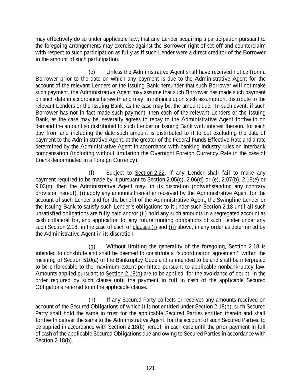 121 may effectively do so under applicable law, that any Lender acquiring a participation pursuant to the foregoing arrangements may exercise against the Borrower right of set-off and counterclaim with respect to such participation as fully as if such Lender were a direct creditor of the Borrower in the amount of such participation. (e) Unless the Administrative Agent shall have received notice from a Borrower prior to the date on which any payment is due to the Administrative Agent for the account of the relevant Lenders or the Issuing Bank hereunder that such Borrower will not make such payment, the Administrative Agent may assume that such Borrower has made such payment on such date in accordance herewith and may, in reliance upon such assumption, distribute to the relevant Lenders or the Issuing Bank, as the case may be, the amount due. In such event, if such Borrower has not in fact made such payment, then each of the relevant Lenders or the Issuing Bank, as the case may be, severally agrees to repay to the Administrative Agent forthwith on demand the amount so distributed to such Lender or Issuing Bank with interest thereon, for each day from and including the date such amount is distributed to it to but excluding the date of payment to the Administrative Agent, at the greater of the Federal Funds Effective Rate and a rate determined by the Administrative Agent in accordance with banking industry rules on interbank compensation (including without limitation the Overnight Foreign Currency Rate in the case of Loans denominated in a Foreign Currency). (f) Subject to Section 2.22, if any Lender shall fail to make any payment required to be made by it pursuant to Section 2.05(c), 2.06(d) or (e), 2.07(b), 2.18(e) or 9.03(c), then the Administrative Agent may, in its discretion (notwithstanding any contrary provision hereof), (i) apply any amounts thereafter received by the Administrative Agent for the account of such Lender and for the benefit of the Administrative Agent, the Swingline Lender or the Issuing Bank to satisfy such Lender’s obligations to it under such Section 2.18 until all such unsatisfied obligations are fully paid and/or (ii) hold any such amounts in a segregated account as cash collateral for, and application to, any future funding obligations of such Lender under any such Section 2.18; in the case of each of clauses (i) and (ii) above, in any order as determined by the Administrative Agent in its discretion. (g) Without limiting the generality of the foregoing, Section 2.18 is intended to constitute and shall be deemed to constitute a “subordination agreement” within the meaning of Section 510(a) of the Bankruptcy Code and is intended to be and shall be interpreted to be enforceable to the maximum extent permitted pursuant to applicable nonbankruptcy law. Amounts applied pursuant to Section 2.18(b) are to be applied, for the avoidance of doubt, in the order required by such clause until the payment in full in cash of the applicable Secured Obligations referred to in the applicable clause. (h) If any Secured Party collects or receives any amounts received on account of the Secured Obligations of which it is not entitled under Section 2.18(b), such Secured Party shall hold the same in trust for the applicable Secured Parties entitled thereto and shall forthwith deliver the same to the Administrative Agent, for the account of such Secured Parties, to be applied in accordance with Section 2.18(b) hereof, in each case until the prior payment in full of cash of the applicable Secured Obligations due and owing to Secured Parties in accordance with Section 2.18(b).