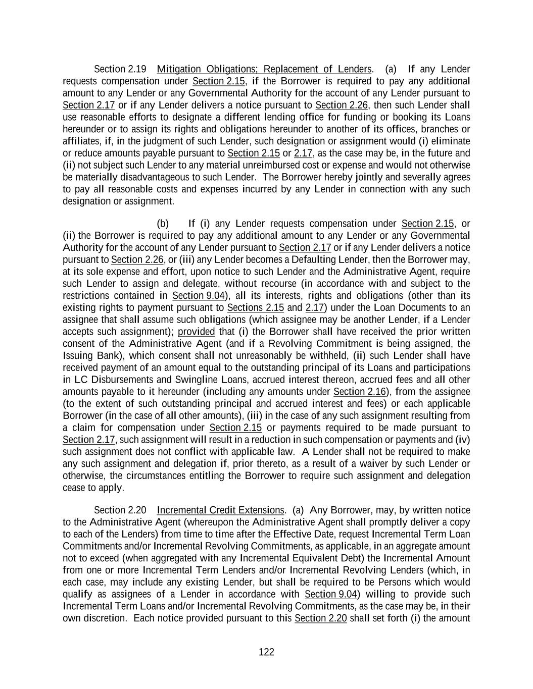 122 Section 2.19 Mitigation Obligations; Replacement of Lenders. (a) If any Lender requests compensation under Section 2.15, if the Borrower is required to pay any additional amount to any Lender or any Governmental Authority for the account of any Lender pursuant to Section 2.17 or if any Lender delivers a notice pursuant to Section 2.26, then such Lender shall use reasonable efforts to designate a different lending office for funding or booking its Loans hereunder or to assign its rights and obligations hereunder to another of its offices, branches or affiliates, if, in the judgment of such Lender, such designation or assignment would (i) eliminate or reduce amounts payable pursuant to Section 2.15 or 2.17, as the case may be, in the future and (ii) not subject such Lender to any material unreimbursed cost or expense and would not otherwise be materially disadvantageous to such Lender. The Borrower hereby jointly and severally agrees to pay all reasonable costs and expenses incurred by any Lender in connection with any such designation or assignment. (b) If (i) any Lender requests compensation under Section 2.15, or (ii) the Borrower is required to pay any additional amount to any Lender or any Governmental Authority for the account of any Lender pursuant to Section 2.17 or if any Lender delivers a notice pursuant to Section 2.26, or (iii) any Lender becomes a Defaulting Lender, then the Borrower may, at its sole expense and effort, upon notice to such Lender and the Administrative Agent, require such Lender to assign and delegate, without recourse (in accordance with and subject to the restrictions contained in Section 9.04), all its interests, rights and obligations (other than its existing rights to payment pursuant to Sections 2.15 and 2.17) under the Loan Documents to an assignee that shall assume such obligations (which assignee may be another Lender, if a Lender accepts such assignment); provided that (i) the Borrower shall have received the prior written consent of the Administrative Agent (and if a Revolving Commitment is being assigned, the Issuing Bank), which consent shall not unreasonably be withheld, (ii) such Lender shall have received payment of an amount equal to the outstanding principal of its Loans and participations in LC Disbursements and Swingline Loans, accrued interest thereon, accrued fees and all other amounts payable to it hereunder (including any amounts under Section 2.16), from the assignee (to the extent of such outstanding principal and accrued interest and fees) or each applicable Borrower (in the case of all other amounts), (iii) in the case of any such assignment resulting from a claim for compensation under Section 2.15 or payments required to be made pursuant to Section 2.17, such assignment will result in a reduction in such compensation or payments and (iv) such assignment does not conflict with applicable law. A Lender shall not be required to make any such assignment and delegation if, prior thereto, as a result of a waiver by such Lender or otherwise, the circumstances entitling the Borrower to require such assignment and delegation cease to apply. Section 2.20 Incremental Credit Extensions. (a) Any Borrower, may, by written notice to the Administrative Agent (whereupon the Administrative Agent shall promptly deliver a copy to each of the Lenders) from time to time after the Effective Date, request Incremental Term Loan Commitments and/or Incremental Revolving Commitments, as applicable, in an aggregate amount not to exceed (when aggregated with any Incremental Equivalent Debt) the Incremental Amount from one or more Incremental Term Lenders and/or Incremental Revolving Lenders (which, in each case, may include any existing Lender, but shall be required to be Persons which would qualify as assignees of a Lender in accordance with Section 9.04) willing to provide such Incremental Term Loans and/or Incremental Revolving Commitments, as the case may be, in their own discretion. Each notice provided pursuant to this Section 2.20 shall set forth (i) the amount