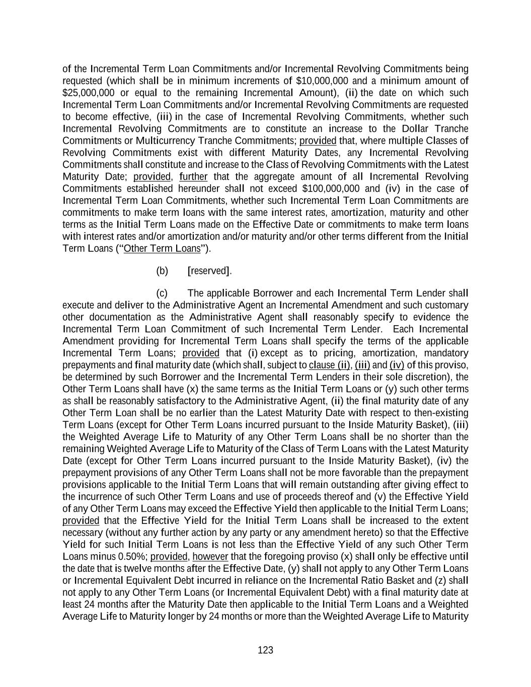 123 of the Incremental Term Loan Commitments and/or Incremental Revolving Commitments being requested (which shall be in minimum increments of $10,000,000 and a minimum amount of $25,000,000 or equal to the remaining Incremental Amount), (ii) the date on which such Incremental Term Loan Commitments and/or Incremental Revolving Commitments are requested to become effective, (iii) in the case of Incremental Revolving Commitments, whether such Incremental Revolving Commitments are to constitute an increase to the Dollar Tranche Commitments or Multicurrency Tranche Commitments; provided that, where multiple Classes of Revolving Commitments exist with different Maturity Dates, any Incremental Revolving Commitments shall constitute and increase to the Class of Revolving Commitments with the Latest Maturity Date; provided, further that the aggregate amount of all Incremental Revolving Commitments established hereunder shall not exceed $100,000,000 and (iv) in the case of Incremental Term Loan Commitments, whether such Incremental Term Loan Commitments are commitments to make term loans with the same interest rates, amortization, maturity and other terms as the Initial Term Loans made on the Effective Date or commitments to make term loans with interest rates and/or amortization and/or maturity and/or other terms different from the Initial Term Loans (“Other Term Loans”). (b) [reserved]. (c) The applicable Borrower and each Incremental Term Lender shall execute and deliver to the Administrative Agent an Incremental Amendment and such customary other documentation as the Administrative Agent shall reasonably specify to evidence the Incremental Term Loan Commitment of such Incremental Term Lender. Each Incremental Amendment providing for Incremental Term Loans shall specify the terms of the applicable Incremental Term Loans; provided that (i) except as to pricing, amortization, mandatory prepayments and final maturity date (which shall, subject to clause (ii), (iii) and (iv) of this proviso, be determined by such Borrower and the Incremental Term Lenders in their sole discretion), the Other Term Loans shall have (x) the same terms as the Initial Term Loans or (y) such other terms as shall be reasonably satisfactory to the Administrative Agent, (ii) the final maturity date of any Other Term Loan shall be no earlier than the Latest Maturity Date with respect to then-existing Term Loans (except for Other Term Loans incurred pursuant to the Inside Maturity Basket), (iii) the Weighted Average Life to Maturity of any Other Term Loans shall be no shorter than the remaining Weighted Average Life to Maturity of the Class of Term Loans with the Latest Maturity Date (except for Other Term Loans incurred pursuant to the Inside Maturity Basket), (iv) the prepayment provisions of any Other Term Loans shall not be more favorable than the prepayment provisions applicable to the Initial Term Loans that will remain outstanding after giving effect to the incurrence of such Other Term Loans and use of proceeds thereof and (v) the Effective Yield of any Other Term Loans may exceed the Effective Yield then applicable to the Initial Term Loans; provided that the Effective Yield for the Initial Term Loans shall be increased to the extent necessary (without any further action by any party or any amendment hereto) so that the Effective Yield for such Initial Term Loans is not less than the Effective Yield of any such Other Term Loans minus 0.50%; provided, however that the foregoing proviso (x) shall only be effective until the date that is twelve months after the Effective Date, (y) shall not apply to any Other Term Loans or Incremental Equivalent Debt incurred in reliance on the Incremental Ratio Basket and (z) shall not apply to any Other Term Loans (or Incremental Equivalent Debt) with a final maturity date at least 24 months after the Maturity Date then applicable to the Initial Term Loans and a Weighted Average Life to Maturity longer by 24 months or more than the Weighted Average Life to Maturity