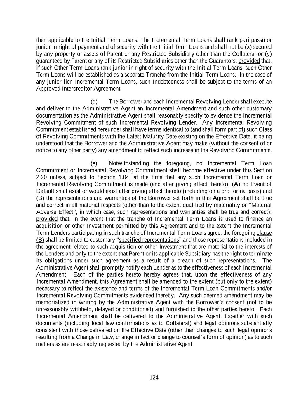 124 then applicable to the Initial Term Loans. The Incremental Term Loans shall rank pari passu or junior in right of payment and of security with the Initial Term Loans and shall not be (x) secured by any property or assets of Parent or any Restricted Subsidiary other than the Collateral or (y) guaranteed by Parent or any of its Restricted Subsidiaries other than the Guarantors; provided that, if such Other Term Loans rank junior in right of security with the Initial Term Loans, such Other Term Loans will be established as a separate Tranche from the Initial Term Loans. In the case of any junior lien Incremental Term Loans, such Indebtedness shall be subject to the terms of an Approved Intercreditor Agreement. (d) The Borrower and each Incremental Revolving Lender shall execute and deliver to the Administrative Agent an Incremental Amendment and such other customary documentation as the Administrative Agent shall reasonably specify to evidence the Incremental Revolving Commitment of such Incremental Revolving Lender. Any Incremental Revolving Commitment established hereunder shall have terms identical to (and shall form part of) such Class of Revolving Commitments with the Latest Maturity Date existing on the Effective Date, it being understood that the Borrower and the Administrative Agent may make (without the consent of or notice to any other party) any amendment to reflect such increase in the Revolving Commitments. (e) Notwithstanding the foregoing, no Incremental Term Loan Commitment or Incremental Revolving Commitment shall become effective under this Section 2.20 unless, subject to Section 1.04, at the time that any such Incremental Term Loan or Incremental Revolving Commitment is made (and after giving effect thereto), (A) no Event of Default shall exist or would exist after giving effect thereto (including on a pro forma basis) and (B) the representations and warranties of the Borrower set forth in this Agreement shall be true and correct in all material respects (other than to the extent qualified by materiality or “Material Adverse Effect”, in which case, such representations and warranties shall be true and correct); provided that, in the event that the tranche of Incremental Term Loans is used to finance an acquisition or other Investment permitted by this Agreement and to the extent the Incremental Term Lenders participating in such tranche of Incremental Term Loans agree, the foregoing clause (B) shall be limited to customary “specified representations” and those representations included in the agreement related to such acquisition or other Investment that are material to the interests of the Lenders and only to the extent that Parent or its applicable Subsidiary has the right to terminate its obligations under such agreement as a result of a breach of such representations. The Administrative Agent shall promptly notify each Lender as to the effectiveness of each Incremental Amendment. Each of the parties hereto hereby agrees that, upon the effectiveness of any Incremental Amendment, this Agreement shall be amended to the extent (but only to the extent) necessary to reflect the existence and terms of the Incremental Term Loan Commitments and/or Incremental Revolving Commitments evidenced thereby. Any such deemed amendment may be memorialized in writing by the Administrative Agent with the Borrower’s consent (not to be unreasonably withheld, delayed or conditioned) and furnished to the other parties hereto. Each Incremental Amendment shall be delivered to the Administrative Agent, together with such documents (including local law confirmations as to Collateral) and legal opinions substantially consistent with those delivered on the Effective Date (other than changes to such legal opinions resulting from a Change in Law, change in fact or change to counsel’s form of opinion) as to such matters as are reasonably requested by the Administrative Agent.