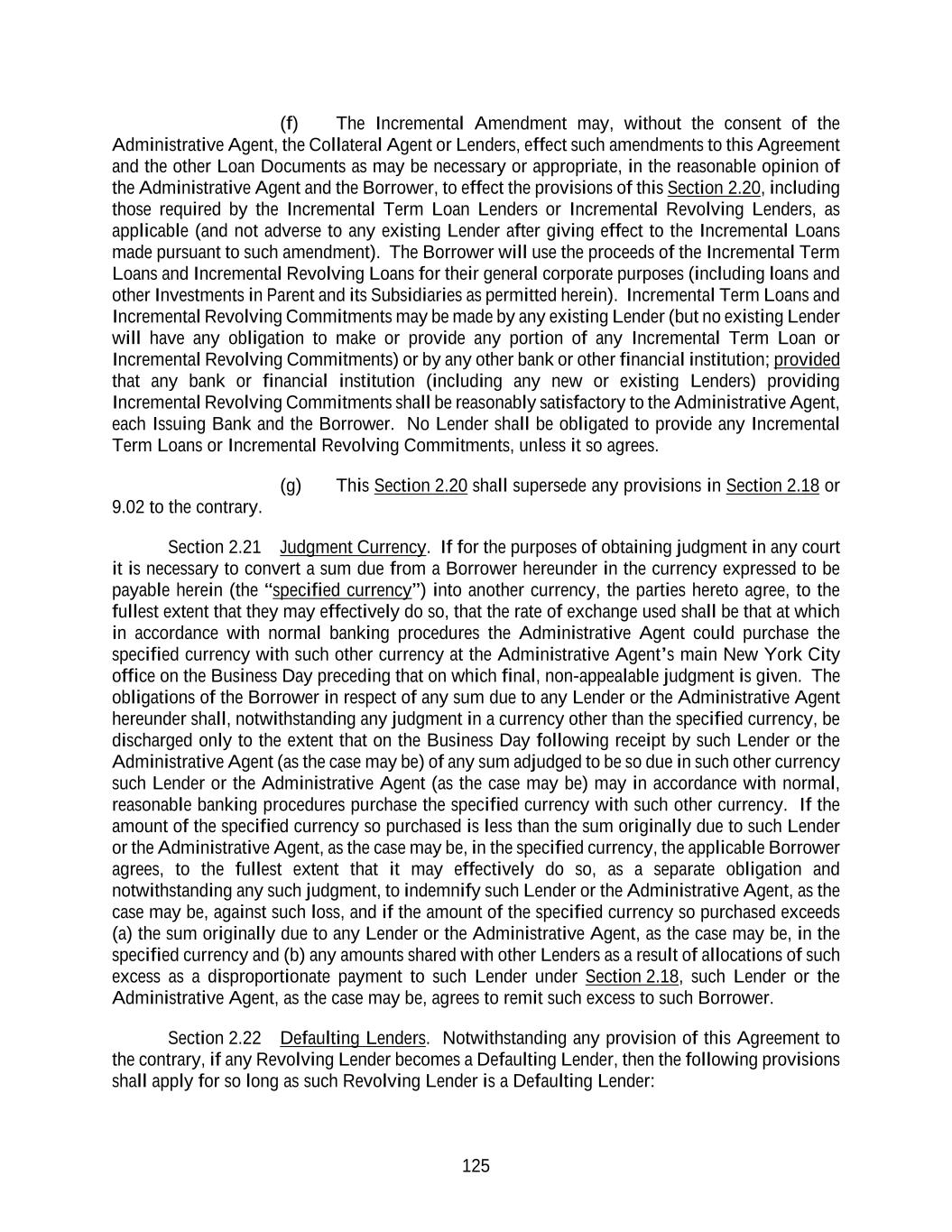 125 (f) The Incremental Amendment may, without the consent of the Administrative Agent, the Collateral Agent or Lenders, effect such amendments to this Agreement and the other Loan Documents as may be necessary or appropriate, in the reasonable opinion of the Administrative Agent and the Borrower, to effect the provisions of this Section 2.20, including those required by the Incremental Term Loan Lenders or Incremental Revolving Lenders, as applicable (and not adverse to any existing Lender after giving effect to the Incremental Loans made pursuant to such amendment). The Borrower will use the proceeds of the Incremental Term Loans and Incremental Revolving Loans for their general corporate purposes (including loans and other Investments in Parent and its Subsidiaries as permitted herein). Incremental Term Loans and Incremental Revolving Commitments may be made by any existing Lender (but no existing Lender will have any obligation to make or provide any portion of any Incremental Term Loan or Incremental Revolving Commitments) or by any other bank or other financial institution; provided that any bank or financial institution (including any new or existing Lenders) providing Incremental Revolving Commitments shall be reasonably satisfactory to the Administrative Agent, each Issuing Bank and the Borrower. No Lender shall be obligated to provide any Incremental Term Loans or Incremental Revolving Commitments, unless it so agrees. (g) This Section 2.20 shall supersede any provisions in Section 2.18 or 9.02 to the contrary. Section 2.21 Judgment Currency. If for the purposes of obtaining judgment in any court it is necessary to convert a sum due from a Borrower hereunder in the currency expressed to be payable herein (the “specified currency”) into another currency, the parties hereto agree, to the fullest extent that they may effectively do so, that the rate of exchange used shall be that at which in accordance with normal banking procedures the Administrative Agent could purchase the specified currency with such other currency at the Administrative Agent’s main New York City office on the Business Day preceding that on which final, non-appealable judgment is given. The obligations of the Borrower in respect of any sum due to any Lender or the Administrative Agent hereunder shall, notwithstanding any judgment in a currency other than the specified currency, be discharged only to the extent that on the Business Day following receipt by such Lender or the Administrative Agent (as the case may be) of any sum adjudged to be so due in such other currency such Lender or the Administrative Agent (as the case may be) may in accordance with normal, reasonable banking procedures purchase the specified currency with such other currency. If the amount of the specified currency so purchased is less than the sum originally due to such Lender or the Administrative Agent, as the case may be, in the specified currency, the applicable Borrower agrees, to the fullest extent that it may effectively do so, as a separate obligation and notwithstanding any such judgment, to indemnify such Lender or the Administrative Agent, as the case may be, against such loss, and if the amount of the specified currency so purchased exceeds (a) the sum originally due to any Lender or the Administrative Agent, as the case may be, in the specified currency and (b) any amounts shared with other Lenders as a result of allocations of such excess as a disproportionate payment to such Lender under Section 2.18, such Lender or the Administrative Agent, as the case may be, agrees to remit such excess to such Borrower. Section 2.22 Defaulting Lenders. Notwithstanding any provision of this Agreement to the contrary, if any Revolving Lender becomes a Defaulting Lender, then the following provisions shall apply for so long as such Revolving Lender is a Defaulting Lender: