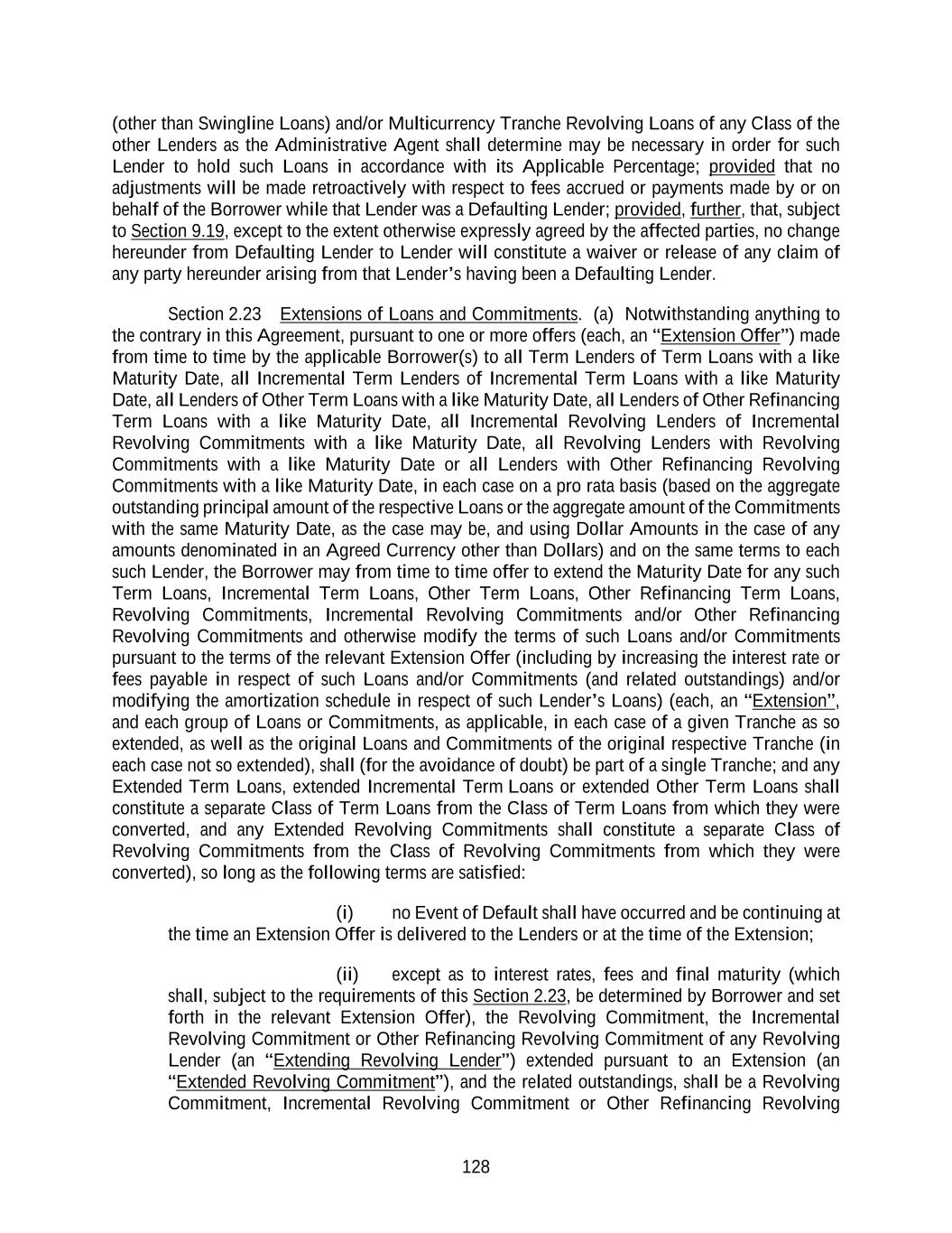 128 (other than Swingline Loans) and/or Multicurrency Tranche Revolving Loans of any Class of the other Lenders as the Administrative Agent shall determine may be necessary in order for such Lender to hold such Loans in accordance with its Applicable Percentage; provided that no adjustments will be made retroactively with respect to fees accrued or payments made by or on behalf of the Borrower while that Lender was a Defaulting Lender; provided, further, that, subject to Section 9.19, except to the extent otherwise expressly agreed by the affected parties, no change hereunder from Defaulting Lender to Lender will constitute a waiver or release of any claim of any party hereunder arising from that Lender’s having been a Defaulting Lender. Section 2.23 Extensions of Loans and Commitments. (a) Notwithstanding anything to the contrary in this Agreement, pursuant to one or more offers (each, an “Extension Offer”) made from time to time by the applicable Borrower(s) to all Term Lenders of Term Loans with a like Maturity Date, all Incremental Term Lenders of Incremental Term Loans with a like Maturity Date, all Lenders of Other Term Loans with a like Maturity Date, all Lenders of Other Refinancing Term Loans with a like Maturity Date, all Incremental Revolving Lenders of Incremental Revolving Commitments with a like Maturity Date, all Revolving Lenders with Revolving Commitments with a like Maturity Date or all Lenders with Other Refinancing Revolving Commitments with a like Maturity Date, in each case on a pro rata basis (based on the aggregate outstanding principal amount of the respective Loans or the aggregate amount of the Commitments with the same Maturity Date, as the case may be, and using Dollar Amounts in the case of any amounts denominated in an Agreed Currency other than Dollars) and on the same terms to each such Lender, the Borrower may from time to time offer to extend the Maturity Date for any such Term Loans, Incremental Term Loans, Other Term Loans, Other Refinancing Term Loans, Revolving Commitments, Incremental Revolving Commitments and/or Other Refinancing Revolving Commitments and otherwise modify the terms of such Loans and/or Commitments pursuant to the terms of the relevant Extension Offer (including by increasing the interest rate or fees payable in respect of such Loans and/or Commitments (and related outstandings) and/or modifying the amortization schedule in respect of such Lender’s Loans) (each, an “Extension”, and each group of Loans or Commitments, as applicable, in each case of a given Tranche as so extended, as well as the original Loans and Commitments of the original respective Tranche (in each case not so extended), shall (for the avoidance of doubt) be part of a single Tranche; and any Extended Term Loans, extended Incremental Term Loans or extended Other Term Loans shall constitute a separate Class of Term Loans from the Class of Term Loans from which they were converted, and any Extended Revolving Commitments shall constitute a separate Class of Revolving Commitments from the Class of Revolving Commitments from which they were converted), so long as the following terms are satisfied: (i) no Event of Default shall have occurred and be continuing at the time an Extension Offer is delivered to the Lenders or at the time of the Extension; (ii) except as to interest rates, fees and final maturity (which shall, subject to the requirements of this Section 2.23, be determined by Borrower and set forth in the relevant Extension Offer), the Revolving Commitment, the Incremental Revolving Commitment or Other Refinancing Revolving Commitment of any Revolving Lender (an “Extending Revolving Lender”) extended pursuant to an Extension (an “Extended Revolving Commitment”), and the related outstandings, shall be a Revolving Commitment, Incremental Revolving Commitment or Other Refinancing Revolving