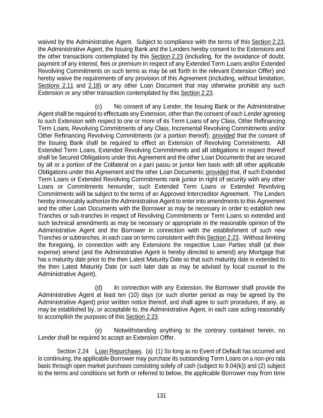 131 waived by the Administrative Agent. Subject to compliance with the terms of this Section 2.23, the Administrative Agent, the Issuing Bank and the Lenders hereby consent to the Extensions and the other transactions contemplated by this Section 2.23 (including, for the avoidance of doubt, payment of any interest, fees or premium in respect of any Extended Term Loans and/or Extended Revolving Commitments on such terms as may be set forth in the relevant Extension Offer) and hereby waive the requirements of any provision of this Agreement (including, without limitation, Sections 2.11 and 2.18) or any other Loan Document that may otherwise prohibit any such Extension or any other transaction contemplated by this Section 2.23. (c) No consent of any Lender, the Issuing Bank or the Administrative Agent shall be required to effectuate any Extension, other than the consent of each Lender agreeing to such Extension with respect to one or more of its Term Loans of any Class, Other Refinancing Term Loans, Revolving Commitments of any Class, Incremental Revolving Commitments and/or Other Refinancing Revolving Commitments (or a portion thereof); provided that the consent of the Issuing Bank shall be required to effect an Extension of Revolving Commitments. All Extended Term Loans, Extended Revolving Commitments and all obligations in respect thereof shall be Secured Obligations under this Agreement and the other Loan Documents that are secured by all or a portion of the Collateral on a pari passu or junior lien basis with all other applicable Obligations under this Agreement and the other Loan Documents; provided that, if such Extended Term Loans or Extended Revolving Commitments rank junior in right of security with any other Loans or Commitments hereunder, such Extended Term Loans or Extended Revolving Commitments will be subject to the terms of an Approved Intercreditor Agreement. The Lenders hereby irrevocably authorize the Administrative Agent to enter into amendments to this Agreement and the other Loan Documents with the Borrower as may be necessary in order to establish new Tranches or sub-tranches in respect of Revolving Commitments or Term Loans so extended and such technical amendments as may be necessary or appropriate in the reasonable opinion of the Administrative Agent and the Borrower in connection with the establishment of such new Tranches or subtranches, in each case on terms consistent with this Section 2.23. Without limiting the foregoing, in connection with any Extensions the respective Loan Parties shall (at their expense) amend (and the Administrative Agent is hereby directed to amend) any Mortgage that has a maturity date prior to the then Latest Maturity Date so that such maturity date is extended to the then Latest Maturity Date (or such later date as may be advised by local counsel to the Administrative Agent). (d) In connection with any Extension, the Borrower shall provide the Administrative Agent at least ten (10) days (or such shorter period as may be agreed by the Administrative Agent) prior written notice thereof, and shall agree to such procedures, if any, as may be established by, or acceptable to, the Administrative Agent, in each case acting reasonably to accomplish the purposes of this Section 2.23. (e) Notwithstanding anything to the contrary contained herein, no Lender shall be required to accept an Extension Offer. Section 2.24 Loan Repurchases. (a) (1) So long as no Event of Default has occurred and is continuing, the applicable Borrower may purchase its outstanding Term Loans on a non-pro rata basis through open market purchases consisting solely of cash (subject to 9.04(k)) and (2) subject to the terms and conditions set forth or referred to below, the applicable Borrower may from time