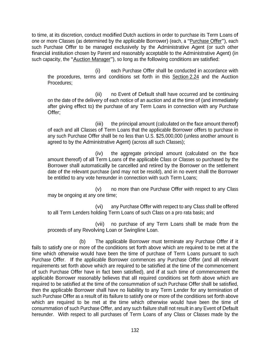 132 to time, at its discretion, conduct modified Dutch auctions in order to purchase its Term Loans of one or more Classes (as determined by the applicable Borrower) (each, a “Purchase Offer”), each such Purchase Offer to be managed exclusively by the Administrative Agent (or such other financial institution chosen by Parent and reasonably acceptable to the Administrative Agent) (in such capacity, the “Auction Manager”), so long as the following conditions are satisfied: (i) each Purchase Offer shall be conducted in accordance with the procedures, terms and conditions set forth in this Section 2.24 and the Auction Procedures; (ii) no Event of Default shall have occurred and be continuing on the date of the delivery of each notice of an auction and at the time of (and immediately after giving effect to) the purchase of any Term Loans in connection with any Purchase Offer; (iii) the principal amount (calculated on the face amount thereof) of each and all Classes of Term Loans that the applicable Borrower offers to purchase in any such Purchase Offer shall be no less than U.S. $25,000,000 (unless another amount is agreed to by the Administrative Agent) (across all such Classes); (iv) the aggregate principal amount (calculated on the face amount thereof) of all Term Loans of the applicable Class or Classes so purchased by the Borrower shall automatically be cancelled and retired by the Borrower on the settlement date of the relevant purchase (and may not be resold), and in no event shall the Borrower be entitled to any vote hereunder in connection with such Term Loans; (v) no more than one Purchase Offer with respect to any Class may be ongoing at any one time; (vi) any Purchase Offer with respect to any Class shall be offered to all Term Lenders holding Term Loans of such Class on a pro rata basis; and (vii) no purchase of any Term Loans shall be made from the proceeds of any Revolving Loan or Swingline Loan. (b) The applicable Borrower must terminate any Purchase Offer if it fails to satisfy one or more of the conditions set forth above which are required to be met at the time which otherwise would have been the time of purchase of Term Loans pursuant to such Purchase Offer. If the applicable Borrower commences any Purchase Offer (and all relevant requirements set forth above which are required to be satisfied at the time of the commencement of such Purchase Offer have in fact been satisfied), and if at such time of commencement the applicable Borrower reasonably believes that all required conditions set forth above which are required to be satisfied at the time of the consummation of such Purchase Offer shall be satisfied, then the applicable Borrower shall have no liability to any Term Lender for any termination of such Purchase Offer as a result of its failure to satisfy one or more of the conditions set forth above which are required to be met at the time which otherwise would have been the time of consummation of such Purchase Offer, and any such failure shall not result in any Event of Default hereunder. With respect to all purchases of Term Loans of any Class or Classes made by the