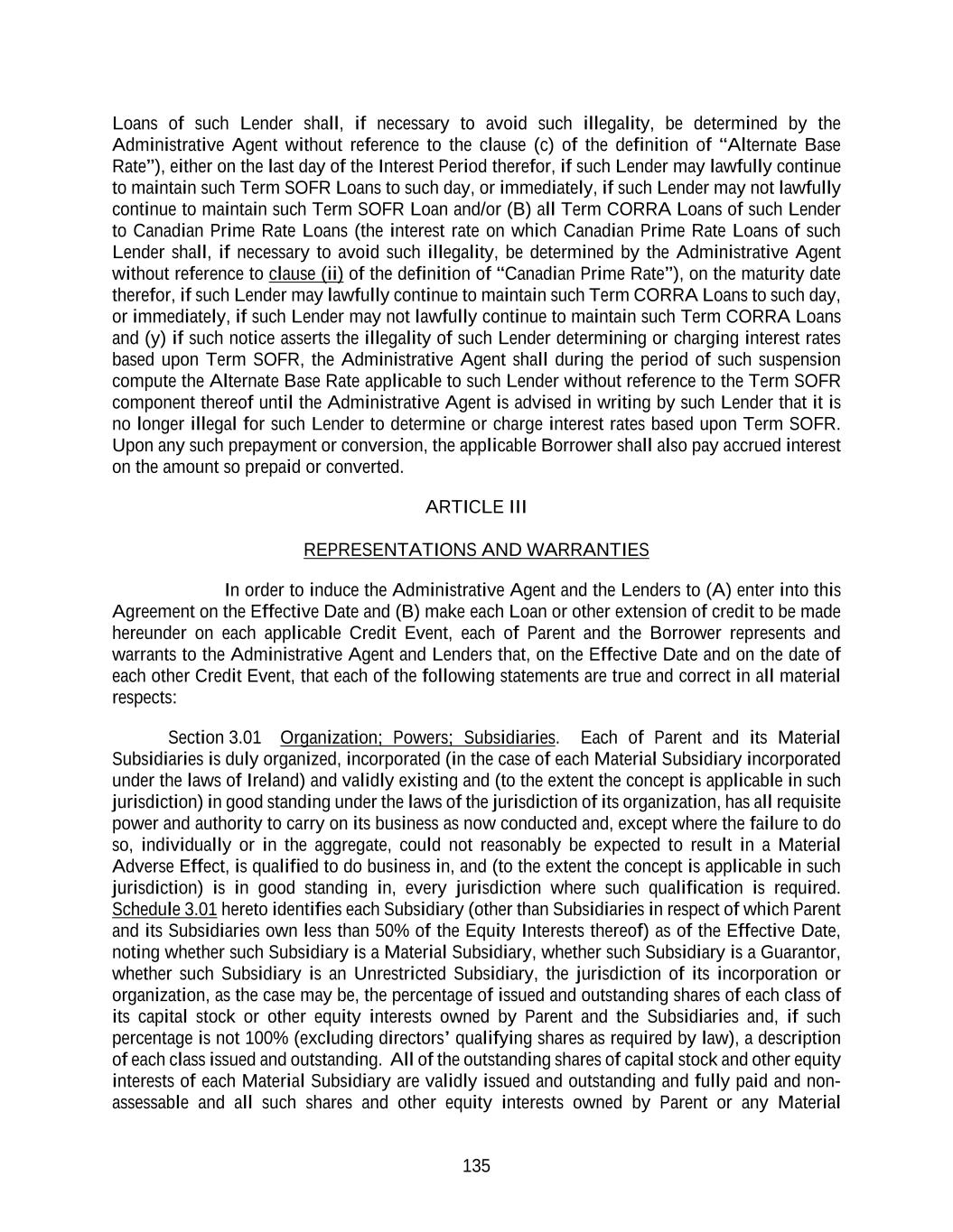 135 Loans of such Lender shall, if necessary to avoid such illegality, be determined by the Administrative Agent without reference to the clause (c) of the definition of “Alternate Base Rate”), either on the last day of the Interest Period therefor, if such Lender may lawfully continue to maintain such Term SOFR Loans to such day, or immediately, if such Lender may not lawfully continue to maintain such Term SOFR Loan and/or (B) all Term CORRA Loans of such Lender to Canadian Prime Rate Loans (the interest rate on which Canadian Prime Rate Loans of such Lender shall, if necessary to avoid such illegality, be determined by the Administrative Agent without reference to clause (ii) of the definition of “Canadian Prime Rate”), on the maturity date therefor, if such Lender may lawfully continue to maintain such Term CORRA Loans to such day, or immediately, if such Lender may not lawfully continue to maintain such Term CORRA Loans and (y) if such notice asserts the illegality of such Lender determining or charging interest rates based upon Term SOFR, the Administrative Agent shall during the period of such suspension compute the Alternate Base Rate applicable to such Lender without reference to the Term SOFR component thereof until the Administrative Agent is advised in writing by such Lender that it is no longer illegal for such Lender to determine or charge interest rates based upon Term SOFR. Upon any such prepayment or conversion, the applicable Borrower shall also pay accrued interest on the amount so prepaid or converted. ARTICLE III REPRESENTATIONS AND WARRANTIES In order to induce the Administrative Agent and the Lenders to (A) enter into this Agreement on the Effective Date and (B) make each Loan or other extension of credit to be made hereunder on each applicable Credit Event, each of Parent and the Borrower represents and warrants to the Administrative Agent and Lenders that, on the Effective Date and on the date of each other Credit Event, that each of the following statements are true and correct in all material respects: Section 3.01 Organization; Powers; Subsidiaries. Each of Parent and its Material Subsidiaries is duly organized, incorporated (in the case of each Material Subsidiary incorporated under the laws of Ireland) and validly existing and (to the extent the concept is applicable in such jurisdiction) in good standing under the laws of the jurisdiction of its organization, has all requisite power and authority to carry on its business as now conducted and, except where the failure to do so, individually or in the aggregate, could not reasonably be expected to result in a Material Adverse Effect, is qualified to do business in, and (to the extent the concept is applicable in such jurisdiction) is in good standing in, every jurisdiction where such qualification is required. Schedule 3.01 hereto identifies each Subsidiary (other than Subsidiaries in respect of which Parent and its Subsidiaries own less than 50% of the Equity Interests thereof) as of the Effective Date, noting whether such Subsidiary is a Material Subsidiary, whether such Subsidiary is a Guarantor, whether such Subsidiary is an Unrestricted Subsidiary, the jurisdiction of its incorporation or organization, as the case may be, the percentage of issued and outstanding shares of each class of its capital stock or other equity interests owned by Parent and the Subsidiaries and, if such percentage is not 100% (excluding directors’ qualifying shares as required by law), a description of each class issued and outstanding. All of the outstanding shares of capital stock and other equity interests of each Material Subsidiary are validly issued and outstanding and fully paid and non- assessable and all such shares and other equity interests owned by Parent or any Material
