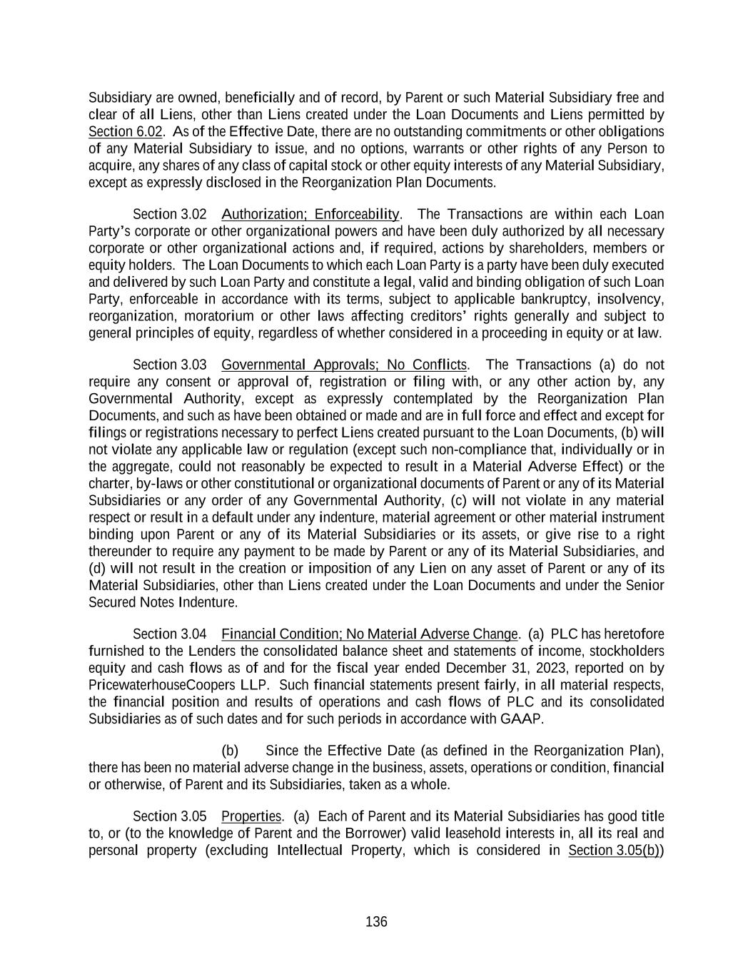 136 Subsidiary are owned, beneficially and of record, by Parent or such Material Subsidiary free and clear of all Liens, other than Liens created under the Loan Documents and Liens permitted by Section 6.02. As of the Effective Date, there are no outstanding commitments or other obligations of any Material Subsidiary to issue, and no options, warrants or other rights of any Person to acquire, any shares of any class of capital stock or other equity interests of any Material Subsidiary, except as expressly disclosed in the Reorganization Plan Documents. Section 3.02 Authorization; Enforceability. The Transactions are within each Loan Party’s corporate or other organizational powers and have been duly authorized by all necessary corporate or other organizational actions and, if required, actions by shareholders, members or equity holders. The Loan Documents to which each Loan Party is a party have been duly executed and delivered by such Loan Party and constitute a legal, valid and binding obligation of such Loan Party, enforceable in accordance with its terms, subject to applicable bankruptcy, insolvency, reorganization, moratorium or other laws affecting creditors’ rights generally and subject to general principles of equity, regardless of whether considered in a proceeding in equity or at law. Section 3.03 Governmental Approvals; No Conflicts. The Transactions (a) do not require any consent or approval of, registration or filing with, or any other action by, any Governmental Authority, except as expressly contemplated by the Reorganization Plan Documents, and such as have been obtained or made and are in full force and effect and except for filings or registrations necessary to perfect Liens created pursuant to the Loan Documents, (b) will not violate any applicable law or regulation (except such non-compliance that, individually or in the aggregate, could not reasonably be expected to result in a Material Adverse Effect) or the charter, by-laws or other constitutional or organizational documents of Parent or any of its Material Subsidiaries or any order of any Governmental Authority, (c) will not violate in any material respect or result in a default under any indenture, material agreement or other material instrument binding upon Parent or any of its Material Subsidiaries or its assets, or give rise to a right thereunder to require any payment to be made by Parent or any of its Material Subsidiaries, and (d) will not result in the creation or imposition of any Lien on any asset of Parent or any of its Material Subsidiaries, other than Liens created under the Loan Documents and under the Senior Secured Notes Indenture. Section 3.04 Financial Condition; No Material Adverse Change. (a) PLC has heretofore furnished to the Lenders the consolidated balance sheet and statements of income, stockholders equity and cash flows as of and for the fiscal year ended December 31, 2023, reported on by PricewaterhouseCoopers LLP. Such financial statements present fairly, in all material respects, the financial position and results of operations and cash flows of PLC and its consolidated Subsidiaries as of such dates and for such periods in accordance with GAAP. (b) Since the Effective Date (as defined in the Reorganization Plan), there has been no material adverse change in the business, assets, operations or condition, financial or otherwise, of Parent and its Subsidiaries, taken as a whole. Section 3.05 Properties. (a) Each of Parent and its Material Subsidiaries has good title to, or (to the knowledge of Parent and the Borrower) valid leasehold interests in, all its real and personal property (excluding Intellectual Property, which is considered in Section 3.05(b))