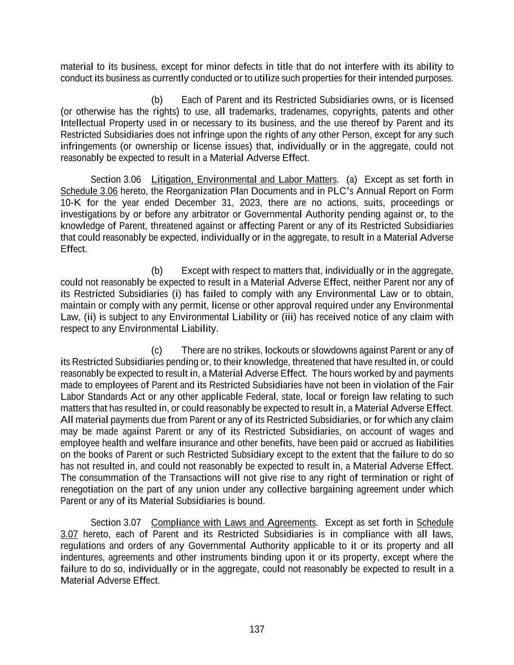 137 material to its business, except for minor defects in title that do not interfere with its ability to conduct its business as currently conducted or to utilize such properties for their intended purposes. (b) Each of Parent and its Restricted Subsidiaries owns, or is licensed (or otherwise has the rights) to use, all trademarks, tradenames, copyrights, patents and other Intellectual Property used in or necessary to its business, and the use thereof by Parent and its Restricted Subsidiaries does not infringe upon the rights of any other Person, except for any such infringements (or ownership or license issues) that, individually or in the aggregate, could not reasonably be expected to result in a Material Adverse Effect. Section 3.06 Litigation, Environmental and Labor Matters. (a) Except as set forth in Schedule 3.06 hereto, the Reorganization Plan Documents and in PLC’s Annual Report on Form 10-K for the year ended December 31, 2023, there are no actions, suits, proceedings or investigations by or before any arbitrator or Governmental Authority pending against or, to the knowledge of Parent, threatened against or affecting Parent or any of its Restricted Subsidiaries that could reasonably be expected, individually or in the aggregate, to result in a Material Adverse Effect. (b) Except with respect to matters that, individually or in the aggregate, could not reasonably be expected to result in a Material Adverse Effect, neither Parent nor any of its Restricted Subsidiaries (i) has failed to comply with any Environmental Law or to obtain, maintain or comply with any permit, license or other approval required under any Environmental Law, (ii) is subject to any Environmental Liability or (iii) has received notice of any claim with respect to any Environmental Liability. (c) There are no strikes, lockouts or slowdowns against Parent or any of its Restricted Subsidiaries pending or, to their knowledge, threatened that have resulted in, or could reasonably be expected to result in, a Material Adverse Effect. The hours worked by and payments made to employees of Parent and its Restricted Subsidiaries have not been in violation of the Fair Labor Standards Act or any other applicable Federal, state, local or foreign law relating to such matters that has resulted in, or could reasonably be expected to result in, a Material Adverse Effect. All material payments due from Parent or any of its Restricted Subsidiaries, or for which any claim may be made against Parent or any of its Restricted Subsidiaries, on account of wages and employee health and welfare insurance and other benefits, have been paid or accrued as liabilities on the books of Parent or such Restricted Subsidiary except to the extent that the failure to do so has not resulted in, and could not reasonably be expected to result in, a Material Adverse Effect. The consummation of the Transactions will not give rise to any right of termination or right of renegotiation on the part of any union under any collective bargaining agreement under which Parent or any of its Material Subsidiaries is bound. Section 3.07 Compliance with Laws and Agreements. Except as set forth in Schedule 3.07 hereto, each of Parent and its Restricted Subsidiaries is in compliance with all laws, regulations and orders of any Governmental Authority applicable to it or its property and all indentures, agreements and other instruments binding upon it or its property, except where the failure to do so, individually or in the aggregate, could not reasonably be expected to result in a Material Adverse Effect.