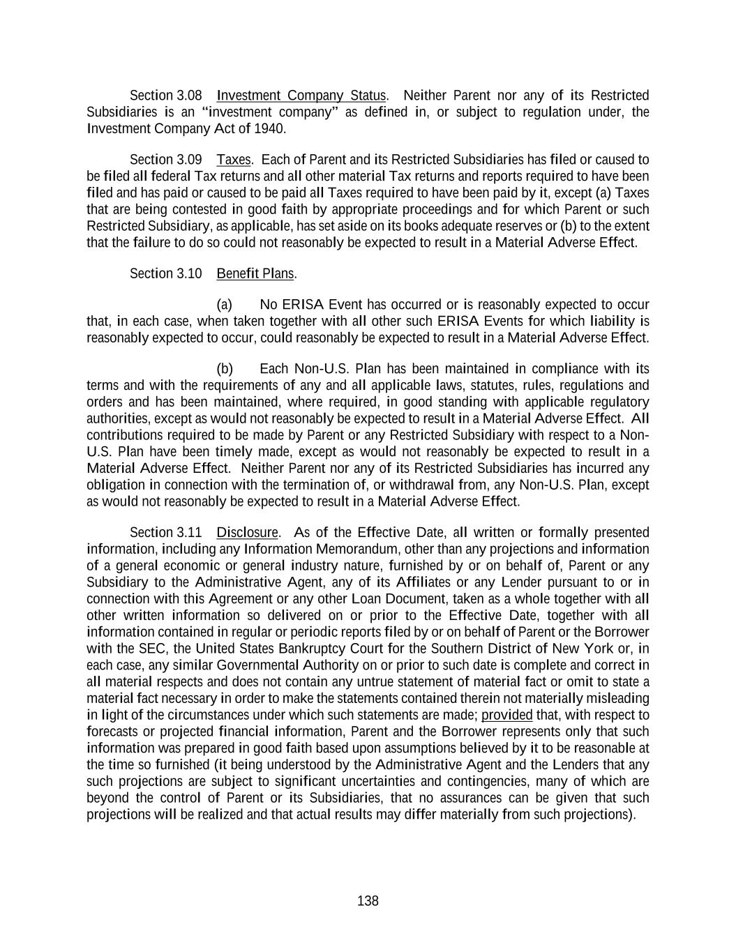 138 Section 3.08 Investment Company Status. Neither Parent nor any of its Restricted Subsidiaries is an “investment company” as defined in, or subject to regulation under, the Investment Company Act of 1940. Section 3.09 Taxes. Each of Parent and its Restricted Subsidiaries has filed or caused to be filed all federal Tax returns and all other material Tax returns and reports required to have been filed and has paid or caused to be paid all Taxes required to have been paid by it, except (a) Taxes that are being contested in good faith by appropriate proceedings and for which Parent or such Restricted Subsidiary, as applicable, has set aside on its books adequate reserves or (b) to the extent that the failure to do so could not reasonably be expected to result in a Material Adverse Effect. Section 3.10 Benefit Plans. (a) No ERISA Event has occurred or is reasonably expected to occur that, in each case, when taken together with all other such ERISA Events for which liability is reasonably expected to occur, could reasonably be expected to result in a Material Adverse Effect. (b) Each Non-U.S. Plan has been maintained in compliance with its terms and with the requirements of any and all applicable laws, statutes, rules, regulations and orders and has been maintained, where required, in good standing with applicable regulatory authorities, except as would not reasonably be expected to result in a Material Adverse Effect. All contributions required to be made by Parent or any Restricted Subsidiary with respect to a Non- U.S. Plan have been timely made, except as would not reasonably be expected to result in a Material Adverse Effect. Neither Parent nor any of its Restricted Subsidiaries has incurred any obligation in connection with the termination of, or withdrawal from, any Non-U.S. Plan, except as would not reasonably be expected to result in a Material Adverse Effect. Section 3.11 Disclosure. As of the Effective Date, all written or formally presented information, including any Information Memorandum, other than any projections and information of a general economic or general industry nature, furnished by or on behalf of, Parent or any Subsidiary to the Administrative Agent, any of its Affiliates or any Lender pursuant to or in connection with this Agreement or any other Loan Document, taken as a whole together with all other written information so delivered on or prior to the Effective Date, together with all information contained in regular or periodic reports filed by or on behalf of Parent or the Borrower with the SEC, the United States Bankruptcy Court for the Southern District of New York or, in each case, any similar Governmental Authority on or prior to such date is complete and correct in all material respects and does not contain any untrue statement of material fact or omit to state a material fact necessary in order to make the statements contained therein not materially misleading in light of the circumstances under which such statements are made; provided that, with respect to forecasts or projected financial information, Parent and the Borrower represents only that such information was prepared in good faith based upon assumptions believed by it to be reasonable at the time so furnished (it being understood by the Administrative Agent and the Lenders that any such projections are subject to significant uncertainties and contingencies, many of which are beyond the control of Parent or its Subsidiaries, that no assurances can be given that such projections will be realized and that actual results may differ materially from such projections).