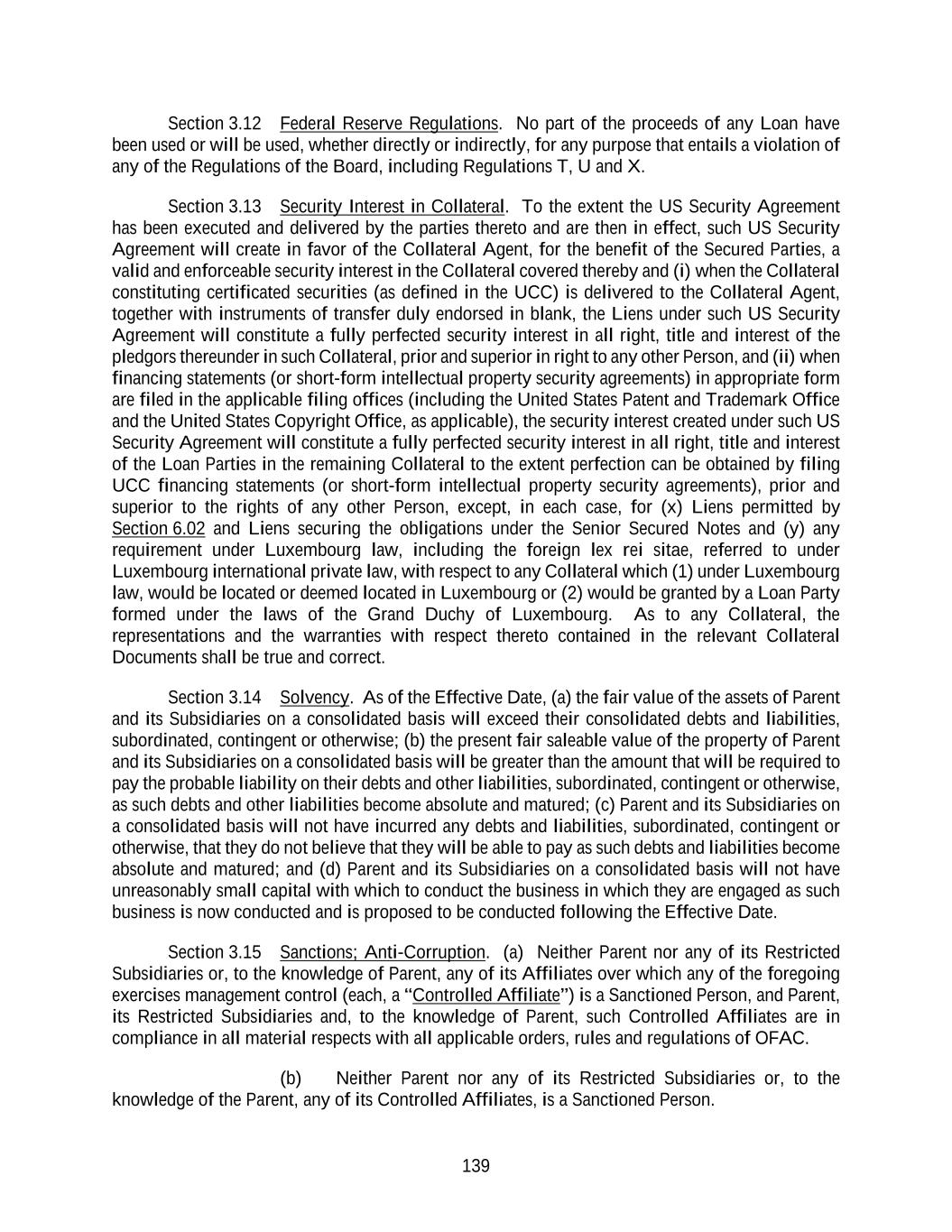 139 Section 3.12 Federal Reserve Regulations. No part of the proceeds of any Loan have been used or will be used, whether directly or indirectly, for any purpose that entails a violation of any of the Regulations of the Board, including Regulations T, U and X. Section 3.13 Security Interest in Collateral. To the extent the US Security Agreement has been executed and delivered by the parties thereto and are then in effect, such US Security Agreement will create in favor of the Collateral Agent, for the benefit of the Secured Parties, a valid and enforceable security interest in the Collateral covered thereby and (i) when the Collateral constituting certificated securities (as defined in the UCC) is delivered to the Collateral Agent, together with instruments of transfer duly endorsed in blank, the Liens under such US Security Agreement will constitute a fully perfected security interest in all right, title and interest of the pledgors thereunder in such Collateral, prior and superior in right to any other Person, and (ii) when financing statements (or short-form intellectual property security agreements) in appropriate form are filed in the applicable filing offices (including the United States Patent and Trademark Office and the United States Copyright Office, as applicable), the security interest created under such US Security Agreement will constitute a fully perfected security interest in all right, title and interest of the Loan Parties in the remaining Collateral to the extent perfection can be obtained by filing UCC financing statements (or short-form intellectual property security agreements), prior and superior to the rights of any other Person, except, in each case, for (x) Liens permitted by Section 6.02 and Liens securing the obligations under the Senior Secured Notes and (y) any requirement under Luxembourg law, including the foreign lex rei sitae, referred to under Luxembourg international private law, with respect to any Collateral which (1) under Luxembourg law, would be located or deemed located in Luxembourg or (2) would be granted by a Loan Party formed under the laws of the Grand Duchy of Luxembourg. As to any Collateral, the representations and the warranties with respect thereto contained in the relevant Collateral Documents shall be true and correct. Section 3.14 Solvency. As of the Effective Date, (a) the fair value of the assets of Parent and its Subsidiaries on a consolidated basis will exceed their consolidated debts and liabilities, subordinated, contingent or otherwise; (b) the present fair saleable value of the property of Parent and its Subsidiaries on a consolidated basis will be greater than the amount that will be required to pay the probable liability on their debts and other liabilities, subordinated, contingent or otherwise, as such debts and other liabilities become absolute and matured; (c) Parent and its Subsidiaries on a consolidated basis will not have incurred any debts and liabilities, subordinated, contingent or otherwise, that they do not believe that they will be able to pay as such debts and liabilities become absolute and matured; and (d) Parent and its Subsidiaries on a consolidated basis will not have unreasonably small capital with which to conduct the business in which they are engaged as such business is now conducted and is proposed to be conducted following the Effective Date. Section 3.15 Sanctions; Anti-Corruption. (a) Neither Parent nor any of its Restricted Subsidiaries or, to the knowledge of Parent, any of its Affiliates over which any of the foregoing exercises management control (each, a “Controlled Affiliate”) is a Sanctioned Person, and Parent, its Restricted Subsidiaries and, to the knowledge of Parent, such Controlled Affiliates are in compliance in all material respects with all applicable orders, rules and regulations of OFAC. (b) Neither Parent nor any of its Restricted Subsidiaries or, to the knowledge of the Parent, any of its Controlled Affiliates, is a Sanctioned Person.