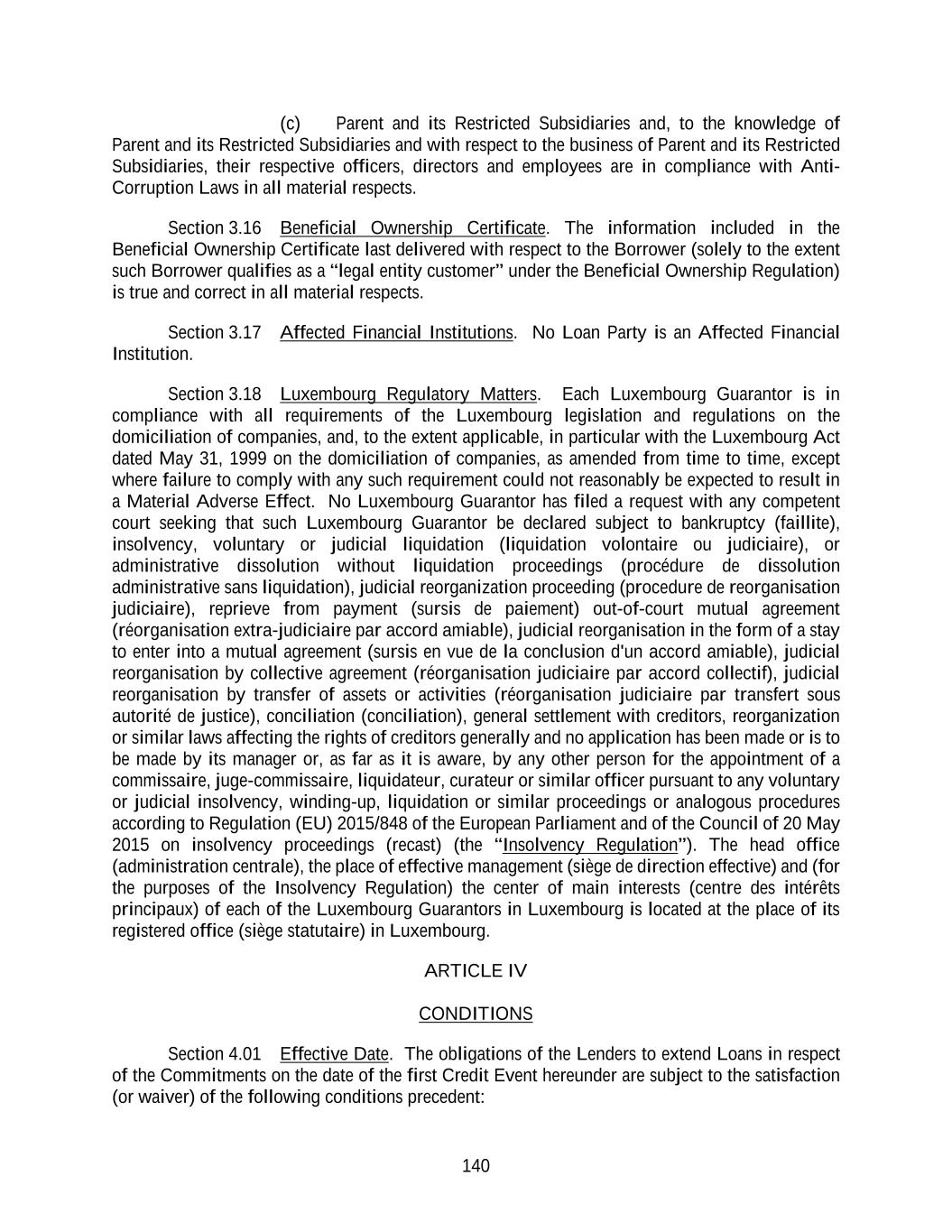 140 (c) Parent and its Restricted Subsidiaries and, to the knowledge of Parent and its Restricted Subsidiaries and with respect to the business of Parent and its Restricted Subsidiaries, their respective officers, directors and employees are in compliance with Anti- Corruption Laws in all material respects. Section 3.16 Beneficial Ownership Certificate. The information included in the Beneficial Ownership Certificate last delivered with respect to the Borrower (solely to the extent such Borrower qualifies as a “legal entity customer” under the Beneficial Ownership Regulation) is true and correct in all material respects. Section 3.17 Affected Financial Institutions. No Loan Party is an Affected Financial Institution. Section 3.18 Luxembourg Regulatory Matters. Each Luxembourg Guarantor is in compliance with all requirements of the Luxembourg legislation and regulations on the domiciliation of companies, and, to the extent applicable, in particular with the Luxembourg Act dated May 31, 1999 on the domiciliation of companies, as amended from time to time, except where failure to comply with any such requirement could not reasonably be expected to result in a Material Adverse Effect. No Luxembourg Guarantor has filed a request with any competent court seeking that such Luxembourg Guarantor be declared subject to bankruptcy (faillite), insolvency, voluntary or judicial liquidation (liquidation volontaire ou judiciaire), or administrative dissolution without liquidation proceedings (procédure de dissolution administrative sans liquidation), judicial reorganization proceeding (procedure de reorganisation judiciaire), reprieve from payment (sursis de paiement) out-of-court mutual agreement (réorganisation extra-judiciaire par accord amiable), judicial reorganisation in the form of a stay to enter into a mutual agreement (sursis en vue de la conclusion d'un accord amiable), judicial reorganisation by collective agreement (réorganisation judiciaire par accord collectif), judicial reorganisation by transfer of assets or activities (réorganisation judiciaire par transfert sous autorité de justice), conciliation (conciliation), general settlement with creditors, reorganization or similar laws affecting the rights of creditors generally and no application has been made or is to be made by its manager or, as far as it is aware, by any other person for the appointment of a commissaire, juge-commissaire, liquidateur, curateur or similar officer pursuant to any voluntary or judicial insolvency, winding-up, liquidation or similar proceedings or analogous procedures according to Regulation (EU) 2015/848 of the European Parliament and of the Council of 20 May 2015 on insolvency proceedings (recast) (the “Insolvency Regulation”). The head office (administration centrale), the place of effective management (siège de direction effective) and (for the purposes of the Insolvency Regulation) the center of main interests (centre des intérêts principaux) of each of the Luxembourg Guarantors in Luxembourg is located at the place of its registered office (siège statutaire) in Luxembourg. ARTICLE IV CONDITIONS Section 4.01 Effective Date. The obligations of the Lenders to extend Loans in respect of the Commitments on the date of the first Credit Event hereunder are subject to the satisfaction (or waiver) of the following conditions precedent: