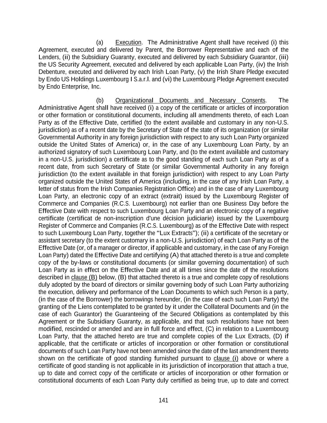 141 (a) Execution. The Administrative Agent shall have received (i) this Agreement, executed and delivered by Parent, the Borrower Representative and each of the Lenders, (ii) the Subsidiary Guaranty, executed and delivered by each Subsidiary Guarantor, (iii) the US Security Agreement, executed and delivered by each applicable Loan Party, (iv) the Irish Debenture, executed and delivered by each Irish Loan Party, (v) the Irish Share Pledge executed by Endo US Holdings Luxembourg I S.a.r.l. and (vi) the Luxembourg Pledge Agreement executed by Endo Enterprise, Inc. (b) Organizational Documents and Necessary Consents. The Administrative Agent shall have received (i) a copy of the certificate or articles of incorporation or other formation or constitutional documents, including all amendments thereto, of each Loan Party as of the Effective Date, certified (to the extent available and customary in any non-U.S. jurisdiction) as of a recent date by the Secretary of State of the state of its organization (or similar Governmental Authority in any foreign jurisdiction with respect to any such Loan Party organized outside the United States of America) or, in the case of any Luxembourg Loan Party, by an authorized signatory of such Luxembourg Loan Party, and (to the extent available and customary in a non-U.S. jurisdiction) a certificate as to the good standing of each such Loan Party as of a recent date, from such Secretary of State (or similar Governmental Authority in any foreign jurisdiction (to the extent available in that foreign jurisdiction) with respect to any Loan Party organized outside the United States of America (including, in the case of any Irish Loan Party, a letter of status from the Irish Companies Registration Office) and in the case of any Luxembourg Loan Party, an electronic copy of an extract (extrait) issued by the Luxembourg Register of Commerce and Companies (R.C.S. Luxembourg) not earlier than one Business Day before the Effective Date with respect to such Luxembourg Loan Party and an electronic copy of a negative certificate (certificat de non-inscription d'une décision judiciarie) issued by the Luxembourg Register of Commerce and Companies (R.C.S. Luxembourg) as of the Effective Date with respect to such Luxembourg Loan Party, together the “Lux Extracts”); (ii) a certificate of the secretary or assistant secretary (to the extent customary in a non-U.S. jurisdiction) of each Loan Party as of the Effective Date (or, of a manager or director, if applicable and customary, in the case of any Foreign Loan Party) dated the Effective Date and certifying (A) that attached thereto is a true and complete copy of the by-laws or constitutional documents (or similar governing documentation) of such Loan Party as in effect on the Effective Date and at all times since the date of the resolutions described in clause (B) below, (B) that attached thereto is a true and complete copy of resolutions duly adopted by the board of directors or similar governing body of such Loan Party authorizing the execution, delivery and performance of the Loan Documents to which such Person is a party, (in the case of the Borrower) the borrowings hereunder, (in the case of each such Loan Party) the granting of the Liens contemplated to be granted by it under the Collateral Documents and (in the case of each Guarantor) the Guaranteeing of the Secured Obligations as contemplated by this Agreement or the Subsidiary Guaranty, as applicable, and that such resolutions have not been modified, rescinded or amended and are in full force and effect, (C) in relation to a Luxembourg Loan Party, that the attached hereto are true and complete copies of the Lux Extracts, (D) if applicable, that the certificate or articles of incorporation or other formation or constitutional documents of such Loan Party have not been amended since the date of the last amendment thereto shown on the certificate of good standing furnished pursuant to clause (i) above or where a certificate of good standing is not applicable in its jurisdiction of incorporation that attach a true, up to date and correct copy of the certificate or articles of incorporation or other formation or constitutional documents of each Loan Party duly certified as being true, up to date and correct