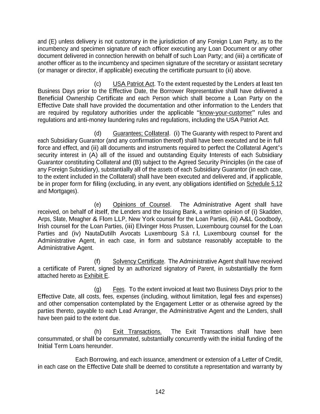 142 and (E) unless delivery is not customary in the jurisdiction of any Foreign Loan Party, as to the incumbency and specimen signature of each officer executing any Loan Document or any other document delivered in connection herewith on behalf of such Loan Party; and (iii) a certificate of another officer as to the incumbency and specimen signature of the secretary or assistant secretary (or manager or director, if applicable) executing the certificate pursuant to (ii) above. (c) USA Patriot Act. To the extent requested by the Lenders at least ten Business Days prior to the Effective Date, the Borrower Representative shall have delivered a Beneficial Ownership Certificate and each Person which shall become a Loan Party on the Effective Date shall have provided the documentation and other information to the Lenders that are required by regulatory authorities under the applicable “know-your-customer” rules and regulations and anti-money laundering rules and regulations, including the USA Patriot Act. (d) Guarantees; Collateral. (i) The Guaranty with respect to Parent and each Subsidiary Guarantor (and any confirmation thereof) shall have been executed and be in full force and effect, and (ii) all documents and instruments required to perfect the Collateral Agent’s security interest in (A) all of the issued and outstanding Equity Interests of each Subsidiary Guarantor constituting Collateral and (B) subject to the Agreed Security Principles (in the case of any Foreign Subsidiary), substantially all of the assets of each Subsidiary Guarantor (in each case, to the extent included in the Collateral) shall have been executed and delivered and, if applicable, be in proper form for filing (excluding, in any event, any obligations identified on Schedule 5.12 and Mortgages). (e) Opinions of Counsel. The Administrative Agent shall have received, on behalf of itself, the Lenders and the Issuing Bank, a written opinion of (i) Skadden, Arps, Slate, Meagher & Flom LLP, New York counsel for the Loan Parties, (ii) A&L Goodbody, Irish counsel for the Loan Parties, (iii) Elvinger Hoss Prussen, Luxembourg counsel for the Loan Parties and (iv) NautaDutilh Avocats Luxembourg S.à r.l, Luxembourg counsel for the Administrative Agent, in each case, in form and substance reasonably acceptable to the Administrative Agent. (f) Solvency Certificate. The Administrative Agent shall have received a certificate of Parent, signed by an authorized signatory of Parent, in substantially the form attached hereto as Exhibit E. (g) Fees. To the extent invoiced at least two Business Days prior to the Effective Date, all costs, fees, expenses (including, without limitation, legal fees and expenses) and other compensation contemplated by the Engagement Letter or as otherwise agreed by the parties thereto, payable to each Lead Arranger, the Administrative Agent and the Lenders, shall have been paid to the extent due. (h) Exit Transactions. The Exit Transactions shall have been consummated, or shall be consummated, substantially concurrently with the initial funding of the Initial Term Loans hereunder. Each Borrowing, and each issuance, amendment or extension of a Letter of Credit, in each case on the Effective Date shall be deemed to constitute a representation and warranty by