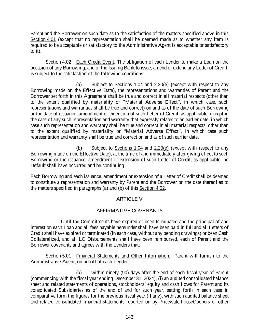 143 Parent and the Borrower on such date as to the satisfaction of the matters specified above in this Section 4.01 (except that no representation shall be deemed made as to whether any item is required to be acceptable or satisfactory to the Administrative Agent is acceptable or satisfactory to it). Section 4.02 Each Credit Event. The obligation of each Lender to make a Loan on the occasion of any Borrowing, and of the Issuing Bank to issue, amend or extend any Letter of Credit, is subject to the satisfaction of the following conditions: (a) Subject to Sections 1.04 and 2.20(e) (except with respect to any Borrowing made on the Effective Date), the representations and warranties of Parent and the Borrower set forth in this Agreement shall be true and correct in all material respects (other than to the extent qualified by materiality or “Material Adverse Effect”, in which case, such representations and warranties shall be true and correct) on and as of the date of such Borrowing or the date of issuance, amendment or extension of such Letter of Credit, as applicable, except in the case of any such representation and warranty that expressly relates to an earlier date, in which case such representation and warranty shall be true and correct in all material respects, other than to the extent qualified by materiality or “Material Adverse Effect”, in which case such representation and warranty shall be true and correct on and as of such earlier date. (b) Subject to Sections 1.04 and 2.20(e) (except with respect to any Borrowing made on the Effective Date), at the time of and immediately after giving effect to such Borrowing or the issuance, amendment or extension of such Letter of Credit, as applicable, no Default shall have occurred and be continuing. Each Borrowing and each issuance, amendment or extension of a Letter of Credit shall be deemed to constitute a representation and warranty by Parent and the Borrower on the date thereof as to the matters specified in paragraphs (a) and (b) of this Section 4.02. ARTICLE V AFFIRMATIVE COVENANTS Until the Commitments have expired or been terminated and the principal of and interest on each Loan and all fees payable hereunder shall have been paid in full and all Letters of Credit shall have expired or terminated (in each case, without any pending drawings) or been Cash Collateralized, and all LC Disbursements shall have been reimbursed, each of Parent and the Borrower covenants and agrees with the Lenders that: Section 5.01 Financial Statements and Other Information. Parent will furnish to the Administrative Agent, on behalf of each Lender: (a) within ninety (90) days after the end of each fiscal year of Parent (commencing with the fiscal year ending December 31, 2024), (i) an audited consolidated balance sheet and related statements of operations, stockholders’ equity and cash flows for Parent and its consolidated Subsidiaries as of the end of and for such year, setting forth in each case in comparative form the figures for the previous fiscal year (if any), with such audited balance sheet and related consolidated financial statements reported on by PricewaterhouseCoopers or other