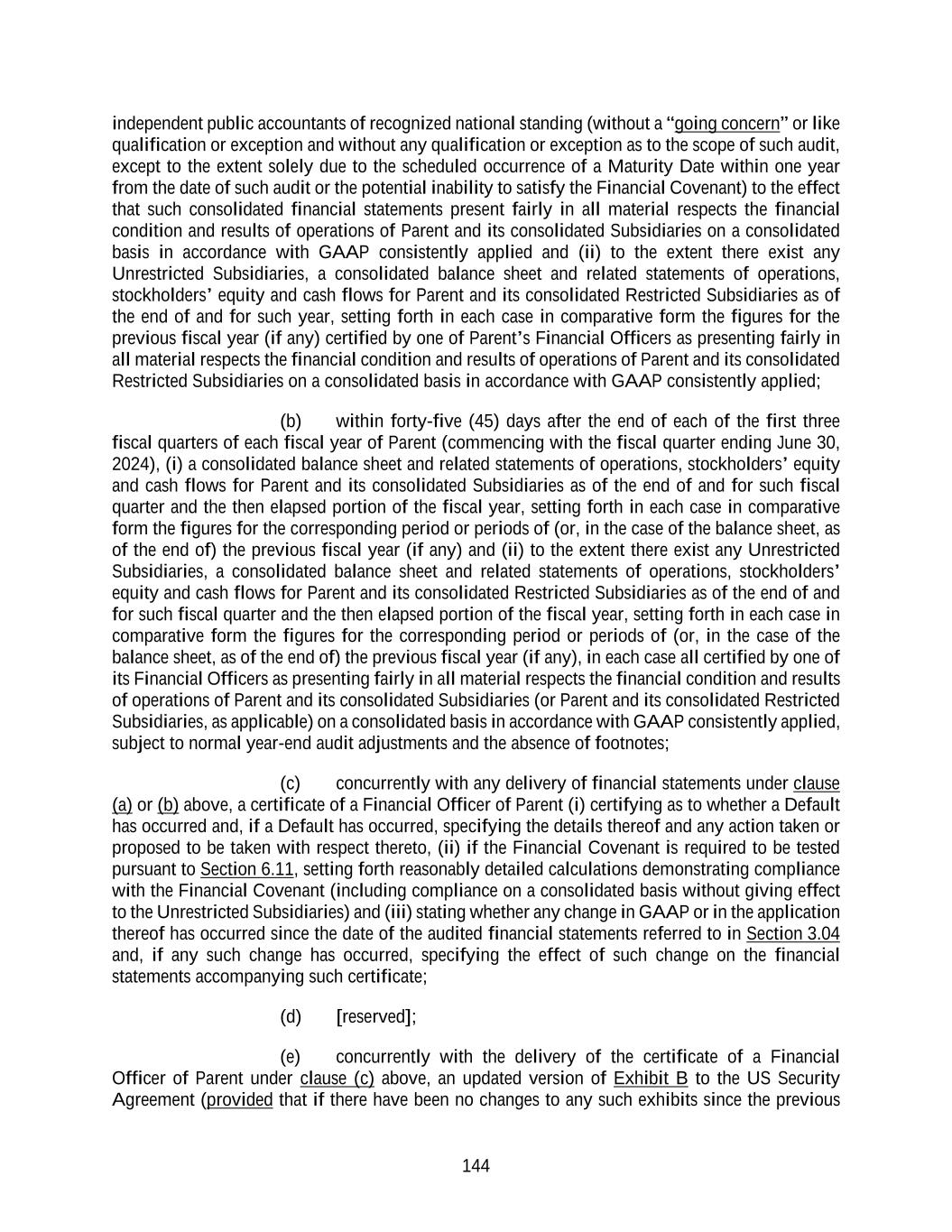 144 independent public accountants of recognized national standing (without a “going concern” or like qualification or exception and without any qualification or exception as to the scope of such audit, except to the extent solely due to the scheduled occurrence of a Maturity Date within one year from the date of such audit or the potential inability to satisfy the Financial Covenant) to the effect that such consolidated financial statements present fairly in all material respects the financial condition and results of operations of Parent and its consolidated Subsidiaries on a consolidated basis in accordance with GAAP consistently applied and (ii) to the extent there exist any Unrestricted Subsidiaries, a consolidated balance sheet and related statements of operations, stockholders’ equity and cash flows for Parent and its consolidated Restricted Subsidiaries as of the end of and for such year, setting forth in each case in comparative form the figures for the previous fiscal year (if any) certified by one of Parent’s Financial Officers as presenting fairly in all material respects the financial condition and results of operations of Parent and its consolidated Restricted Subsidiaries on a consolidated basis in accordance with GAAP consistently applied; (b) within forty-five (45) days after the end of each of the first three fiscal quarters of each fiscal year of Parent (commencing with the fiscal quarter ending June 30, 2024), (i) a consolidated balance sheet and related statements of operations, stockholders’ equity and cash flows for Parent and its consolidated Subsidiaries as of the end of and for such fiscal quarter and the then elapsed portion of the fiscal year, setting forth in each case in comparative form the figures for the corresponding period or periods of (or, in the case of the balance sheet, as of the end of) the previous fiscal year (if any) and (ii) to the extent there exist any Unrestricted Subsidiaries, a consolidated balance sheet and related statements of operations, stockholders’ equity and cash flows for Parent and its consolidated Restricted Subsidiaries as of the end of and for such fiscal quarter and the then elapsed portion of the fiscal year, setting forth in each case in comparative form the figures for the corresponding period or periods of (or, in the case of the balance sheet, as of the end of) the previous fiscal year (if any), in each case all certified by one of its Financial Officers as presenting fairly in all material respects the financial condition and results of operations of Parent and its consolidated Subsidiaries (or Parent and its consolidated Restricted Subsidiaries, as applicable) on a consolidated basis in accordance with GAAP consistently applied, subject to normal year-end audit adjustments and the absence of footnotes; (c) concurrently with any delivery of financial statements under clause (a) or (b) above, a certificate of a Financial Officer of Parent (i) certifying as to whether a Default has occurred and, if a Default has occurred, specifying the details thereof and any action taken or proposed to be taken with respect thereto, (ii) if the Financial Covenant is required to be tested pursuant to Section 6.11, setting forth reasonably detailed calculations demonstrating compliance with the Financial Covenant (including compliance on a consolidated basis without giving effect to the Unrestricted Subsidiaries) and (iii) stating whether any change in GAAP or in the application thereof has occurred since the date of the audited financial statements referred to in Section 3.04 and, if any such change has occurred, specifying the effect of such change on the financial statements accompanying such certificate; (d) [reserved]; (e) concurrently with the delivery of the certificate of a Financial Officer of Parent under clause (c) above, an updated version of Exhibit B to the US Security Agreement (provided that if there have been no changes to any such exhibits since the previous