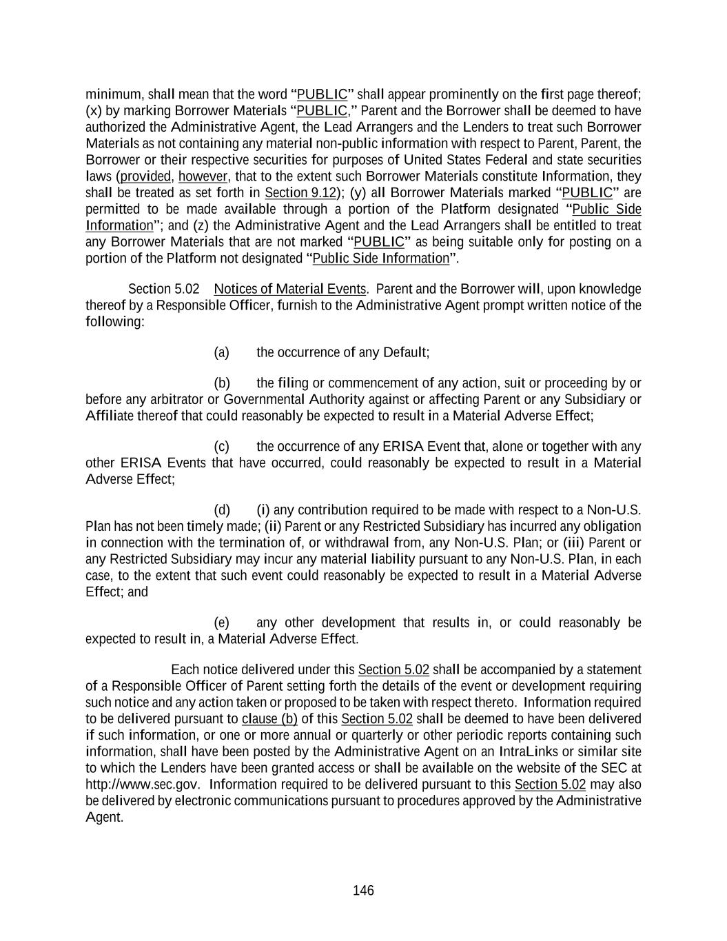 146 minimum, shall mean that the word “PUBLIC” shall appear prominently on the first page thereof; (x) by marking Borrower Materials “PUBLIC,” Parent and the Borrower shall be deemed to have authorized the Administrative Agent, the Lead Arrangers and the Lenders to treat such Borrower Materials as not containing any material non-public information with respect to Parent, Parent, the Borrower or their respective securities for purposes of United States Federal and state securities laws (provided, however, that to the extent such Borrower Materials constitute Information, they shall be treated as set forth in Section 9.12); (y) all Borrower Materials marked “PUBLIC” are permitted to be made available through a portion of the Platform designated “Public Side Information”; and (z) the Administrative Agent and the Lead Arrangers shall be entitled to treat any Borrower Materials that are not marked “PUBLIC” as being suitable only for posting on a portion of the Platform not designated “Public Side Information”. Section 5.02 Notices of Material Events. Parent and the Borrower will, upon knowledge thereof by a Responsible Officer, furnish to the Administrative Agent prompt written notice of the following: (a) the occurrence of any Default; (b) the filing or commencement of any action, suit or proceeding by or before any arbitrator or Governmental Authority against or affecting Parent or any Subsidiary or Affiliate thereof that could reasonably be expected to result in a Material Adverse Effect; (c) the occurrence of any ERISA Event that, alone or together with any other ERISA Events that have occurred, could reasonably be expected to result in a Material Adverse Effect; (d) (i) any contribution required to be made with respect to a Non-U.S. Plan has not been timely made; (ii) Parent or any Restricted Subsidiary has incurred any obligation in connection with the termination of, or withdrawal from, any Non-U.S. Plan; or (iii) Parent or any Restricted Subsidiary may incur any material liability pursuant to any Non-U.S. Plan, in each case, to the extent that such event could reasonably be expected to result in a Material Adverse Effect; and (e) any other development that results in, or could reasonably be expected to result in, a Material Adverse Effect. Each notice delivered under this Section 5.02 shall be accompanied by a statement of a Responsible Officer of Parent setting forth the details of the event or development requiring such notice and any action taken or proposed to be taken with respect thereto. Information required to be delivered pursuant to clause (b) of this Section 5.02 shall be deemed to have been delivered if such information, or one or more annual or quarterly or other periodic reports containing such information, shall have been posted by the Administrative Agent on an IntraLinks or similar site to which the Lenders have been granted access or shall be available on the website of the SEC at http://www.sec.gov. Information required to be delivered pursuant to this Section 5.02 may also be delivered by electronic communications pursuant to procedures approved by the Administrative Agent.