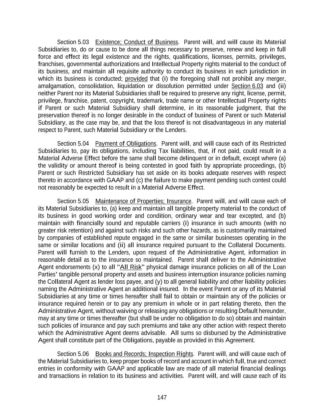 147 Section 5.03 Existence; Conduct of Business. Parent will, and will cause its Material Subsidiaries to, do or cause to be done all things necessary to preserve, renew and keep in full force and effect its legal existence and the rights, qualifications, licenses, permits, privileges, franchises, governmental authorizations and Intellectual Property rights material to the conduct of its business, and maintain all requisite authority to conduct its business in each jurisdiction in which its business is conducted; provided that (i) the foregoing shall not prohibit any merger, amalgamation, consolidation, liquidation or dissolution permitted under Section 6.03 and (ii) neither Parent nor its Material Subsidiaries shall be required to preserve any right, license, permit, privilege, franchise, patent, copyright, trademark, trade name or other Intellectual Property rights if Parent or such Material Subsidiary shall determine, in its reasonable judgment, that the preservation thereof is no longer desirable in the conduct of business of Parent or such Material Subsidiary, as the case may be, and that the loss thereof is not disadvantageous in any material respect to Parent, such Material Subsidiary or the Lenders. Section 5.04 Payment of Obligations. Parent will, and will cause each of its Restricted Subsidiaries to, pay its obligations, including Tax liabilities, that, if not paid, could result in a Material Adverse Effect before the same shall become delinquent or in default, except where (a) the validity or amount thereof is being contested in good faith by appropriate proceedings, (b) Parent or such Restricted Subsidiary has set aside on its books adequate reserves with respect thereto in accordance with GAAP and (c) the failure to make payment pending such contest could not reasonably be expected to result in a Material Adverse Effect. Section 5.05 Maintenance of Properties; Insurance. Parent will, and will cause each of its Material Subsidiaries to, (a) keep and maintain all tangible property material to the conduct of its business in good working order and condition, ordinary wear and tear excepted, and (b) maintain with financially sound and reputable carriers (i) insurance in such amounts (with no greater risk retention) and against such risks and such other hazards, as is customarily maintained by companies of established repute engaged in the same or similar businesses operating in the same or similar locations and (ii) all insurance required pursuant to the Collateral Documents. Parent will furnish to the Lenders, upon request of the Administrative Agent, information in reasonable detail as to the insurance so maintained. Parent shall deliver to the Administrative Agent endorsements (x) to all “All Risk” physical damage insurance policies on all of the Loan Parties’ tangible personal property and assets and business interruption insurance policies naming the Collateral Agent as lender loss payee, and (y) to all general liability and other liability policies naming the Administrative Agent an additional insured. In the event Parent or any of its Material Subsidiaries at any time or times hereafter shall fail to obtain or maintain any of the policies or insurance required herein or to pay any premium in whole or in part relating thereto, then the Administrative Agent, without waiving or releasing any obligations or resulting Default hereunder, may at any time or times thereafter (but shall be under no obligation to do so) obtain and maintain such policies of insurance and pay such premiums and take any other action with respect thereto which the Administrative Agent deems advisable. All sums so disbursed by the Administrative Agent shall constitute part of the Obligations, payable as provided in this Agreement. Section 5.06 Books and Records; Inspection Rights. Parent will, and will cause each of the Material Subsidiaries to, keep proper books of record and account in which full, true and correct entries in conformity with GAAP and applicable law are made of all material financial dealings and transactions in relation to its business and activities. Parent will, and will cause each of its
