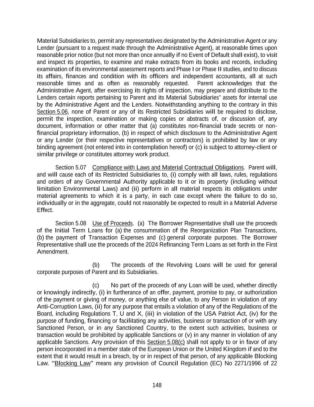 148 Material Subsidiaries to, permit any representatives designated by the Administrative Agent or any Lender (pursuant to a request made through the Administrative Agent), at reasonable times upon reasonable prior notice (but not more than once annually if no Event of Default shall exist), to visit and inspect its properties, to examine and make extracts from its books and records, including examination of its environmental assessment reports and Phase I or Phase II studies, and to discuss its affairs, finances and condition with its officers and independent accountants, all at such reasonable times and as often as reasonably requested. Parent acknowledges that the Administrative Agent, after exercising its rights of inspection, may prepare and distribute to the Lenders certain reports pertaining to Parent and its Material Subsidiaries’ assets for internal use by the Administrative Agent and the Lenders. Notwithstanding anything to the contrary in this Section 5.06, none of Parent or any of its Restricted Subsidiaries will be required to disclose, permit the inspection, examination or making copies or abstracts of, or discussion of, any document, information or other matter that (a) constitutes non-financial trade secrets or non- financial proprietary information, (b) in respect of which disclosure to the Administrative Agent or any Lender (or their respective representatives or contractors) is prohibited by law or any binding agreement (not entered into in contemplation hereof) or (c) is subject to attorney-client or similar privilege or constitutes attorney work product. Section 5.07 Compliance with Laws and Material Contractual Obligations. Parent will, and will cause each of its Restricted Subsidiaries to, (i) comply with all laws, rules, regulations and orders of any Governmental Authority applicable to it or its property (including without limitation Environmental Laws) and (ii) perform in all material respects its obligations under material agreements to which it is a party, in each case except where the failure to do so, individually or in the aggregate, could not reasonably be expected to result in a Material Adverse Effect. Section 5.08 Use of Proceeds. (a) The Borrower Representative shall use the proceeds of the Initial Term Loans for (a) the consummation of the Reorganization Plan Transactions, (b) the payment of Transaction Expenses and (c) general corporate purposes. The Borrower Representative shall use the proceeds of the 2024 Refinancing Term Loans as set forth in the First Amendment. (b) The proceeds of the Revolving Loans will be used for general corporate purposes of Parent and its Subsidiaries. (c) No part of the proceeds of any Loan will be used, whether directly or knowingly indirectly, (i) in furtherance of an offer, payment, promise to pay, or authorization of the payment or giving of money, or anything else of value, to any Person in violation of any Anti-Corruption Laws, (ii) for any purpose that entails a violation of any of the Regulations of the Board, including Regulations T, U and X, (iii) in violation of the USA Patriot Act, (iv) for the purpose of funding, financing or facilitating any activities, business or transaction of or with any Sanctioned Person, or in any Sanctioned Country, to the extent such activities, business or transaction would be prohibited by applicable Sanctions or (v) in any manner in violation of any applicable Sanctions. Any provision of this Section 5.08(c) shall not apply to or in favor of any person incorporated in a member state of the European Union or the United Kingdom if and to the extent that it would result in a breach, by or in respect of that person, of any applicable Blocking Law. “Blocking Law” means any provision of Council Regulation (EC) No 2271/1996 of 22