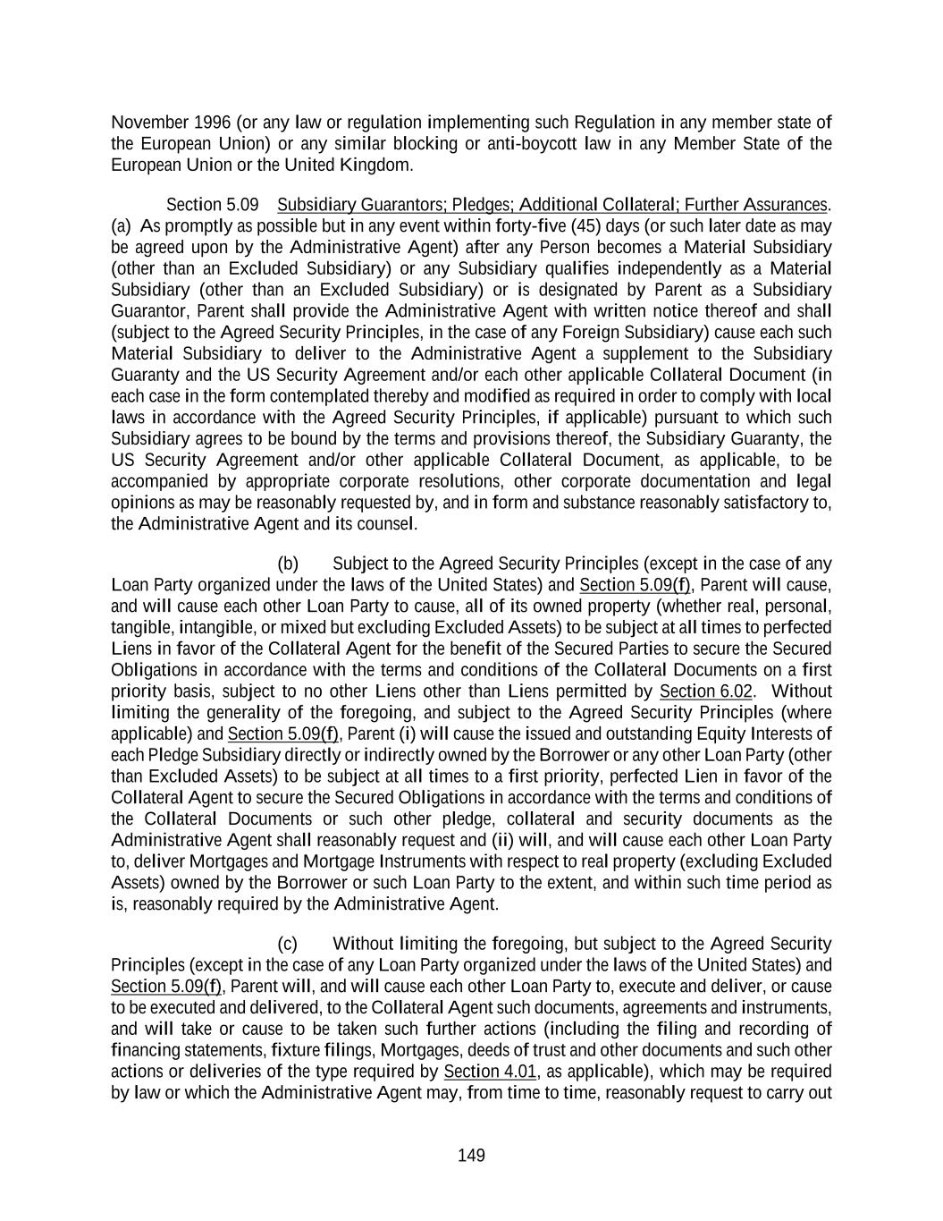 149 November 1996 (or any law or regulation implementing such Regulation in any member state of the European Union) or any similar blocking or anti-boycott law in any Member State of the European Union or the United Kingdom. Section 5.09 Subsidiary Guarantors; Pledges; Additional Collateral; Further Assurances. (a) As promptly as possible but in any event within forty-five (45) days (or such later date as may be agreed upon by the Administrative Agent) after any Person becomes a Material Subsidiary (other than an Excluded Subsidiary) or any Subsidiary qualifies independently as a Material Subsidiary (other than an Excluded Subsidiary) or is designated by Parent as a Subsidiary Guarantor, Parent shall provide the Administrative Agent with written notice thereof and shall (subject to the Agreed Security Principles, in the case of any Foreign Subsidiary) cause each such Material Subsidiary to deliver to the Administrative Agent a supplement to the Subsidiary Guaranty and the US Security Agreement and/or each other applicable Collateral Document (in each case in the form contemplated thereby and modified as required in order to comply with local laws in accordance with the Agreed Security Principles, if applicable) pursuant to which such Subsidiary agrees to be bound by the terms and provisions thereof, the Subsidiary Guaranty, the US Security Agreement and/or other applicable Collateral Document, as applicable, to be accompanied by appropriate corporate resolutions, other corporate documentation and legal opinions as may be reasonably requested by, and in form and substance reasonably satisfactory to, the Administrative Agent and its counsel. (b) Subject to the Agreed Security Principles (except in the case of any Loan Party organized under the laws of the United States) and Section 5.09(f), Parent will cause, and will cause each other Loan Party to cause, all of its owned property (whether real, personal, tangible, intangible, or mixed but excluding Excluded Assets) to be subject at all times to perfected Liens in favor of the Collateral Agent for the benefit of the Secured Parties to secure the Secured Obligations in accordance with the terms and conditions of the Collateral Documents on a first priority basis, subject to no other Liens other than Liens permitted by Section 6.02. Without limiting the generality of the foregoing, and subject to the Agreed Security Principles (where applicable) and Section 5.09(f), Parent (i) will cause the issued and outstanding Equity Interests of each Pledge Subsidiary directly or indirectly owned by the Borrower or any other Loan Party (other than Excluded Assets) to be subject at all times to a first priority, perfected Lien in favor of the Collateral Agent to secure the Secured Obligations in accordance with the terms and conditions of the Collateral Documents or such other pledge, collateral and security documents as the Administrative Agent shall reasonably request and (ii) will, and will cause each other Loan Party to, deliver Mortgages and Mortgage Instruments with respect to real property (excluding Excluded Assets) owned by the Borrower or such Loan Party to the extent, and within such time period as is, reasonably required by the Administrative Agent. (c) Without limiting the foregoing, but subject to the Agreed Security Principles (except in the case of any Loan Party organized under the laws of the United States) and Section 5.09(f), Parent will, and will cause each other Loan Party to, execute and deliver, or cause to be executed and delivered, to the Collateral Agent such documents, agreements and instruments, and will take or cause to be taken such further actions (including the filing and recording of financing statements, fixture filings, Mortgages, deeds of trust and other documents and such other actions or deliveries of the type required by Section 4.01, as applicable), which may be required by law or which the Administrative Agent may, from time to time, reasonably request to carry out