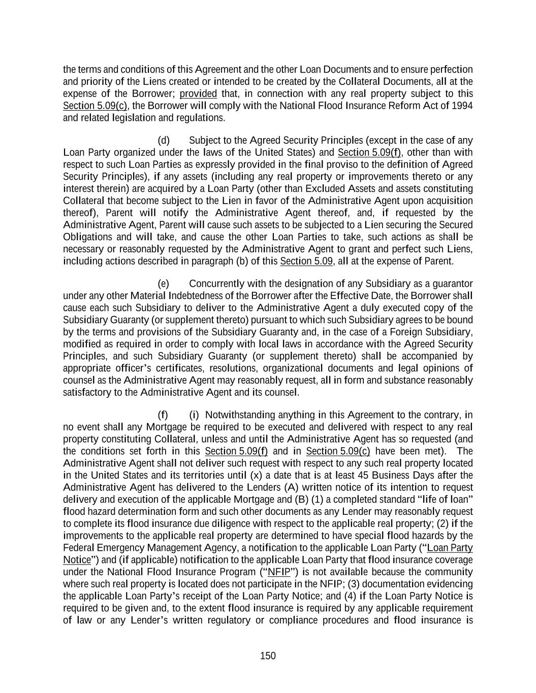 150 the terms and conditions of this Agreement and the other Loan Documents and to ensure perfection and priority of the Liens created or intended to be created by the Collateral Documents, all at the expense of the Borrower; provided that, in connection with any real property subject to this Section 5.09(c), the Borrower will comply with the National Flood Insurance Reform Act of 1994 and related legislation and regulations. (d) Subject to the Agreed Security Principles (except in the case of any Loan Party organized under the laws of the United States) and Section 5.09(f), other than with respect to such Loan Parties as expressly provided in the final proviso to the definition of Agreed Security Principles), if any assets (including any real property or improvements thereto or any interest therein) are acquired by a Loan Party (other than Excluded Assets and assets constituting Collateral that become subject to the Lien in favor of the Administrative Agent upon acquisition thereof), Parent will notify the Administrative Agent thereof, and, if requested by the Administrative Agent, Parent will cause such assets to be subjected to a Lien securing the Secured Obligations and will take, and cause the other Loan Parties to take, such actions as shall be necessary or reasonably requested by the Administrative Agent to grant and perfect such Liens, including actions described in paragraph (b) of this Section 5.09, all at the expense of Parent. (e) Concurrently with the designation of any Subsidiary as a guarantor under any other Material Indebtedness of the Borrower after the Effective Date, the Borrower shall cause each such Subsidiary to deliver to the Administrative Agent a duly executed copy of the Subsidiary Guaranty (or supplement thereto) pursuant to which such Subsidiary agrees to be bound by the terms and provisions of the Subsidiary Guaranty and, in the case of a Foreign Subsidiary, modified as required in order to comply with local laws in accordance with the Agreed Security Principles, and such Subsidiary Guaranty (or supplement thereto) shall be accompanied by appropriate officer’s certificates, resolutions, organizational documents and legal opinions of counsel as the Administrative Agent may reasonably request, all in form and substance reasonably satisfactory to the Administrative Agent and its counsel. (f) (i) Notwithstanding anything in this Agreement to the contrary, in no event shall any Mortgage be required to be executed and delivered with respect to any real property constituting Collateral, unless and until the Administrative Agent has so requested (and the conditions set forth in this Section 5.09(f) and in Section 5.09(c) have been met). The Administrative Agent shall not deliver such request with respect to any such real property located in the United States and its territories until (x) a date that is at least 45 Business Days after the Administrative Agent has delivered to the Lenders (A) written notice of its intention to request delivery and execution of the applicable Mortgage and (B) (1) a completed standard “life of loan” flood hazard determination form and such other documents as any Lender may reasonably request to complete its flood insurance due diligence with respect to the applicable real property; (2) if the improvements to the applicable real property are determined to have special flood hazards by the Federal Emergency Management Agency, a notification to the applicable Loan Party (“Loan Party Notice”) and (if applicable) notification to the applicable Loan Party that flood insurance coverage under the National Flood Insurance Program (“NFIP”) is not available because the community where such real property is located does not participate in the NFIP; (3) documentation evidencing the applicable Loan Party’s receipt of the Loan Party Notice; and (4) if the Loan Party Notice is required to be given and, to the extent flood insurance is required by any applicable requirement of law or any Lender’s written regulatory or compliance procedures and flood insurance is