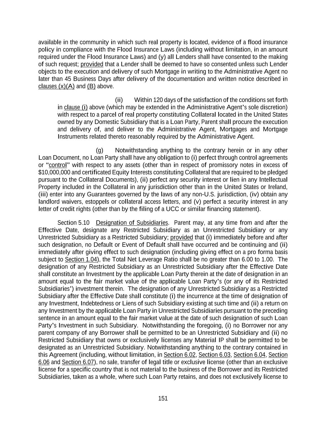 151 available in the community in which such real property is located, evidence of a flood insurance policy in compliance with the Flood Insurance Laws (including without limitation, in an amount required under the Flood Insurance Laws) and (y) all Lenders shall have consented to the making of such request; provided that a Lender shall be deemed to have so consented unless such Lender objects to the execution and delivery of such Mortgage in writing to the Administrative Agent no later than 45 Business Days after delivery of the documentation and written notice described in clauses (x)(A) and (B) above. (ii) Within 120 days of the satisfaction of the conditions set forth in clause (i) above (which may be extended in the Administrative Agent’s sole discretion) with respect to a parcel of real property constituting Collateral located in the United States owned by any Domestic Subsidiary that is a Loan Party, Parent shall procure the execution and delivery of, and deliver to the Administrative Agent, Mortgages and Mortgage Instruments related thereto reasonably required by the Administrative Agent. (g) Notwithstanding anything to the contrary herein or in any other Loan Document, no Loan Party shall have any obligation to (i) perfect through control agreements or “control” with respect to any assets (other than in respect of promissory notes in excess of $10,000,000 and certificated Equity Interests constituting Collateral that are required to be pledged pursuant to the Collateral Documents), (ii) perfect any security interest or lien in any Intellectual Property included in the Collateral in any jurisdiction other than in the United States or Ireland, (iii) enter into any Guarantees governed by the laws of any non-U.S. jurisdiction, (iv) obtain any landlord waivers, estoppels or collateral access letters, and (v) perfect a security interest in any letter of credit rights (other than by the filing of a UCC or similar financing statement). Section 5.10 Designation of Subsidiaries. Parent may, at any time from and after the Effective Date, designate any Restricted Subsidiary as an Unrestricted Subsidiary or any Unrestricted Subsidiary as a Restricted Subsidiary; provided that (i) immediately before and after such designation, no Default or Event of Default shall have occurred and be continuing and (ii) immediately after giving effect to such designation (including giving effect on a pro forma basis subject to Section 1.04), the Total Net Leverage Ratio shall be no greater than 6.00 to 1.00. The designation of any Restricted Subsidiary as an Unrestricted Subsidiary after the Effective Date shall constitute an Investment by the applicable Loan Party therein at the date of designation in an amount equal to the fair market value of the applicable Loan Party’s (or any of its Restricted Subsidiaries’) investment therein. The designation of any Unrestricted Subsidiary as a Restricted Subsidiary after the Effective Date shall constitute (i) the incurrence at the time of designation of any Investment, Indebtedness or Liens of such Subsidiary existing at such time and (ii) a return on any Investment by the applicable Loan Party in Unrestricted Subsidiaries pursuant to the preceding sentence in an amount equal to the fair market value at the date of such designation of such Loan Party’s Investment in such Subsidiary. Notwithstanding the foregoing, (i) no Borrower nor any parent company of any Borrower shall be permitted to be an Unrestricted Subsidiary and (ii) no Restricted Subsidiary that owns or exclusively licenses any Material IP shall be permitted to be designated as an Unrestricted Subsidiary. Notwithstanding anything to the contrary contained in this Agreement (including, without limitation, in Section 6.02, Section 6.03, Section 6.04, Section 6.06 and Section 6.07), no sale, transfer of legal title or exclusive license (other than an exclusive license for a specific country that is not material to the business of the Borrower and its Restricted Subsidiaries, taken as a whole, where such Loan Party retains, and does not exclusively license to