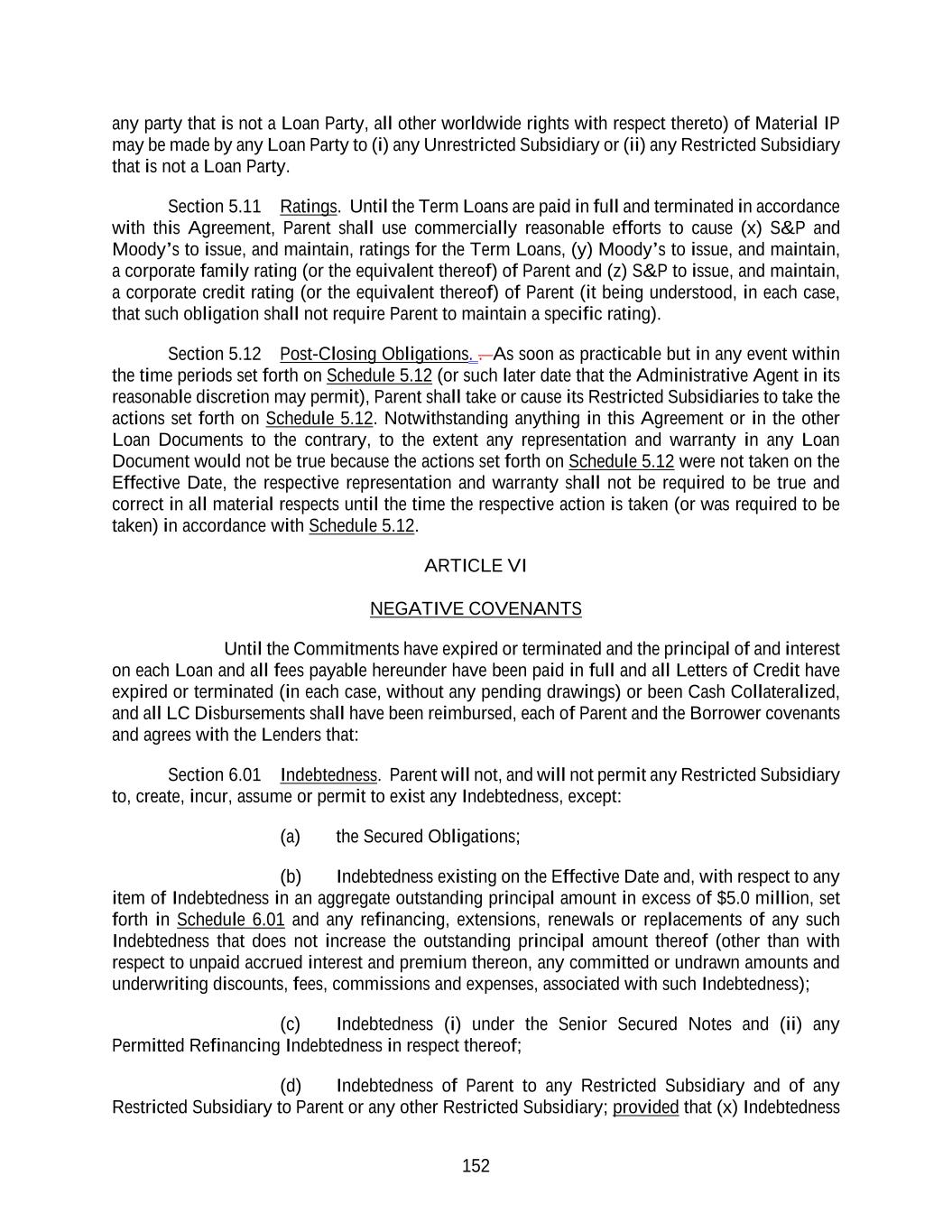 152 any party that is not a Loan Party, all other worldwide rights with respect thereto) of Material IP may be made by any Loan Party to (i) any Unrestricted Subsidiary or (ii) any Restricted Subsidiary that is not a Loan Party. Section 5.11 Ratings. Until the Term Loans are paid in full and terminated in accordance with this Agreement, Parent shall use commercially reasonable efforts to cause (x) S&P and Moody’s to issue, and maintain, ratings for the Term Loans, (y) Moody’s to issue, and maintain, a corporate family rating (or the equivalent thereof) of Parent and (z) S&P to issue, and maintain, a corporate credit rating (or the equivalent thereof) of Parent (it being understood, in each case, that such obligation shall not require Parent to maintain a specific rating). Section 5.12 Post-Closing Obligations. . As soon as practicable but in any event within the time periods set forth on Schedule 5.12 (or such later date that the Administrative Agent in its reasonable discretion may permit), Parent shall take or cause its Restricted Subsidiaries to take the actions set forth on Schedule 5.12. Notwithstanding anything in this Agreement or in the other Loan Documents to the contrary, to the extent any representation and warranty in any Loan Document would not be true because the actions set forth on Schedule 5.12 were not taken on the Effective Date, the respective representation and warranty shall not be required to be true and correct in all material respects until the time the respective action is taken (or was required to be taken) in accordance with Schedule 5.12. ARTICLE VI NEGATIVE COVENANTS Until the Commitments have expired or terminated and the principal of and interest on each Loan and all fees payable hereunder have been paid in full and all Letters of Credit have expired or terminated (in each case, without any pending drawings) or been Cash Collateralized, and all LC Disbursements shall have been reimbursed, each of Parent and the Borrower covenants and agrees with the Lenders that: Section 6.01 Indebtedness. Parent will not, and will not permit any Restricted Subsidiary to, create, incur, assume or permit to exist any Indebtedness, except: (a) the Secured Obligations; (b) Indebtedness existing on the Effective Date and, with respect to any item of Indebtedness in an aggregate outstanding principal amount in excess of $5.0 million, set forth in Schedule 6.01 and any refinancing, extensions, renewals or replacements of any such Indebtedness that does not increase the outstanding principal amount thereof (other than with respect to unpaid accrued interest and premium thereon, any committed or undrawn amounts and underwriting discounts, fees, commissions and expenses, associated with such Indebtedness); (c) Indebtedness (i) under the Senior Secured Notes and (ii) any Permitted Refinancing Indebtedness in respect thereof; (d) Indebtedness of Parent to any Restricted Subsidiary and of any Restricted Subsidiary to Parent or any other Restricted Subsidiary; provided that (x) Indebtedness