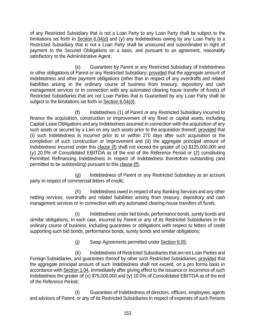 153 of any Restricted Subsidiary that is not a Loan Party to any Loan Party shall be subject to the limitations set forth in Section 6.04(d) and (y) any Indebtedness owing by any Loan Party to a Restricted Subsidiary that is not a Loan Party shall be unsecured and subordinated in right of payment to the Secured Obligations on a basis, and pursuant to an agreement, reasonably satisfactory to the Administrative Agent; (e) Guarantees by Parent or any Restricted Subsidiary of Indebtedness or other obligations of Parent or any Restricted Subsidiary; provided that the aggregate amount of Indebtedness and other payment obligations (other than in respect of any overdrafts and related liabilities arising in the ordinary course of business from treasury, depository and cash management services or in connection with any automated clearing house transfer of funds) of Restricted Subsidiaries that are not Loan Parties that is Guaranteed by any Loan Party shall be subject to the limitations set forth in Section 6.04(d); (f) Indebtedness (1) of Parent or any Restricted Subsidiary incurred to finance the acquisition, construction or improvement of any fixed or capital assets, including Capital Lease Obligations and any Indebtedness assumed in connection with the acquisition of any such assets or secured by a Lien on any such assets prior to the acquisition thereof; provided that (i) such Indebtedness is incurred prior to or within 270 days after such acquisition or the completion of such construction or improvement and (ii) the aggregate principal amount of Indebtedness incurred under this clause (f) shall not exceed the greater of (x) $125,000,000 and (y) 20.0% of Consolidated EBITDA as of the end of the Reference Period or (2) constituting Permitted Refinancing Indebtedness in respect of Indebtedness theretofore outstanding (and permitted to be outstanding) pursuant to this clause (f); (g) Indebtedness of Parent or any Restricted Subsidiary as an account party in respect of commercial letters of credit; (h) Indebtedness owed in respect of any Banking Services and any other netting services, overdrafts and related liabilities arising from treasury, depository and cash management services or in connection with any automated clearing-house transfers of funds; (i) Indebtedness under bid bonds, performance bonds, surety bonds and similar obligations, in each case, incurred by Parent or any of its Restricted Subsidiaries in the ordinary course of business, including guarantees or obligations with respect to letters of credit supporting such bid bonds, performance bonds, surety bonds and similar obligations; (j) Swap Agreements permitted under Section 6.05; (k) Indebtedness of Restricted Subsidiaries that are not Loan Parties and Foreign Subsidiaries, and guarantees thereof by other such Restricted Subsidiaries; provided that the aggregate principal amount of such Indebtedness shall not exceed, on a pro forma basis in accordance with Section 1.04, immediately after giving effect to the issuance or incurrence of such Indebtedness the greater of (x) $75,000,000 and (y) 10.0% of Consolidated EBITDA as of the end of the Reference Period; (l) Guarantees of Indebtedness of directors, officers, employees, agents and advisors of Parent, or any of its Restricted Subsidiaries in respect of expenses of such Persons