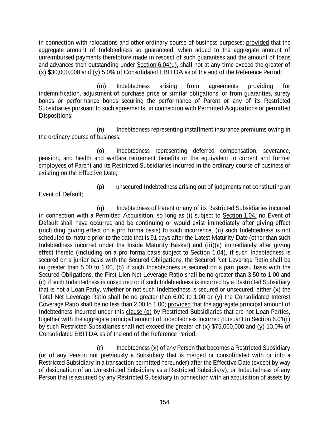 154 in connection with relocations and other ordinary course of business purposes; provided that the aggregate amount of Indebtedness so guaranteed, when added to the aggregate amount of unreimbursed payments theretofore made in respect of such guarantees and the amount of loans and advances then outstanding under Section 6.04(u), shall not at any time exceed the greater of (x) $30,000,000 and (y) 5.0% of Consolidated EBITDA as of the end of the Reference Period; (m) Indebtedness arising from agreements providing for indemnification, adjustment of purchase price or similar obligations, or from guaranties, surety bonds or performance bonds securing the performance of Parent or any of its Restricted Subsidiaries pursuant to such agreements, in connection with Permitted Acquisitions or permitted Dispositions; (n) Indebtedness representing installment insurance premiums owing in the ordinary course of business; (o) Indebtedness representing deferred compensation, severance, pension, and health and welfare retirement benefits or the equivalent to current and former employees of Parent and its Restricted Subsidiaries incurred in the ordinary course of business or existing on the Effective Date; (p) unsecured Indebtedness arising out of judgments not constituting an Event of Default; (q) Indebtedness of Parent or any of its Restricted Subsidiaries incurred in connection with a Permitted Acquisition, so long as (i) subject to Section 1.04, no Event of Default shall have occurred and be continuing or would exist immediately after giving effect (including giving effect on a pro forma basis) to such incurrence, (ii) such Indebtedness is not scheduled to mature prior to the date that is 91 days after the Latest Maturity Date (other than such Indebtedness incurred under the Inside Maturity Basket) and (iii)(a) immediately after giving effect thereto (including on a pro forma basis subject to Section 1.04), if such Indebtedness is secured on a junior basis with the Secured Obligations, the Secured Net Leverage Ratio shall be no greater than 5.00 to 1.00, (b) if such Indebtedness is secured on a pari passu basis with the Secured Obligations, the First Lien Net Leverage Ratio shall be no greater than 3.50 to 1.00 and (c) if such Indebtedness is unsecured or if such Indebtedness is incurred by a Restricted Subsidiary that is not a Loan Party, whether or not such Indebtedness is secured or unsecured, either (x) the Total Net Leverage Ratio shall be no greater than 6.00 to 1.00 or (y) the Consolidated Interest Coverage Ratio shall be no less than 2.00 to 1.00; provided that the aggregate principal amount of Indebtedness incurred under this clause (q) by Restricted Subsidiaries that are not Loan Parties, together with the aggregate principal amount of Indebtedness incurred pursuant to Section 6.01(r) by such Restricted Subsidiaries shall not exceed the greater of (x) $75,000,000 and (y) 10.0% of Consolidated EBITDA as of the end of the Reference Period; (r) Indebtedness (x) of any Person that becomes a Restricted Subsidiary (or of any Person not previously a Subsidiary that is merged or consolidated with or into a Restricted Subsidiary in a transaction permitted hereunder) after the Effective Date (except by way of designation of an Unrestricted Subsidiary as a Restricted Subsidiary), or Indebtedness of any Person that is assumed by any Restricted Subsidiary in connection with an acquisition of assets by