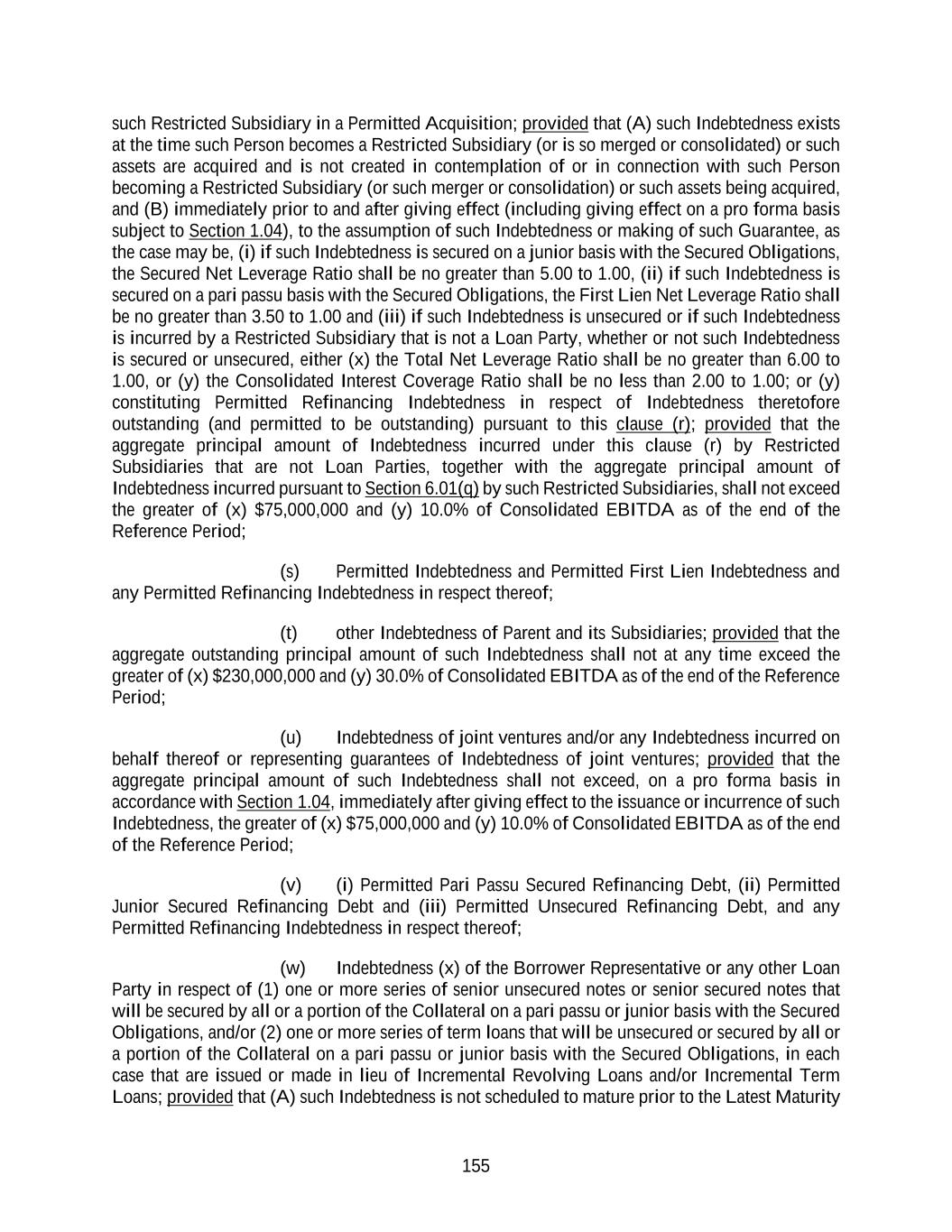 155 such Restricted Subsidiary in a Permitted Acquisition; provided that (A) such Indebtedness exists at the time such Person becomes a Restricted Subsidiary (or is so merged or consolidated) or such assets are acquired and is not created in contemplation of or in connection with such Person becoming a Restricted Subsidiary (or such merger or consolidation) or such assets being acquired, and (B) immediately prior to and after giving effect (including giving effect on a pro forma basis subject to Section 1.04), to the assumption of such Indebtedness or making of such Guarantee, as the case may be, (i) if such Indebtedness is secured on a junior basis with the Secured Obligations, the Secured Net Leverage Ratio shall be no greater than 5.00 to 1.00, (ii) if such Indebtedness is secured on a pari passu basis with the Secured Obligations, the First Lien Net Leverage Ratio shall be no greater than 3.50 to 1.00 and (iii) if such Indebtedness is unsecured or if such Indebtedness is incurred by a Restricted Subsidiary that is not a Loan Party, whether or not such Indebtedness is secured or unsecured, either (x) the Total Net Leverage Ratio shall be no greater than 6.00 to 1.00, or (y) the Consolidated Interest Coverage Ratio shall be no less than 2.00 to 1.00; or (y) constituting Permitted Refinancing Indebtedness in respect of Indebtedness theretofore outstanding (and permitted to be outstanding) pursuant to this clause (r); provided that the aggregate principal amount of Indebtedness incurred under this clause (r) by Restricted Subsidiaries that are not Loan Parties, together with the aggregate principal amount of Indebtedness incurred pursuant to Section 6.01(q) by such Restricted Subsidiaries, shall not exceed the greater of (x) $75,000,000 and (y) 10.0% of Consolidated EBITDA as of the end of the Reference Period; (s) Permitted Indebtedness and Permitted First Lien Indebtedness and any Permitted Refinancing Indebtedness in respect thereof; (t) other Indebtedness of Parent and its Subsidiaries; provided that the aggregate outstanding principal amount of such Indebtedness shall not at any time exceed the greater of (x) $230,000,000 and (y) 30.0% of Consolidated EBITDA as of the end of the Reference Period; (u) Indebtedness of joint ventures and/or any Indebtedness incurred on behalf thereof or representing guarantees of Indebtedness of joint ventures; provided that the aggregate principal amount of such Indebtedness shall not exceed, on a pro forma basis in accordance with Section 1.04, immediately after giving effect to the issuance or incurrence of such Indebtedness, the greater of (x) $75,000,000 and (y) 10.0% of Consolidated EBITDA as of the end of the Reference Period; (v) (i) Permitted Pari Passu Secured Refinancing Debt, (ii) Permitted Junior Secured Refinancing Debt and (iii) Permitted Unsecured Refinancing Debt, and any Permitted Refinancing Indebtedness in respect thereof; (w) Indebtedness (x) of the Borrower Representative or any other Loan Party in respect of (1) one or more series of senior unsecured notes or senior secured notes that will be secured by all or a portion of the Collateral on a pari passu or junior basis with the Secured Obligations, and/or (2) one or more series of term loans that will be unsecured or secured by all or a portion of the Collateral on a pari passu or junior basis with the Secured Obligations, in each case that are issued or made in lieu of Incremental Revolving Loans and/or Incremental Term Loans; provided that (A) such Indebtedness is not scheduled to mature prior to the Latest Maturity