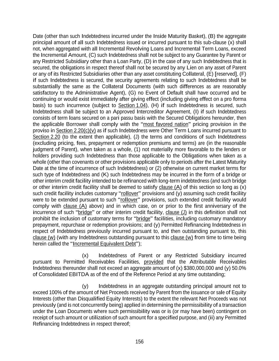 156 Date (other than such Indebtedness incurred under the Inside Maturity Basket), (B) the aggregate principal amount of all such Indebtedness issued or incurred pursuant to this sub-clause (x) shall not, when aggregated with all Incremental Revolving Loans and Incremental Term Loans, exceed the Incremental Amount, (C) such Indebtedness shall not be subject to any Guarantee by Parent or any Restricted Subsidiary other than a Loan Party, (D) in the case of any such Indebtedness that is secured, the obligations in respect thereof shall not be secured by any Lien on any asset of Parent or any of its Restricted Subsidiaries other than any asset constituting Collateral, (E) [reserved], (F) if such Indebtedness is secured, the security agreements relating to such Indebtedness shall be substantially the same as the Collateral Documents (with such differences as are reasonably satisfactory to the Administrative Agent), (G) no Event of Default shall have occurred and be continuing or would exist immediately after giving effect (including giving effect on a pro forma basis) to such incurrence (subject to Section 1.04), (H) if such Indebtedness is secured, such Indebtedness shall be subject to an Approved Intercreditor Agreement, (I) if such Indebtedness consists of term loans secured on a pari passu basis with the Secured Obligations hereunder, then the applicable Borrower shall comply with the “most favored nation” pricing provision in the proviso in Section 2.20(c)(v) as if such Indebtedness were Other Term Loans incurred pursuant to Section 2.20 (to the extent then applicable), (J) the terms and conditions of such Indebtedness (excluding pricing, fees, prepayment or redemption premiums and terms) are (in the reasonable judgment of Parent), when taken as a whole, (1) not materially more favorable to the lenders or holders providing such Indebtedness than those applicable to the Obligations when taken as a whole (other than covenants or other provisions applicable only to periods after the Latest Maturity Date at the time of incurrence of such Indebtedness) or (2) otherwise on current market terms for such type of Indebtedness and (K) such Indebtedness may be incurred in the form of a bridge or other interim credit facility intended to be refinanced with long-term indebtedness (and such bridge or other interim credit facility shall be deemed to satisfy clause (A) of this section so long as (x) such credit facility includes customary “rollover” provisions and (y) assuming such credit facility were to be extended pursuant to such “rollover” provisions, such extended credit facility would comply with clause (A) above) and in which case, on or prior to the first anniversary of the incurrence of such “bridge” or other interim credit facility, clause (J) in this definition shall not prohibit the inclusion of customary terms for “bridge” facilities, including customary mandatory prepayment, repurchase or redemption provisions; and (y) Permitted Refinancing Indebtedness in respect of Indebtedness previously incurred pursuant to, and then outstanding pursuant to, this clause (w) (with any Indebtedness outstanding pursuant to this clause (w) from time to time being herein called the “Incremental Equivalent Debt”); (x) Indebtedness of Parent or any Restricted Subsidiary incurred pursuant to Permitted Receivables Facilities, provided that the Attributable Receivables Indebtedness thereunder shall not exceed an aggregate amount of (x) $380,000,000 and (y) 50.0% of Consolidated EBITDA as of the end of the Reference Period at any time outstanding; (y) Indebtedness in an aggregate outstanding principal amount not to exceed 100% of the amount of Net Proceeds received by Parent from the issuance or sale of Equity Interests (other than Disqualified Equity Interests) to the extent the relevant Net Proceeds was not previously (and is not concurrently being) applied in determining the permissibility of a transaction under the Loan Documents where such permissibility was or is (or may have been) contingent on receipt of such amount or utilization of such amount for a specified purpose, and (ii) any Permitted Refinancing Indebtedness in respect thereof;