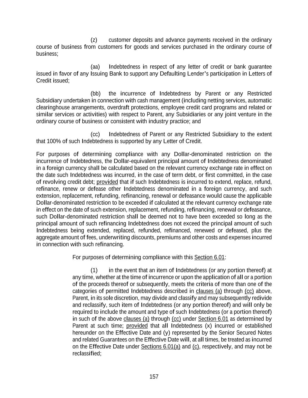 157 (z) customer deposits and advance payments received in the ordinary course of business from customers for goods and services purchased in the ordinary course of business; (aa) Indebtedness in respect of any letter of credit or bank guarantee issued in favor of any Issuing Bank to support any Defaulting Lender’s participation in Letters of Credit issued; (bb) the incurrence of Indebtedness by Parent or any Restricted Subsidiary undertaken in connection with cash management (including netting services, automatic clearinghouse arrangements, overdraft protections, employee credit card programs and related or similar services or activities) with respect to Parent, any Subsidiaries or any joint venture in the ordinary course of business or consistent with industry practice; and (cc) Indebtedness of Parent or any Restricted Subsidiary to the extent that 100% of such Indebtedness is supported by any Letter of Credit. For purposes of determining compliance with any Dollar-denominated restriction on the incurrence of Indebtedness, the Dollar-equivalent principal amount of Indebtedness denominated in a foreign currency shall be calculated based on the relevant currency exchange rate in effect on the date such Indebtedness was incurred, in the case of term debt, or first committed, in the case of revolving credit debt; provided that if such Indebtedness is incurred to extend, replace, refund, refinance, renew or defease other Indebtedness denominated in a foreign currency, and such extension, replacement, refunding, refinancing, renewal or defeasance would cause the applicable Dollar-denominated restriction to be exceeded if calculated at the relevant currency exchange rate in effect on the date of such extension, replacement, refunding, refinancing, renewal or defeasance, such Dollar-denominated restriction shall be deemed not to have been exceeded so long as the principal amount of such refinancing Indebtedness does not exceed the principal amount of such Indebtedness being extended, replaced, refunded, refinanced, renewed or defeased, plus the aggregate amount of fees, underwriting discounts, premiums and other costs and expenses incurred in connection with such refinancing. For purposes of determining compliance with this Section 6.01: (1) in the event that an item of Indebtedness (or any portion thereof) at any time, whether at the time of incurrence or upon the application of all or a portion of the proceeds thereof or subsequently, meets the criteria of more than one of the categories of permitted Indebtedness described in clauses (a) through (cc) above, Parent, in its sole discretion, may divide and classify and may subsequently redivide and reclassify, such item of Indebtedness (or any portion thereof) and will only be required to include the amount and type of such Indebtedness (or a portion thereof) in such of the above clauses (a) through (cc) under Section 6.01 as determined by Parent at such time; provided that all Indebtedness (x) incurred or established hereunder on the Effective Date and (y) represented by the Senior Secured Notes and related Guarantees on the Effective Date will, at all times, be treated as incurred on the Effective Date under Sections 6.01(a) and (c), respectively, and may not be reclassified;