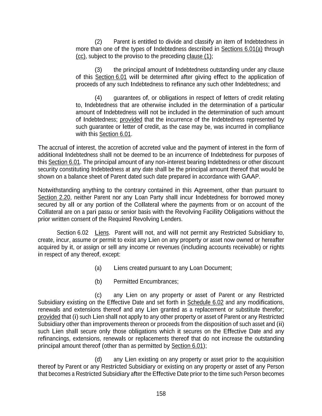 158 (2) Parent is entitled to divide and classify an item of Indebtedness in more than one of the types of Indebtedness described in Sections 6.01(a) through (cc), subject to the proviso to the preceding clause (1); (3) the principal amount of Indebtedness outstanding under any clause of this Section 6.01 will be determined after giving effect to the application of proceeds of any such Indebtedness to refinance any such other Indebtedness; and (4) guarantees of, or obligations in respect of letters of credit relating to, Indebtedness that are otherwise included in the determination of a particular amount of Indebtedness will not be included in the determination of such amount of Indebtedness; provided that the incurrence of the Indebtedness represented by such guarantee or letter of credit, as the case may be, was incurred in compliance with this Section 6.01. The accrual of interest, the accretion of accreted value and the payment of interest in the form of additional Indebtedness shall not be deemed to be an incurrence of Indebtedness for purposes of this Section 6.01. The principal amount of any non-interest bearing Indebtedness or other discount security constituting Indebtedness at any date shall be the principal amount thereof that would be shown on a balance sheet of Parent dated such date prepared in accordance with GAAP. Notwithstanding anything to the contrary contained in this Agreement, other than pursuant to Section 2.20, neither Parent nor any Loan Party shall incur Indebtedness for borrowed money secured by all or any portion of the Collateral where the payments from or on account of the Collateral are on a pari passu or senior basis with the Revolving Facility Obligations without the prior written consent of the Required Revolving Lenders. Section 6.02 Liens. Parent will not, and will not permit any Restricted Subsidiary to, create, incur, assume or permit to exist any Lien on any property or asset now owned or hereafter acquired by it, or assign or sell any income or revenues (including accounts receivable) or rights in respect of any thereof, except: (a) Liens created pursuant to any Loan Document; (b) Permitted Encumbrances; (c) any Lien on any property or asset of Parent or any Restricted Subsidiary existing on the Effective Date and set forth in Schedule 6.02 and any modifications, renewals and extensions thereof and any Lien granted as a replacement or substitute therefor; provided that (i) such Lien shall not apply to any other property or asset of Parent or any Restricted Subsidiary other than improvements thereon or proceeds from the disposition of such asset and (ii) such Lien shall secure only those obligations which it secures on the Effective Date and any refinancings, extensions, renewals or replacements thereof that do not increase the outstanding principal amount thereof (other than as permitted by Section 6.01); (d) any Lien existing on any property or asset prior to the acquisition thereof by Parent or any Restricted Subsidiary or existing on any property or asset of any Person that becomes a Restricted Subsidiary after the Effective Date prior to the time such Person becomes