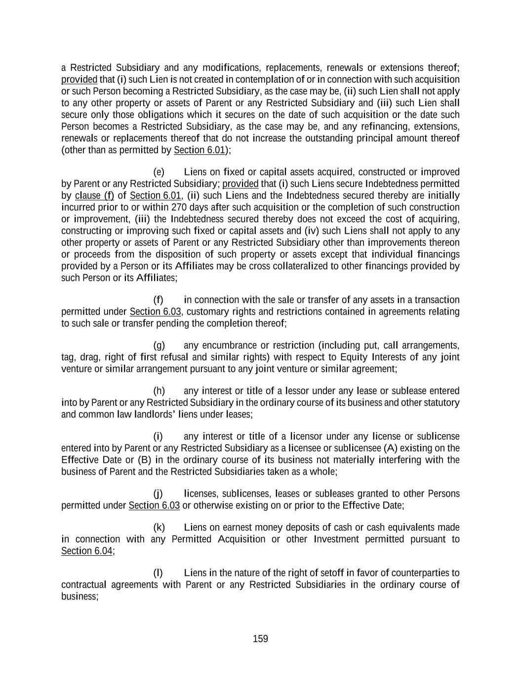 159 a Restricted Subsidiary and any modifications, replacements, renewals or extensions thereof; provided that (i) such Lien is not created in contemplation of or in connection with such acquisition or such Person becoming a Restricted Subsidiary, as the case may be, (ii) such Lien shall not apply to any other property or assets of Parent or any Restricted Subsidiary and (iii) such Lien shall secure only those obligations which it secures on the date of such acquisition or the date such Person becomes a Restricted Subsidiary, as the case may be, and any refinancing, extensions, renewals or replacements thereof that do not increase the outstanding principal amount thereof (other than as permitted by Section 6.01); (e) Liens on fixed or capital assets acquired, constructed or improved by Parent or any Restricted Subsidiary; provided that (i) such Liens secure Indebtedness permitted by clause (f) of Section 6.01, (ii) such Liens and the Indebtedness secured thereby are initially incurred prior to or within 270 days after such acquisition or the completion of such construction or improvement, (iii) the Indebtedness secured thereby does not exceed the cost of acquiring, constructing or improving such fixed or capital assets and (iv) such Liens shall not apply to any other property or assets of Parent or any Restricted Subsidiary other than improvements thereon or proceeds from the disposition of such property or assets except that individual financings provided by a Person or its Affiliates may be cross collateralized to other financings provided by such Person or its Affiliates; (f) in connection with the sale or transfer of any assets in a transaction permitted under Section 6.03, customary rights and restrictions contained in agreements relating to such sale or transfer pending the completion thereof; (g) any encumbrance or restriction (including put, call arrangements, tag, drag, right of first refusal and similar rights) with respect to Equity Interests of any joint venture or similar arrangement pursuant to any joint venture or similar agreement; (h) any interest or title of a lessor under any lease or sublease entered into by Parent or any Restricted Subsidiary in the ordinary course of its business and other statutory and common law landlords’ liens under leases; (i) any interest or title of a licensor under any license or sublicense entered into by Parent or any Restricted Subsidiary as a licensee or sublicensee (A) existing on the Effective Date or (B) in the ordinary course of its business not materially interfering with the business of Parent and the Restricted Subsidiaries taken as a whole; (j) licenses, sublicenses, leases or subleases granted to other Persons permitted under Section 6.03 or otherwise existing on or prior to the Effective Date; (k) Liens on earnest money deposits of cash or cash equivalents made in connection with any Permitted Acquisition or other Investment permitted pursuant to Section 6.04; (l) Liens in the nature of the right of setoff in favor of counterparties to contractual agreements with Parent or any Restricted Subsidiaries in the ordinary course of business;