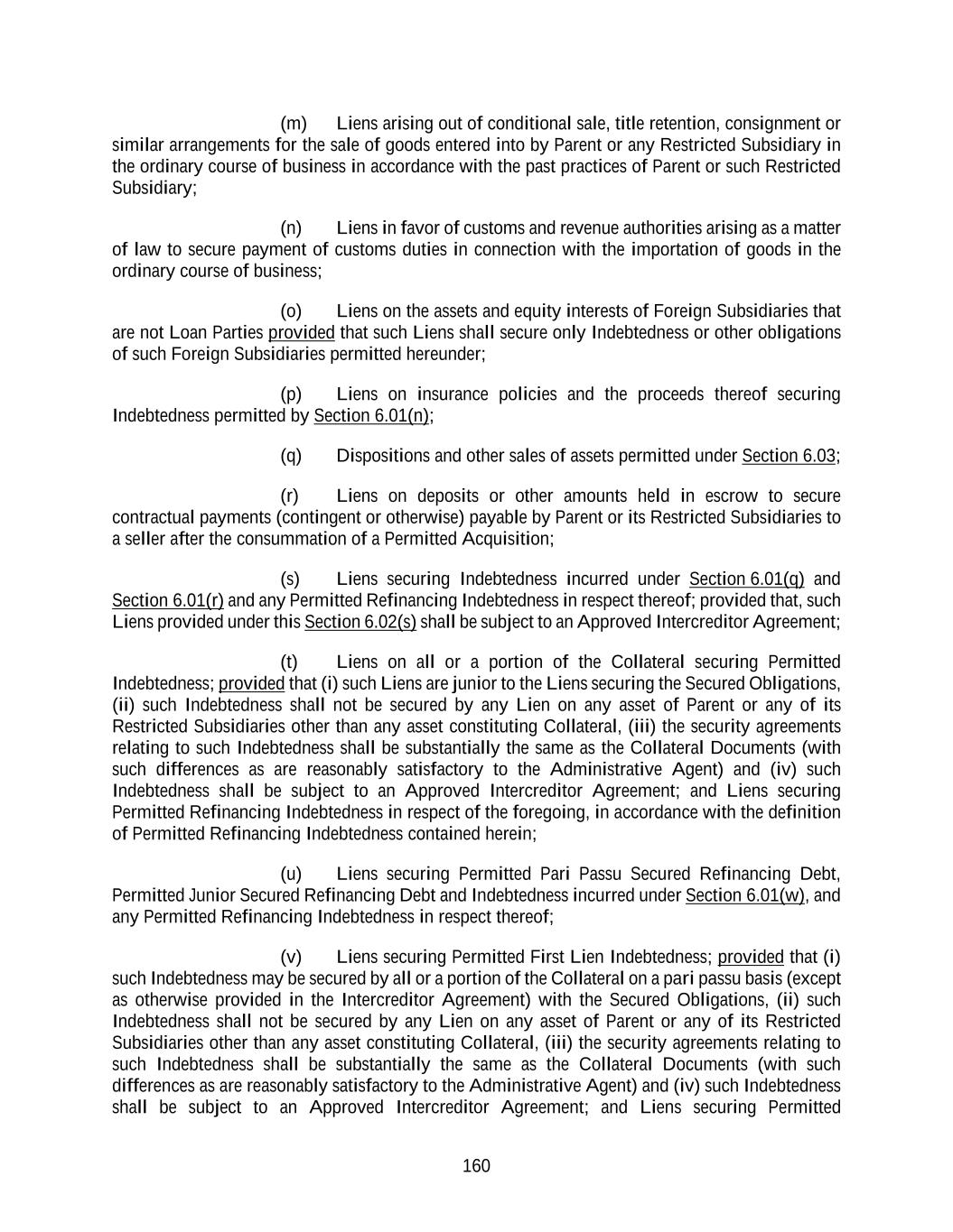 160 (m) Liens arising out of conditional sale, title retention, consignment or similar arrangements for the sale of goods entered into by Parent or any Restricted Subsidiary in the ordinary course of business in accordance with the past practices of Parent or such Restricted Subsidiary; (n) Liens in favor of customs and revenue authorities arising as a matter of law to secure payment of customs duties in connection with the importation of goods in the ordinary course of business; (o) Liens on the assets and equity interests of Foreign Subsidiaries that are not Loan Parties provided that such Liens shall secure only Indebtedness or other obligations of such Foreign Subsidiaries permitted hereunder; (p) Liens on insurance policies and the proceeds thereof securing Indebtedness permitted by Section 6.01(n); (q) Dispositions and other sales of assets permitted under Section 6.03; (r) Liens on deposits or other amounts held in escrow to secure contractual payments (contingent or otherwise) payable by Parent or its Restricted Subsidiaries to a seller after the consummation of a Permitted Acquisition; (s) Liens securing Indebtedness incurred under Section 6.01(q) and Section 6.01(r) and any Permitted Refinancing Indebtedness in respect thereof; provided that, such Liens provided under this Section 6.02(s) shall be subject to an Approved Intercreditor Agreement; (t) Liens on all or a portion of the Collateral securing Permitted Indebtedness; provided that (i) such Liens are junior to the Liens securing the Secured Obligations, (ii) such Indebtedness shall not be secured by any Lien on any asset of Parent or any of its Restricted Subsidiaries other than any asset constituting Collateral, (iii) the security agreements relating to such Indebtedness shall be substantially the same as the Collateral Documents (with such differences as are reasonably satisfactory to the Administrative Agent) and (iv) such Indebtedness shall be subject to an Approved Intercreditor Agreement; and Liens securing Permitted Refinancing Indebtedness in respect of the foregoing, in accordance with the definition of Permitted Refinancing Indebtedness contained herein; (u) Liens securing Permitted Pari Passu Secured Refinancing Debt, Permitted Junior Secured Refinancing Debt and Indebtedness incurred under Section 6.01(w), and any Permitted Refinancing Indebtedness in respect thereof; (v) Liens securing Permitted First Lien Indebtedness; provided that (i) such Indebtedness may be secured by all or a portion of the Collateral on a pari passu basis (except as otherwise provided in the Intercreditor Agreement) with the Secured Obligations, (ii) such Indebtedness shall not be secured by any Lien on any asset of Parent or any of its Restricted Subsidiaries other than any asset constituting Collateral, (iii) the security agreements relating to such Indebtedness shall be substantially the same as the Collateral Documents (with such differences as are reasonably satisfactory to the Administrative Agent) and (iv) such Indebtedness shall be subject to an Approved Intercreditor Agreement; and Liens securing Permitted