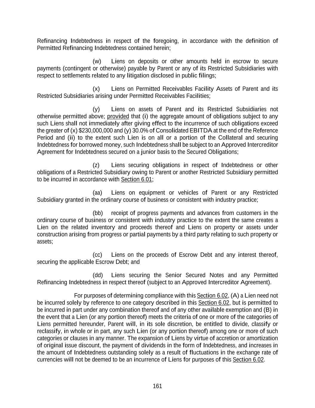 161 Refinancing Indebtedness in respect of the foregoing, in accordance with the definition of Permitted Refinancing Indebtedness contained herein; (w) Liens on deposits or other amounts held in escrow to secure payments (contingent or otherwise) payable by Parent or any of its Restricted Subsidiaries with respect to settlements related to any litigation disclosed in public filings; (x) Liens on Permitted Receivables Facility Assets of Parent and its Restricted Subsidiaries arising under Permitted Receivables Facilities; (y) Liens on assets of Parent and its Restricted Subsidiaries not otherwise permitted above; provided that (i) the aggregate amount of obligations subject to any such Liens shall not immediately after giving effect to the incurrence of such obligations exceed the greater of (x) $230,000,000 and (y) 30.0% of Consolidated EBITDA at the end of the Reference Period and (ii) to the extent such Lien is on all or a portion of the Collateral and securing Indebtedness for borrowed money, such Indebtedness shall be subject to an Approved Intercreditor Agreement for Indebtedness secured on a junior basis to the Secured Obligations; (z) Liens securing obligations in respect of Indebtedness or other obligations of a Restricted Subsidiary owing to Parent or another Restricted Subsidiary permitted to be incurred in accordance with Section 6.01; (aa) Liens on equipment or vehicles of Parent or any Restricted Subsidiary granted in the ordinary course of business or consistent with industry practice; (bb) receipt of progress payments and advances from customers in the ordinary course of business or consistent with industry practice to the extent the same creates a Lien on the related inventory and proceeds thereof and Liens on property or assets under construction arising from progress or partial payments by a third party relating to such property or assets; (cc) Liens on the proceeds of Escrow Debt and any interest thereof, securing the applicable Escrow Debt; and (dd) Liens securing the Senior Secured Notes and any Permitted Refinancing Indebtedness in respect thereof (subject to an Approved Intercreditor Agreement). For purposes of determining compliance with this Section 6.02, (A) a Lien need not be incurred solely by reference to one category described in this Section 6.02, but is permitted to be incurred in part under any combination thereof and of any other available exemption and (B) in the event that a Lien (or any portion thereof) meets the criteria of one or more of the categories of Liens permitted hereunder, Parent will, in its sole discretion, be entitled to divide, classify or reclassify, in whole or in part, any such Lien (or any portion thereof) among one or more of such categories or clauses in any manner. The expansion of Liens by virtue of accretion or amortization of original issue discount, the payment of dividends in the form of Indebtedness, and increases in the amount of Indebtedness outstanding solely as a result of fluctuations in the exchange rate of currencies will not be deemed to be an incurrence of Liens for purposes of this Section 6.02.