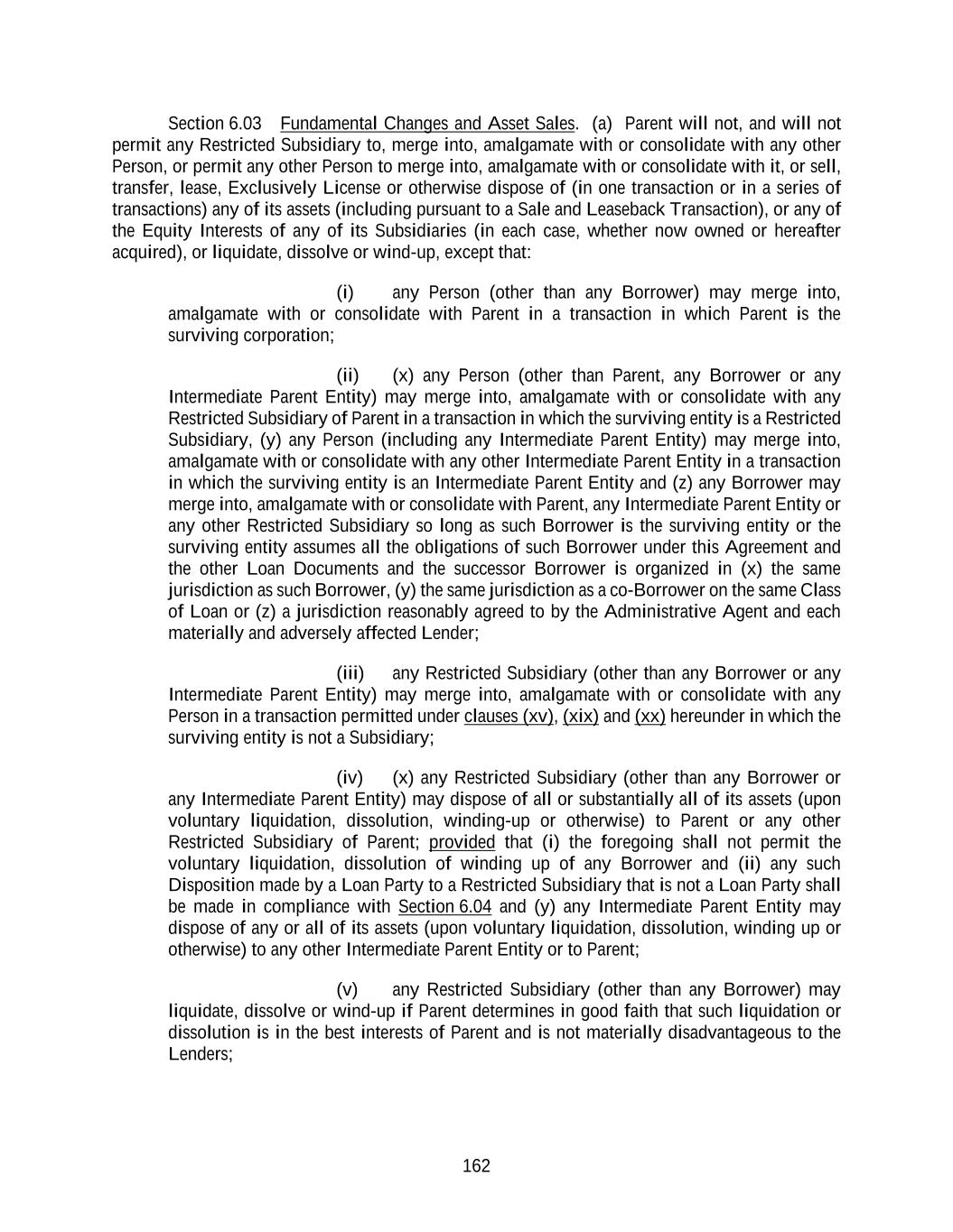 162 Section 6.03 Fundamental Changes and Asset Sales. (a) Parent will not, and will not permit any Restricted Subsidiary to, merge into, amalgamate with or consolidate with any other Person, or permit any other Person to merge into, amalgamate with or consolidate with it, or sell, transfer, lease, Exclusively License or otherwise dispose of (in one transaction or in a series of transactions) any of its assets (including pursuant to a Sale and Leaseback Transaction), or any of the Equity Interests of any of its Subsidiaries (in each case, whether now owned or hereafter acquired), or liquidate, dissolve or wind-up, except that: (i) any Person (other than any Borrower) may merge into, amalgamate with or consolidate with Parent in a transaction in which Parent is the surviving corporation; (ii) (x) any Person (other than Parent, any Borrower or any Intermediate Parent Entity) may merge into, amalgamate with or consolidate with any Restricted Subsidiary of Parent in a transaction in which the surviving entity is a Restricted Subsidiary, (y) any Person (including any Intermediate Parent Entity) may merge into, amalgamate with or consolidate with any other Intermediate Parent Entity in a transaction in which the surviving entity is an Intermediate Parent Entity and (z) any Borrower may merge into, amalgamate with or consolidate with Parent, any Intermediate Parent Entity or any other Restricted Subsidiary so long as such Borrower is the surviving entity or the surviving entity assumes all the obligations of such Borrower under this Agreement and the other Loan Documents and the successor Borrower is organized in (x) the same jurisdiction as such Borrower, (y) the same jurisdiction as a co-Borrower on the same Class of Loan or (z) a jurisdiction reasonably agreed to by the Administrative Agent and each materially and adversely affected Lender; (iii) any Restricted Subsidiary (other than any Borrower or any Intermediate Parent Entity) may merge into, amalgamate with or consolidate with any Person in a transaction permitted under clauses (xv), (xix) and (xx) hereunder in which the surviving entity is not a Subsidiary; (iv) (x) any Restricted Subsidiary (other than any Borrower or any Intermediate Parent Entity) may dispose of all or substantially all of its assets (upon voluntary liquidation, dissolution, winding-up or otherwise) to Parent or any other Restricted Subsidiary of Parent; provided that (i) the foregoing shall not permit the voluntary liquidation, dissolution of winding up of any Borrower and (ii) any such Disposition made by a Loan Party to a Restricted Subsidiary that is not a Loan Party shall be made in compliance with Section 6.04 and (y) any Intermediate Parent Entity may dispose of any or all of its assets (upon voluntary liquidation, dissolution, winding up or otherwise) to any other Intermediate Parent Entity or to Parent; (v) any Restricted Subsidiary (other than any Borrower) may liquidate, dissolve or wind-up if Parent determines in good faith that such liquidation or dissolution is in the best interests of Parent and is not materially disadvantageous to the Lenders;